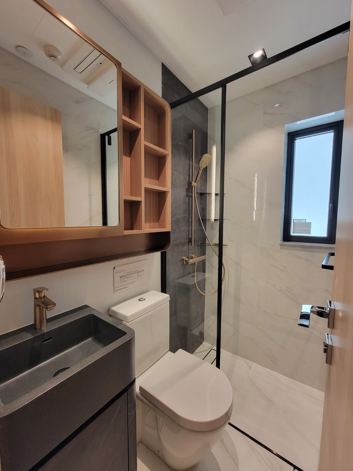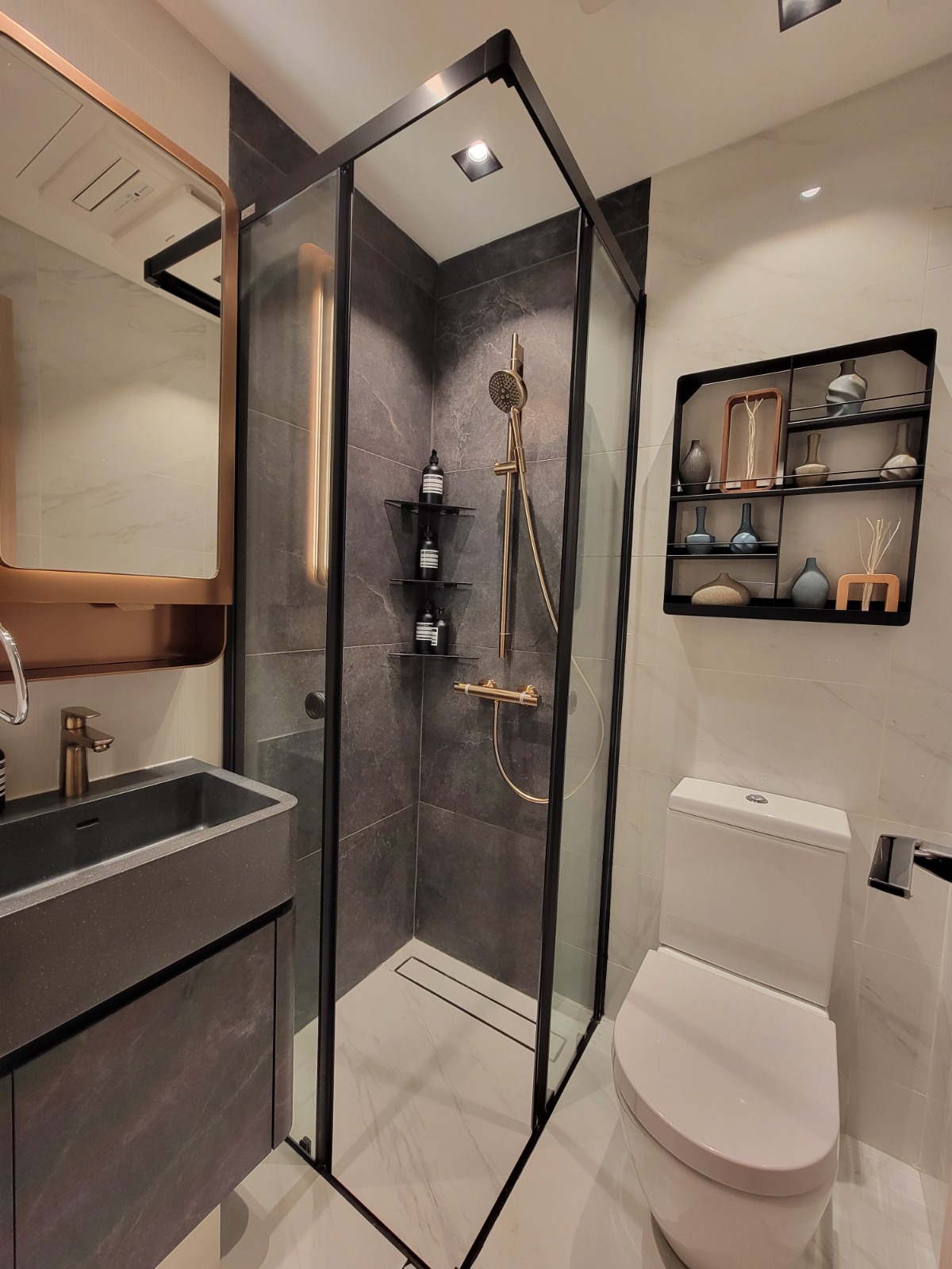 浴室設計簡約奢華,白色暗條子紋牆身襯托銅色鏡櫃及深灰色石紋洗手盤櫃。配備德國Hansgrohe衛浴產品,企缸更採用意大利高級浴屏門,同時以黑白兩款雲石紋磚舖砌牆身,盡顯設計心思,亦配上德國著名品牌Stiebel Eltron電熱水爐及貼心裝設Panasonic Nanoe X浴室寶。