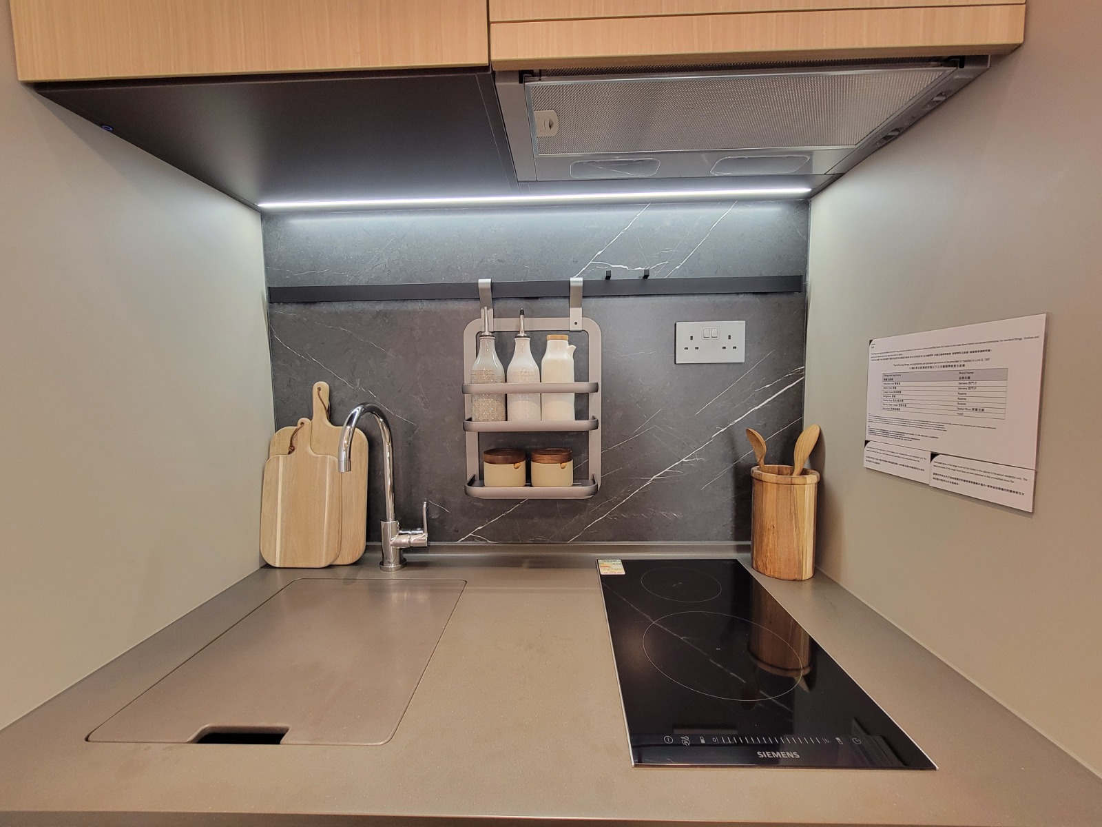 廚房採開放式設計,採用3隻主色調,淺灰拼襯原木及雲石紋枱面,提升格調,高貴而不失玩味;鋅盤亦加設同色系台面板,增加備餐空間。廚櫃內牆特意選用淺灰色磚,配合廚櫃整體淺灰色調。全屋嚴選國際知名家電,包括德國西門子嵌入式電磁爐及嵌入式蒸爐、法國品牌Rosieres雪櫃及洗衣乾衣機。