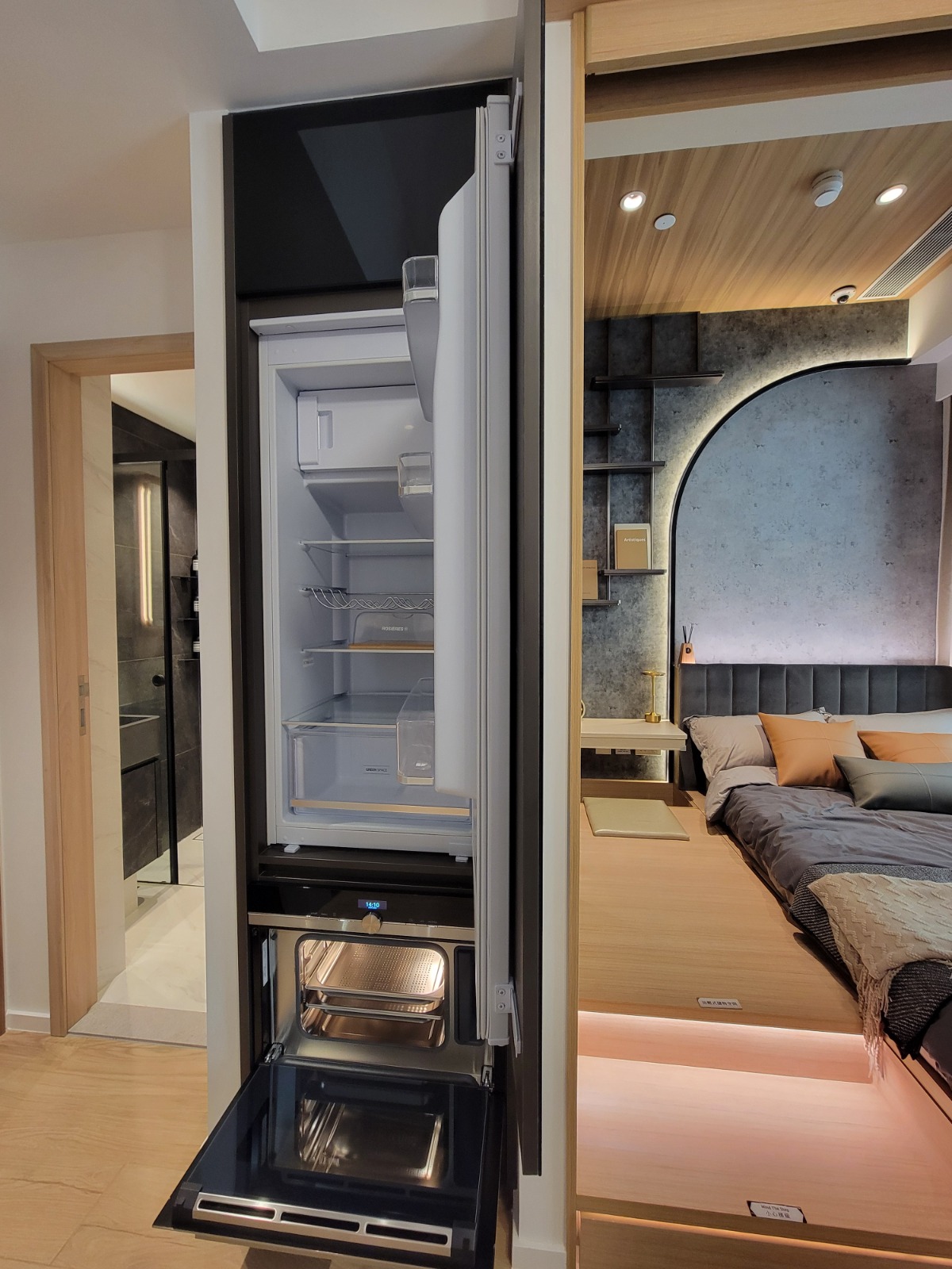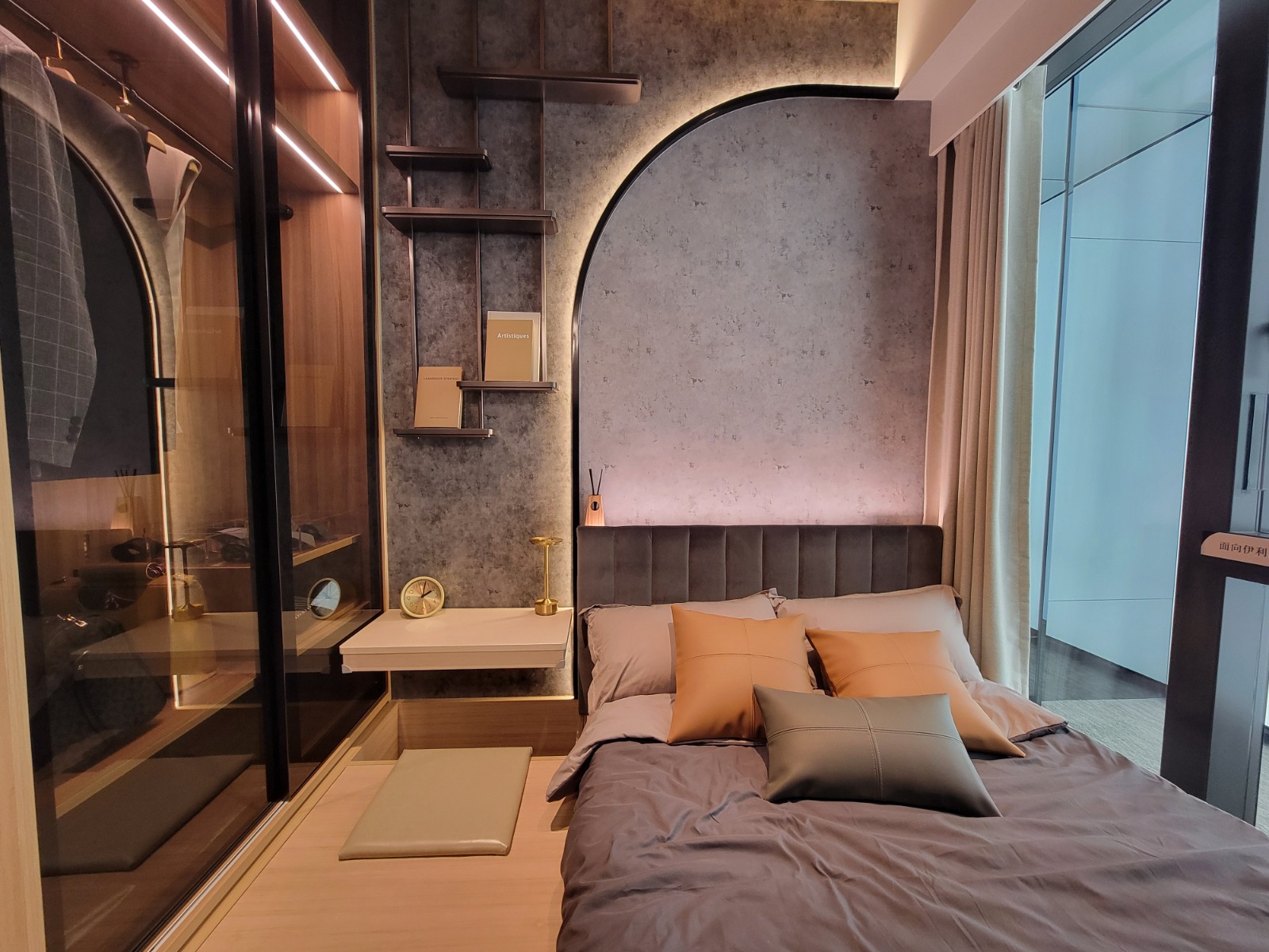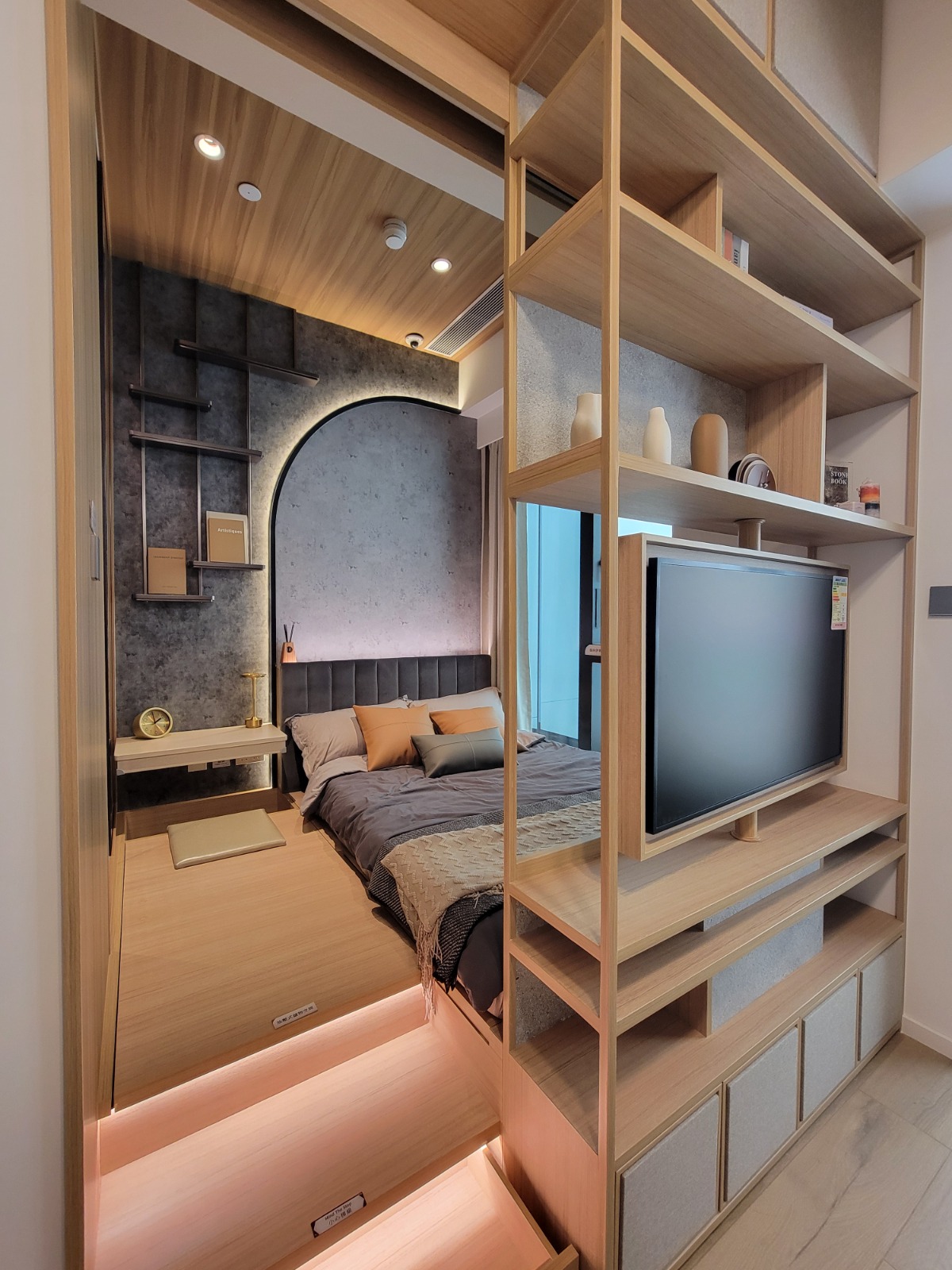 睡房與客廳同向,設有大型玻璃窗,提升採光度;以實用設計為主,油壓地台增加收納空間,床頭亦預留位置放置小物品,並設有插蘇位方便充電及放置小家電;床背部分以灰色飾面設計,配合柔和燈光,時尚型格;天花則用原木色系。床邊設有小書桌及入牆大衣櫃,書桌配以中空設計,方便使用;睡房與客廳之間以木製飾架作間隔,配以可360度旋轉的電視架,廳房均可觀看,增加靈活性。