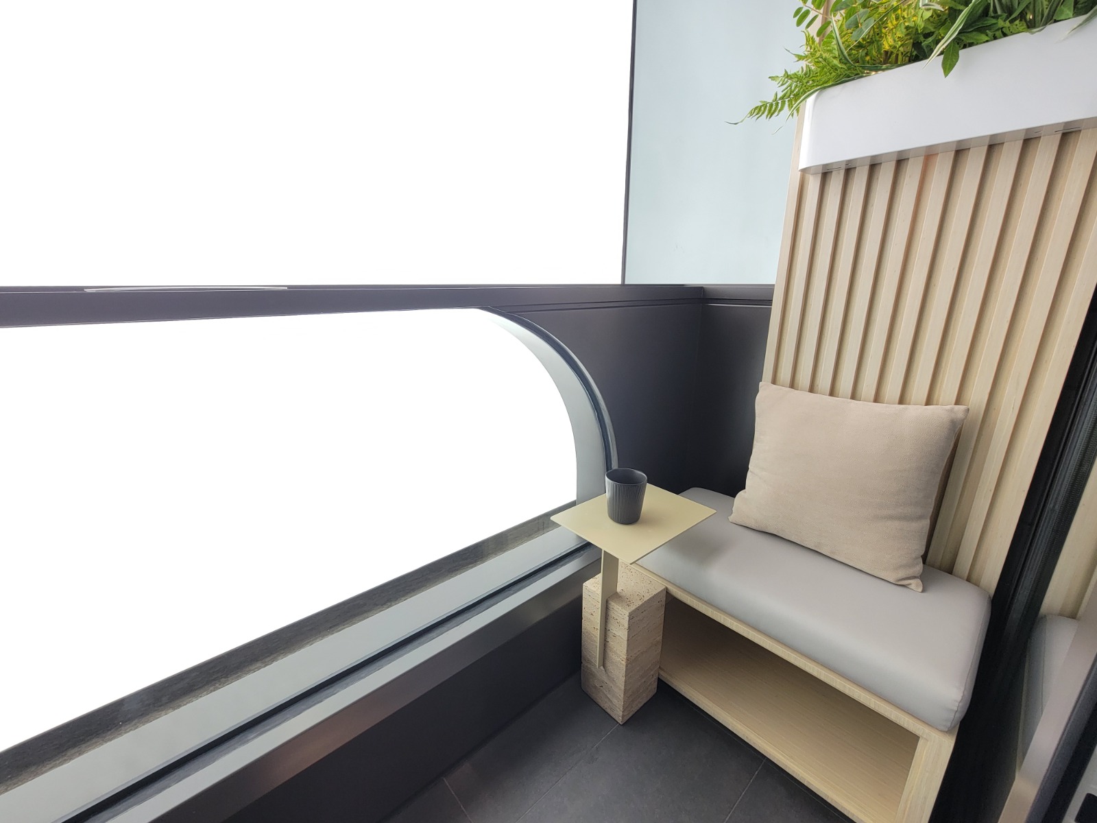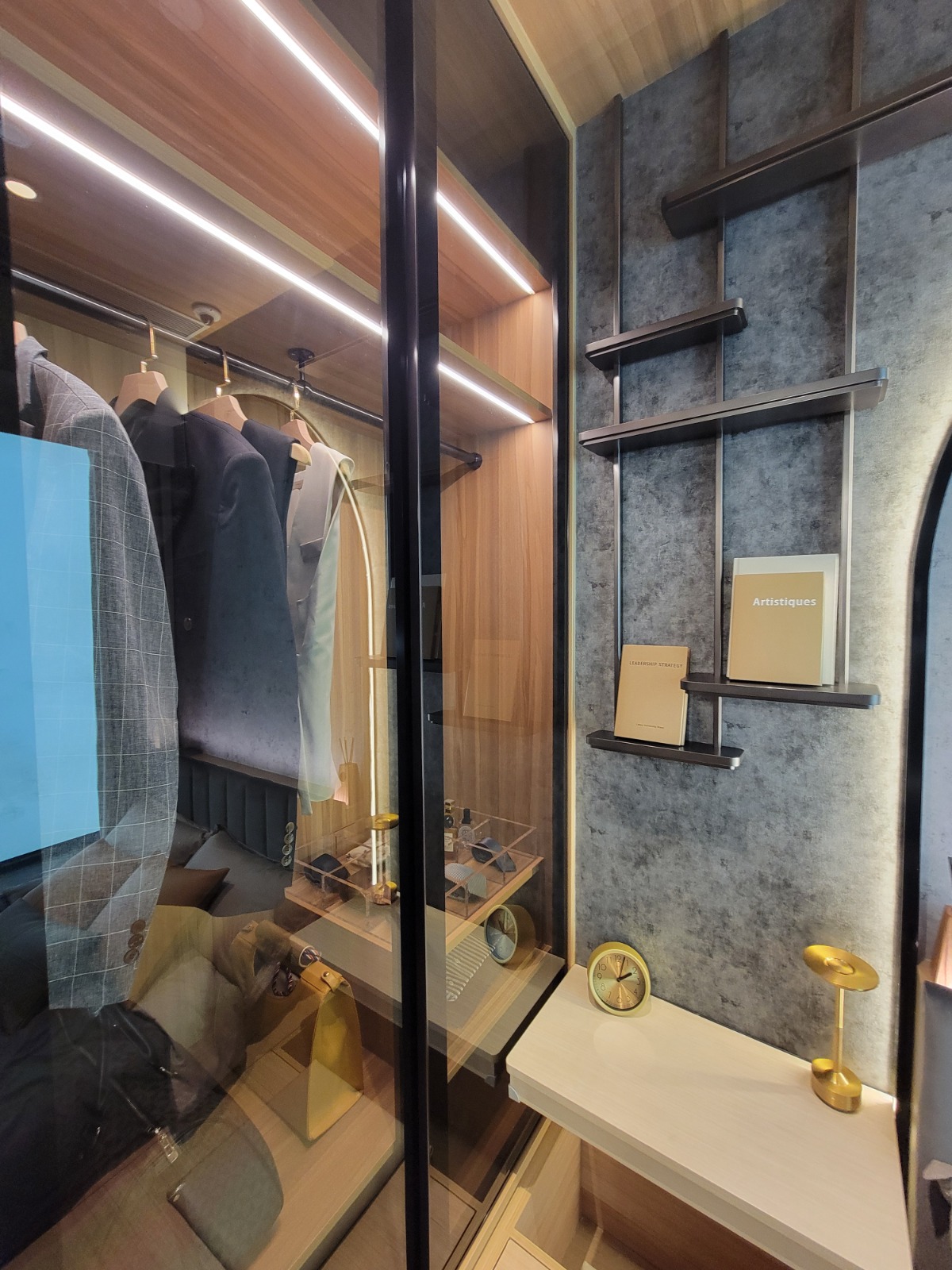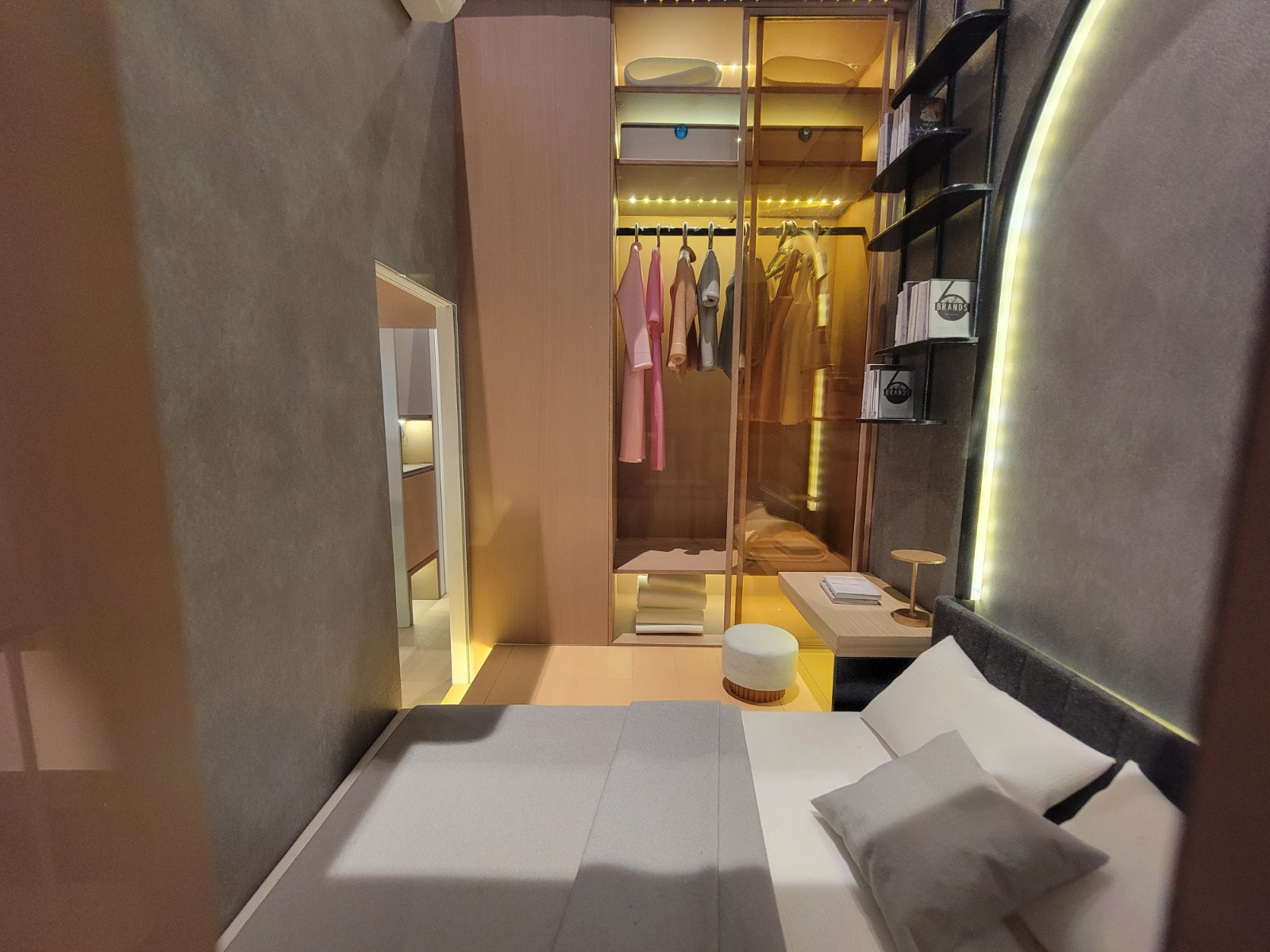 睡房與客廳同向,設有大型玻璃窗,提升採光度;以實用設計為主,油壓地台增加收納空間,床頭亦預留位置放置小物品,並設有插蘇位方便充電及放置小家電;床背部分以灰色飾面設計,配合柔和燈光,時尚型格;天花則用原木色系。床邊設有小書桌及入牆大衣櫃,書桌配以中空設計,方便使用;睡房與客廳之間以木製飾架作間隔,配以可360度旋轉的電視架,廳房均可觀看,增加靈活性。