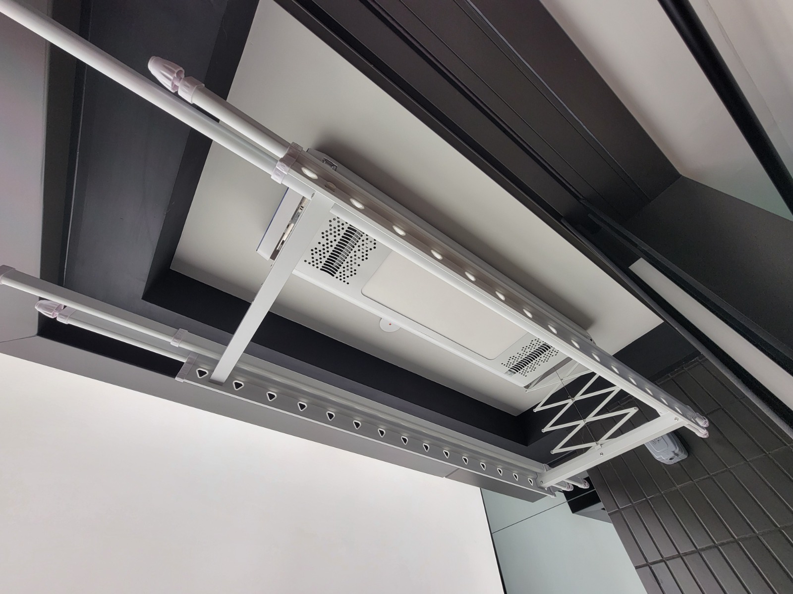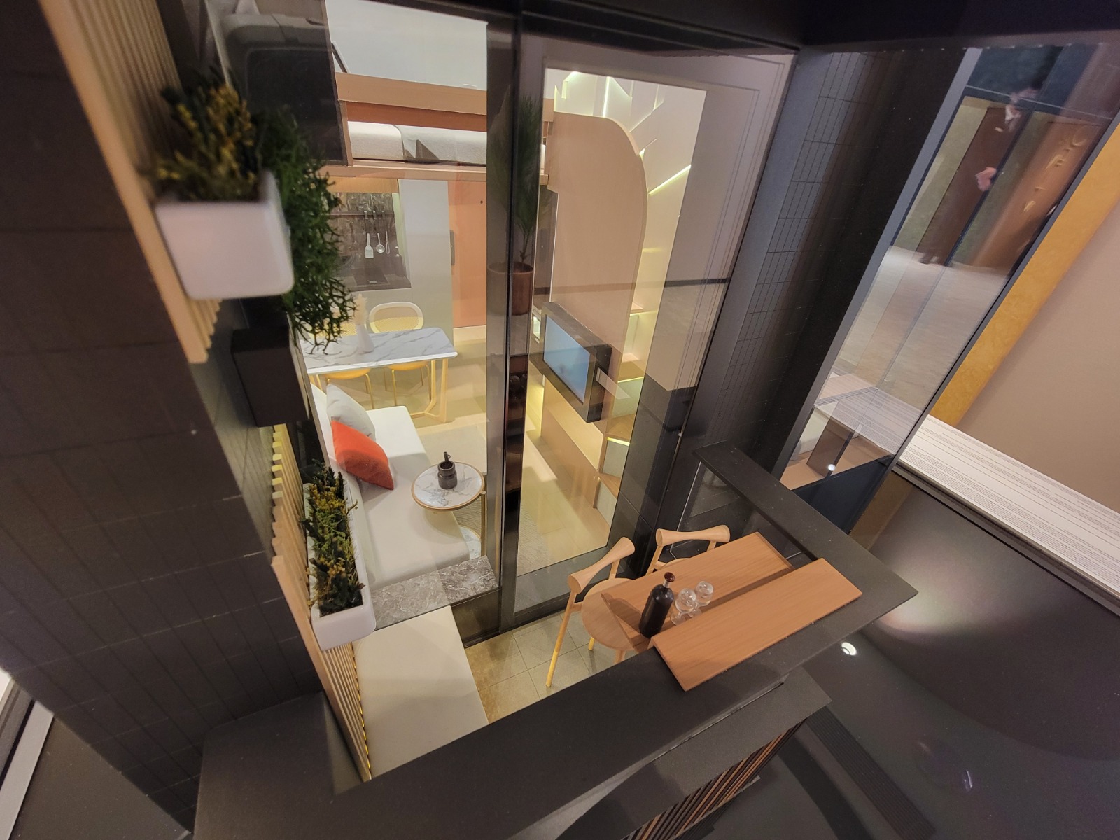 大廳設有特色牆,用燈光分隔客飯廳空間,飯廳擺放方型可延展餐桌,桌面可延長至120厘米,方便朋友聚會時使用。客廳擺放米白色雙人沙發,外連約21方呎露台,配以落地玻璃趟門,地台鋪有深灰色地磚,擺放小坐椅及茶几,配襯壁燈及綠化植物;露台更裝設電子升降晾衣架,美觀且實用。