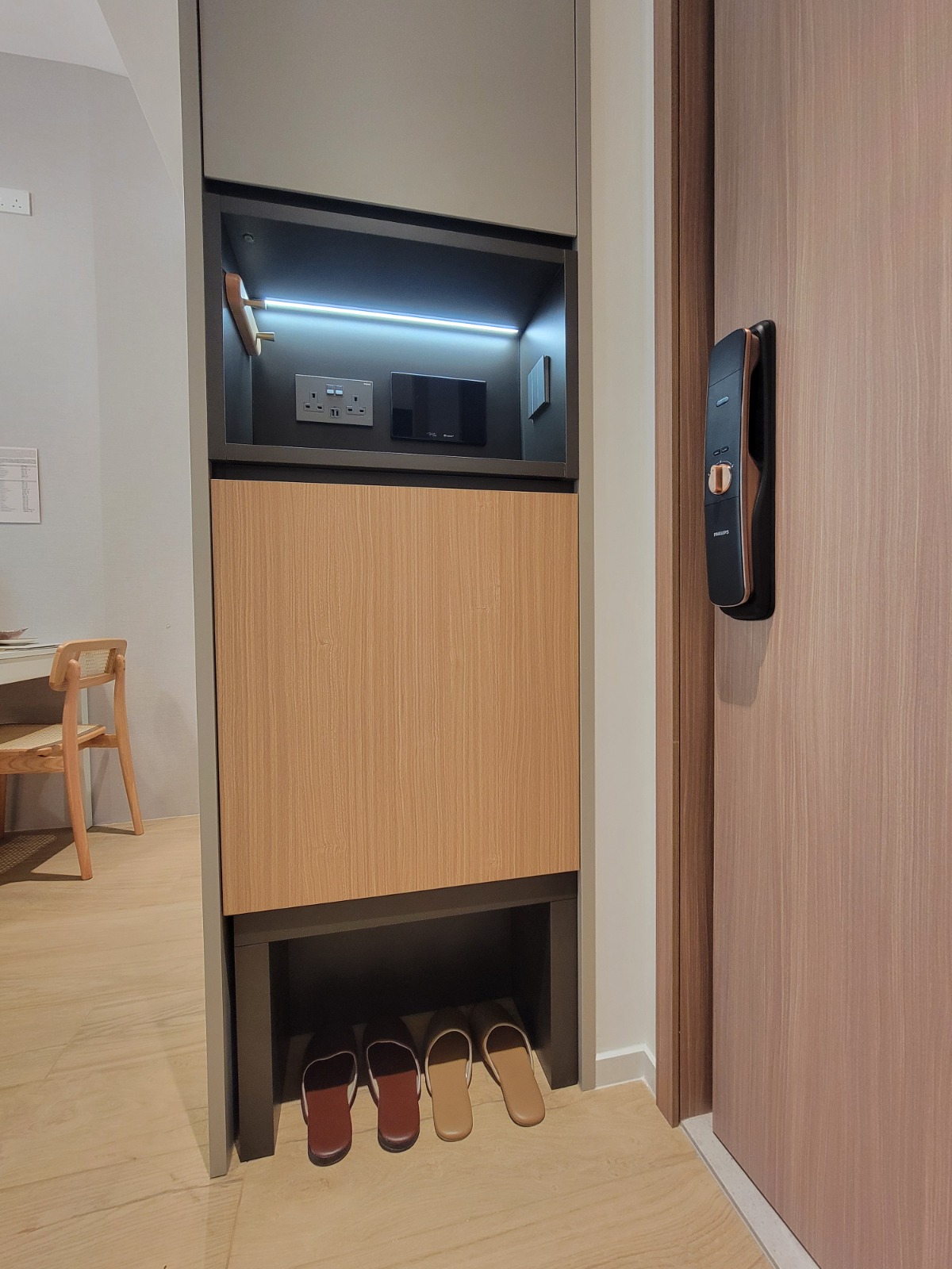 以18樓B室為藍本搭建的有裝修無改動示範單位,實用面積243方呎,一房間隔。客飯廳以長形開則,地面鋪設意大利品牌木紋磚,配襯米白色牆身,一室光潔明亮。大門以原木色條子配襯大自然石材色,有別一般單一色調的大門款式,加上恰當的比例和一體化的到頂設計,令人有眼前一亮的感覺。大門旁設置鞋櫃,更附有隱藏式椅子,貼心方便住戶出門換鞋;而鞋櫃外觀與廚櫃一致,可視作為廚櫃的延伸,增加整體一致性。鞋櫃上方設有電插座,方便為手機等電子設備充電。