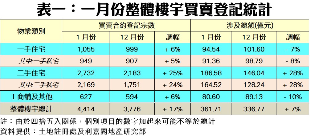 利嘉閣地產研究部主管陳海潮指出,樓市在年底及年初交替下不乏利好消息刺激交投持續向好,帶動整體樓宇買賣實現三連升,惟股市再度大跌及觀望《財政預算案》有否利好樓市舉措,令入市顯得緩慢審慎,加上臨近新春,後市恐暫時喘息回氣。根據土地註冊處數據所得,2024年一月份全港共錄4,414宗樓宇買賣登記(數字主要反映去年十二月中旬至今年一月上旬的樓市實際狀況),較去年十二月份的3,776宗再升17%,連升3個月兼創5個月高位;而月內整體物業登記總值錄得361.71億元,按月也升7%,量值表現雙雙靠穩。