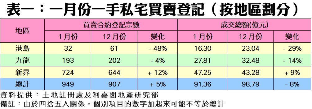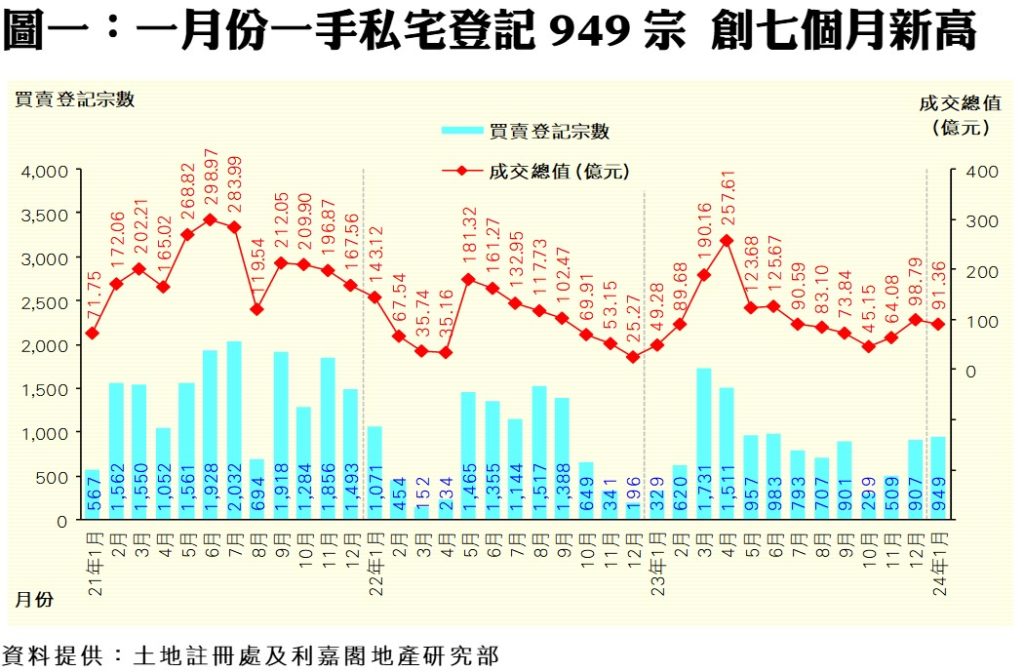 利嘉閣地產研究部主管陳海潮表示,上月股市表現低迷,拖累樓市氣氛,一手推盤轉慢,料一月份的登記旺勢在二月份無以為繼。綜合土地註冊處數據所得,2024年一月全港共錄949宗一手私人住宅買賣登記,較去年十二月的907宗微升5%,連升3個月兼創近7個月新高。一月份登記總值微跌8%,錄得91.36億元,連升2個月後回軟,但仍為近7個月次高。