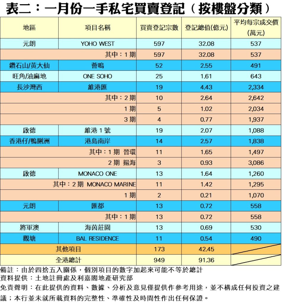 按樓盤分類(見表二),元朗天水圍YOHO WEST 1期於一月份錄得597宗登記,成為月內登記量最旺的一手私宅項目,登記總值達32.08億元,平均每宗登記約537萬元;其次為黃大仙的薈鳴及旺角的ONE SOHO,分別錄得52宗及25宗登記。至於排行榜內上月平均每宗買賣成交價最高者為鴨脷洲揚海的3,086萬元;而觀塘BAL RESIDENCE的490萬元則為較低平均價者。