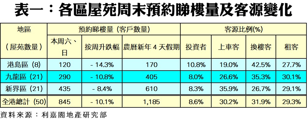 利嘉閣地產研究部主管陳海潮表示,市民於兔年大除夕團圓相聚,一同迎接龍年新春,互相拜訪親友歡度佳節,暫緩置業計劃,二手屋苑預約睇樓量亦因而受壓。根據利嘉閣地產研究部數據估算,全港50個指標屋苑共錄845組客戶於周末預約睇樓,按周減少10.1%,連挫兩周;而農曆新年四天假期則約有1,185組客戶,較去年農曆新年五天的1,535組大減22.8%,交投氣氛除了受新春假期影響外,亦反映市場觀望情緒濃厚,期盼月底的財政預算案會有新措施出台,為本港經濟發展及樓市走勢起標竿作用。