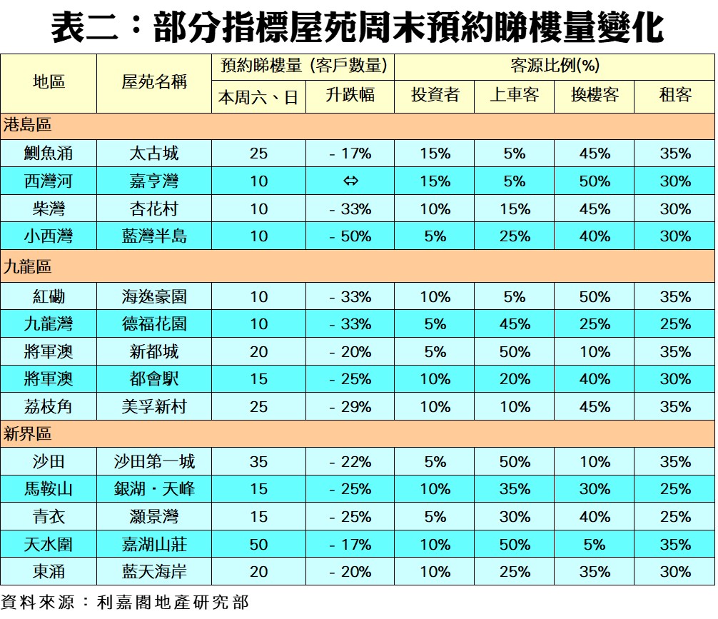 按地區劃分,港島九龍新界三區指標屋苑的周末預約睇樓量全線下挫,其中以港島區的跌幅最大,該區8個指標屋苑於本周末暫錄120組客戶預約睇樓,按周大減14.3%,而四天長假則約有170組客戶。利嘉閣地產藍灣半島分行聯席董事武秉強表示,藍灣半島筍盤在早前被購買力消化後缺乏補充,劈價個案無以為繼,大部分客人在農曆新年期間均選擇暫停睇樓。至於利嘉閣地產杏花村分行聯席董事黃銳平則指,年近歲晚,杏花村人流疏落,加上業主對後市觀感良好而不肯減價,與買家拉鋸對峙,本月至今杏花村暫錄3宗二手成交,市況仍然偏淡,預料交投氣氛或在新春長假過後才有明顯改善。