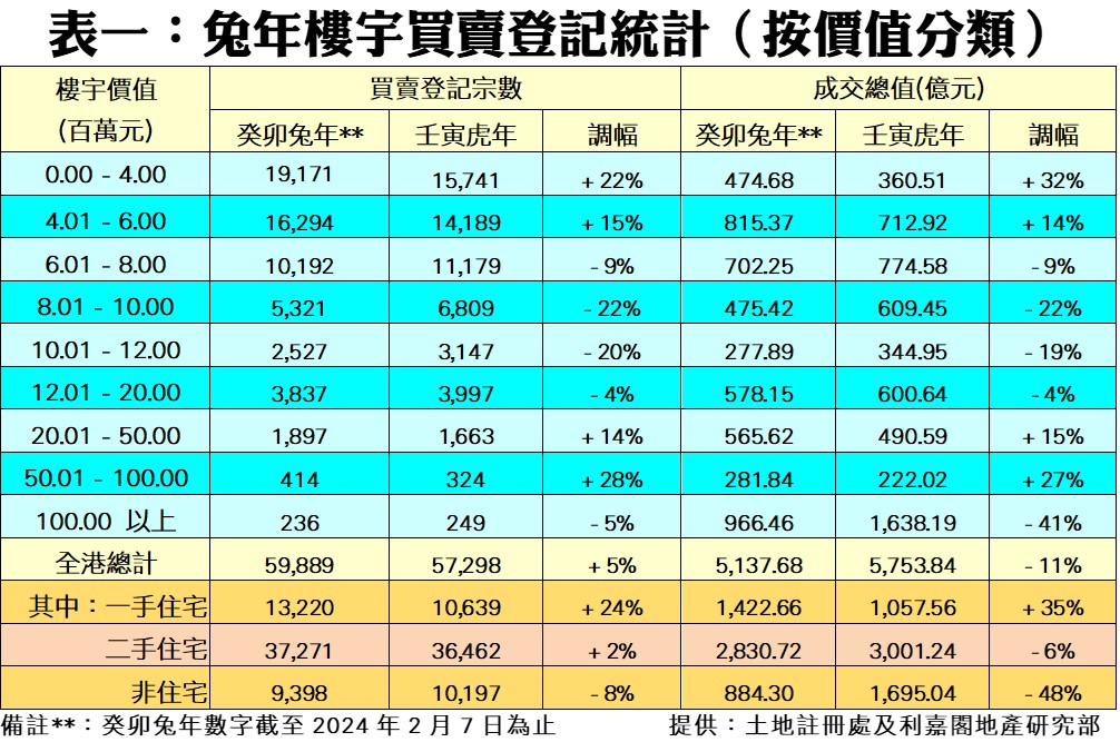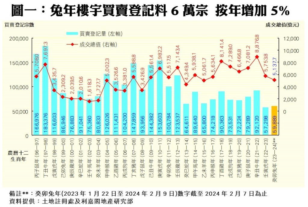 利嘉閣地產研究部主管陳海潮指出,剛過去的兔年樓市交投在反覆中略升,買賣登記量告別虎年的歷史新低,展望甲辰龍年在減息及新增人口住屋需求帶動下,有望穩步再升。綜合土地註冊處最新數據所得,截至今年2月7日為止,全港暫錄59,889宗樓宇買賣登記,涉及成交總值約5,137.68億元,預測兔年全年登記量值最終可達60,220宗及5,166億元,料將較壬寅虎年(2022年2月1日至2023年1月21日)的57,298宗及5,753.84億元分別升5.1%及跌10.2%。當中登記量從歷史谷底回升,重越六萬宗大關,惟仍屬史上次低水平;而成交總值則連挫兩年,創近8年最少。