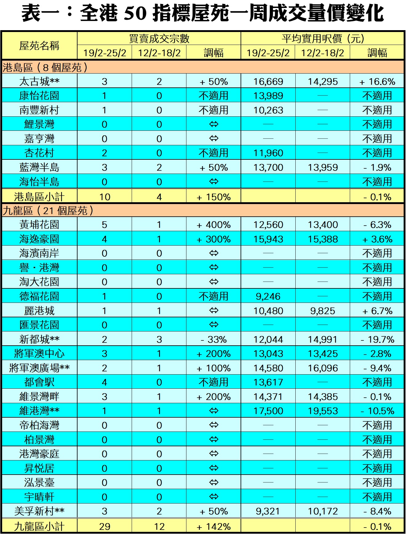 至於,新界區21個指標屋苑上周共錄35宗買賣,較前周的22宗增加59%,其中名城上周連錄6宗買賣,較前周的1宗大增5倍;YOHO Town交投量由前周的2宗,增加1倍至上周的4宗;沙田第一城期內則錄得6宗成交,按周增加50%。此外,在全港50個指標屋苑之中,上周共有20個屋苑錄得「零成交」,較前周的30個減少33%,當中九龍區及新界區分別佔10個及7個屋苑,港島區則佔3個(詳見表一)。