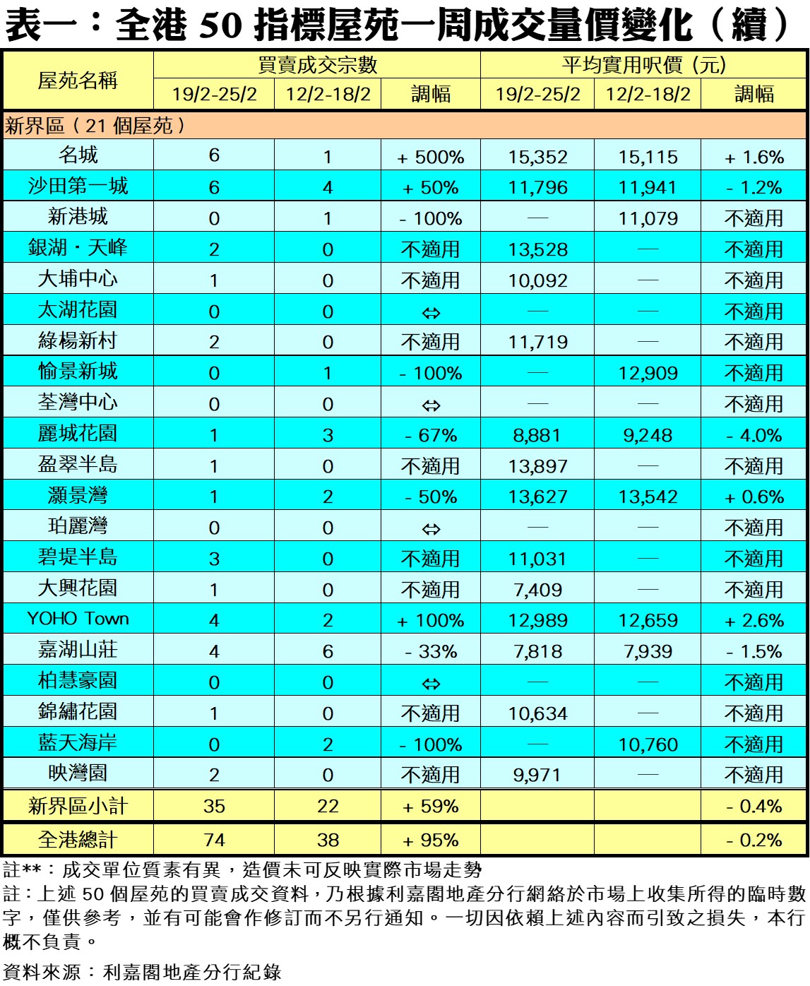 利嘉閣地產研究部主管陳海潮表示,農曆新年淡靜氣氛盡散,買賣雙方大舉回流市場,加上未有焦點新盤搶客,購買力集中二手屋苑,令按周交投在之前的低基數下顯著彈升。綜合利嘉閣地產分行數據所得,全港50個指標屋苑於上周(19/2—25/2)共錄74宗買賣個案,較前周(12/2—18/2)的35宗大增近95%,結束早前連減四周的走勢,並創近五周以來的新高。