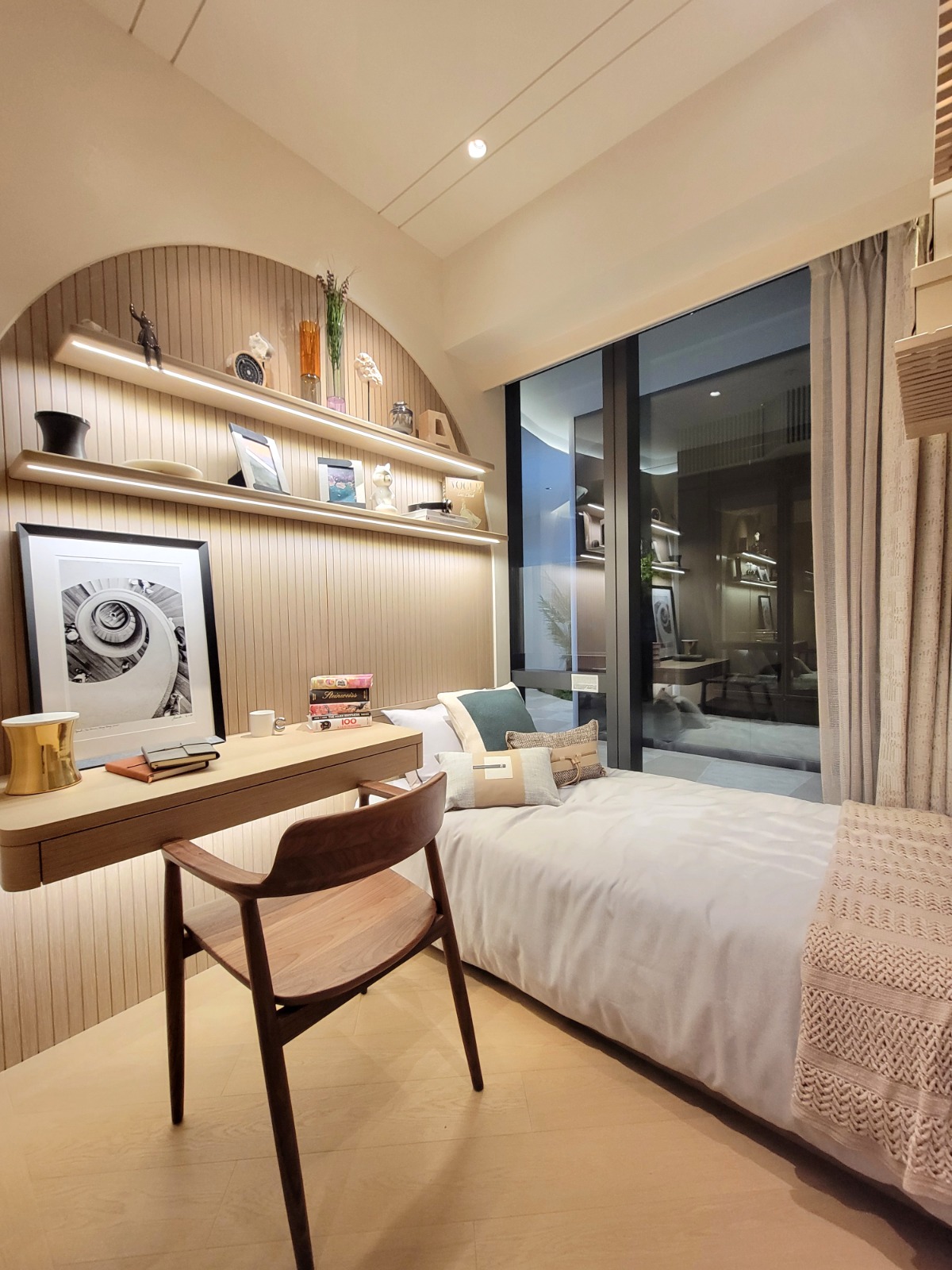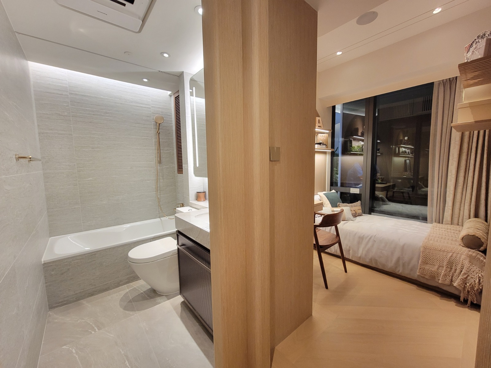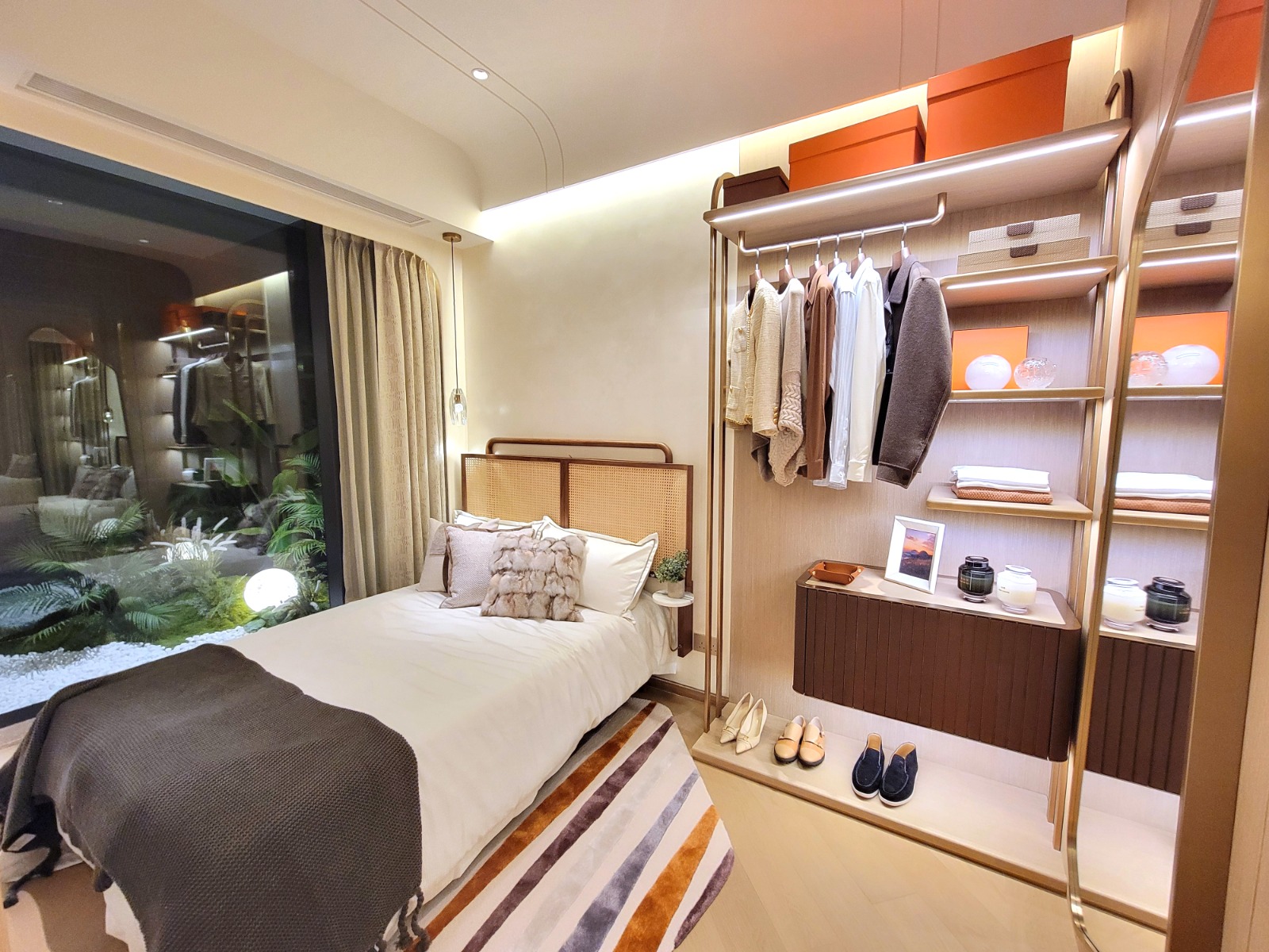 單位廳房同向,可同享內園美景,鄰近一帶青蔥翠巒景色及戶外球場三重景致。主人睡房設有偌大窗戶,可把室外綠化景致帶入室內。主人睡房空間十足,可擺放雙人床及衣櫃,仍有不少活動空間;睡房1亦設有大型窗戶,一面牆身以木系條子製作成特色牆,別具清新風格。