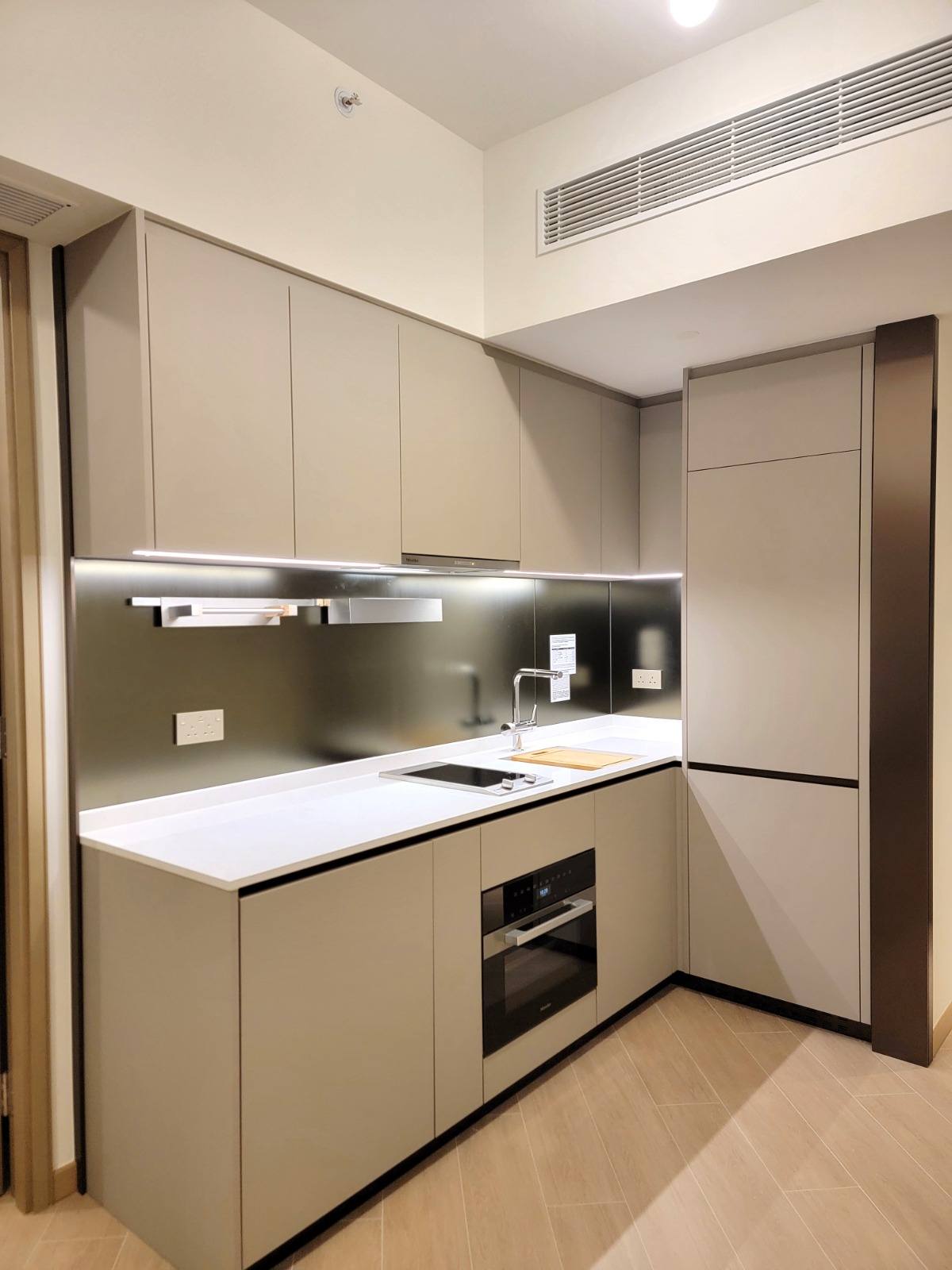 開放式廚房選用不少國際品牌配備,包括Miele電磁爐、蒸焗爐、嵌入式雪櫃連冰箱及纖巧型抽油煙機,以及配備西門子嵌入式洗衣乾衣機。