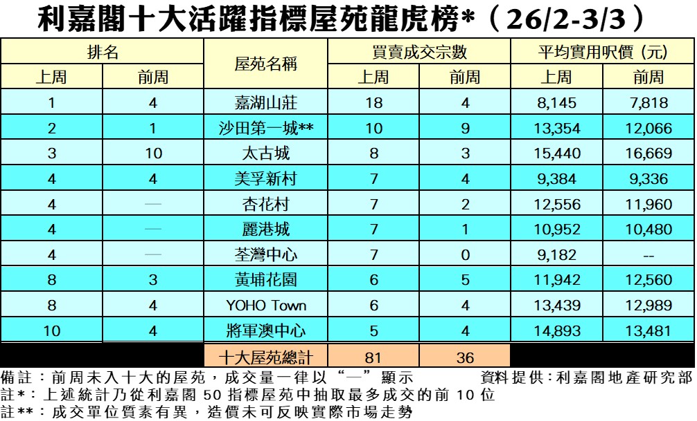 十大活躍指標屋苑上周買賣81宗 嘉湖山莊霸氣登頂 勁錄18宗買賣 研究報告 2024-03-06 by Cheung Cyrus · Published 2024-03-06 · Last modified 2024-03-13