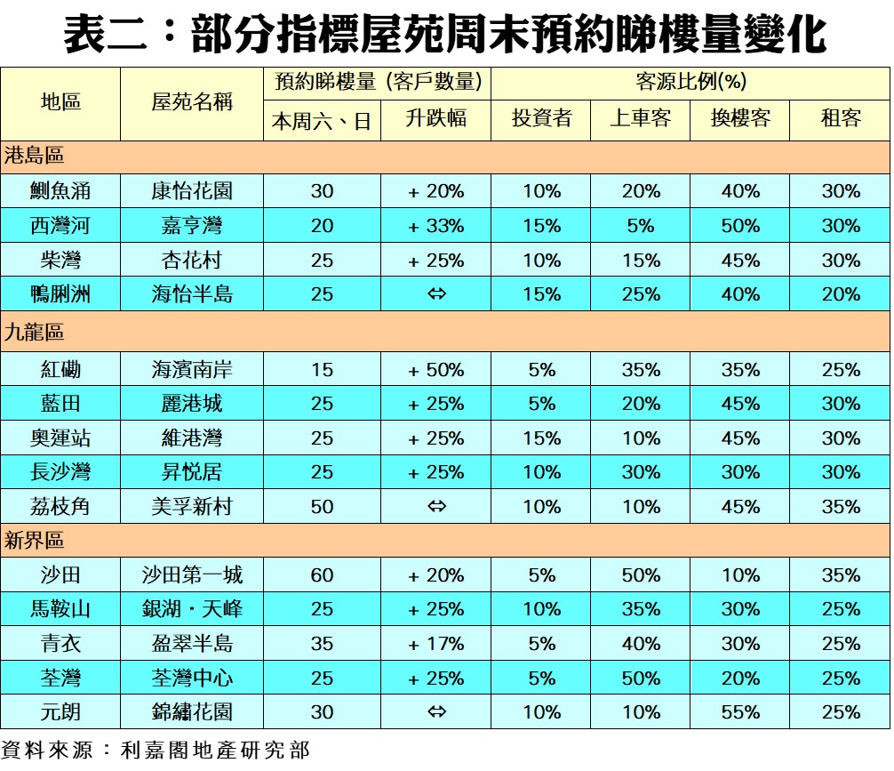 利嘉閣地產研究部主管陳海潮表示,樓市撤辣全面解除市民入市的枷鎖,成功吸引不同類別的買家魚貫進場;在市場暫缺大型焦點新盤搶攤應市之際,購買力停駐於二手市場,令本周末50指標屋苑預約睇樓量升勢持續。根據利嘉閣地產研究部數據估算,全港50個指標屋苑共錄1,340組客戶於周末預約睇樓,較上周的1,230組增加8.9%,連升四周,並刷新了近60個周末(即逾一年)的新高紀錄。