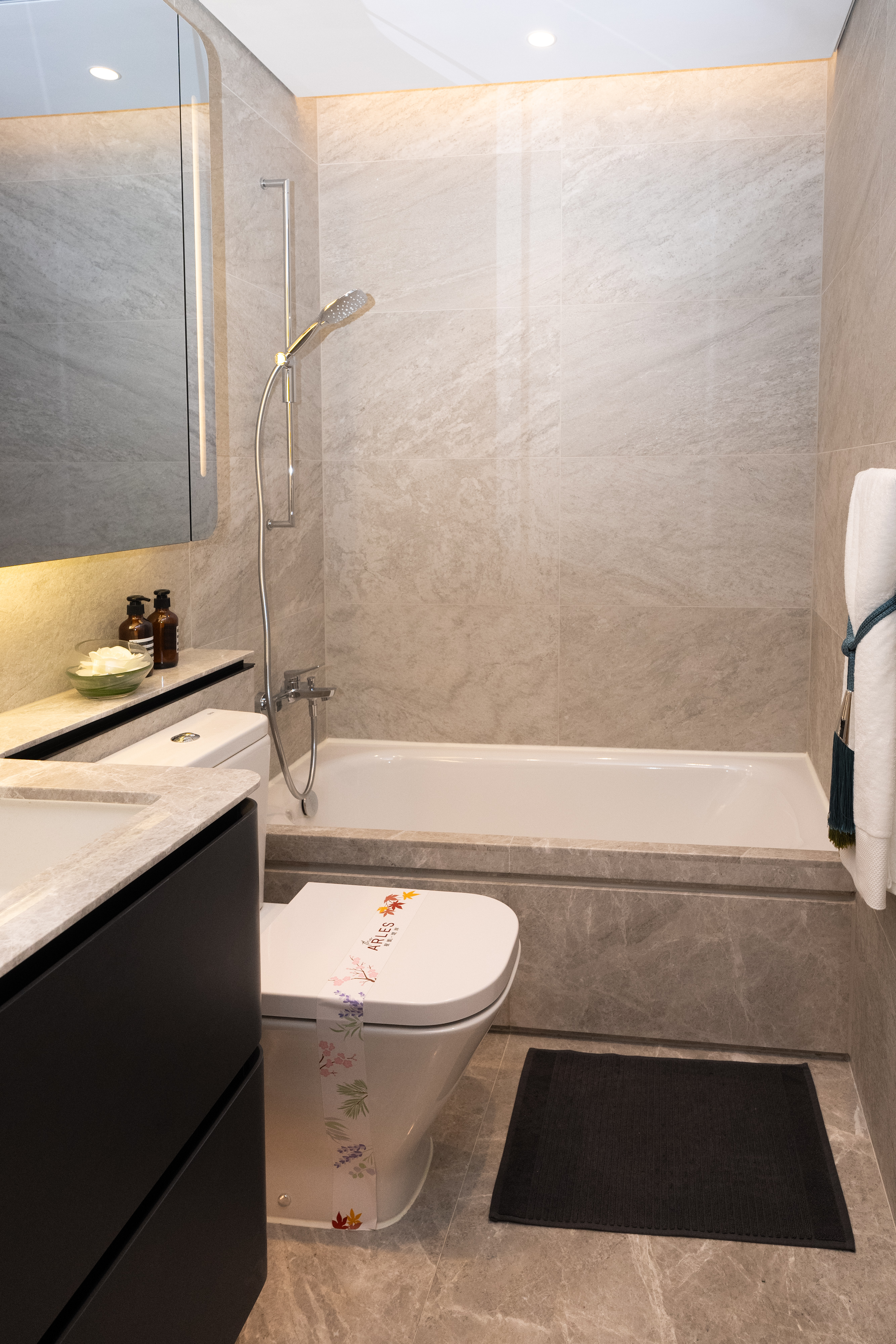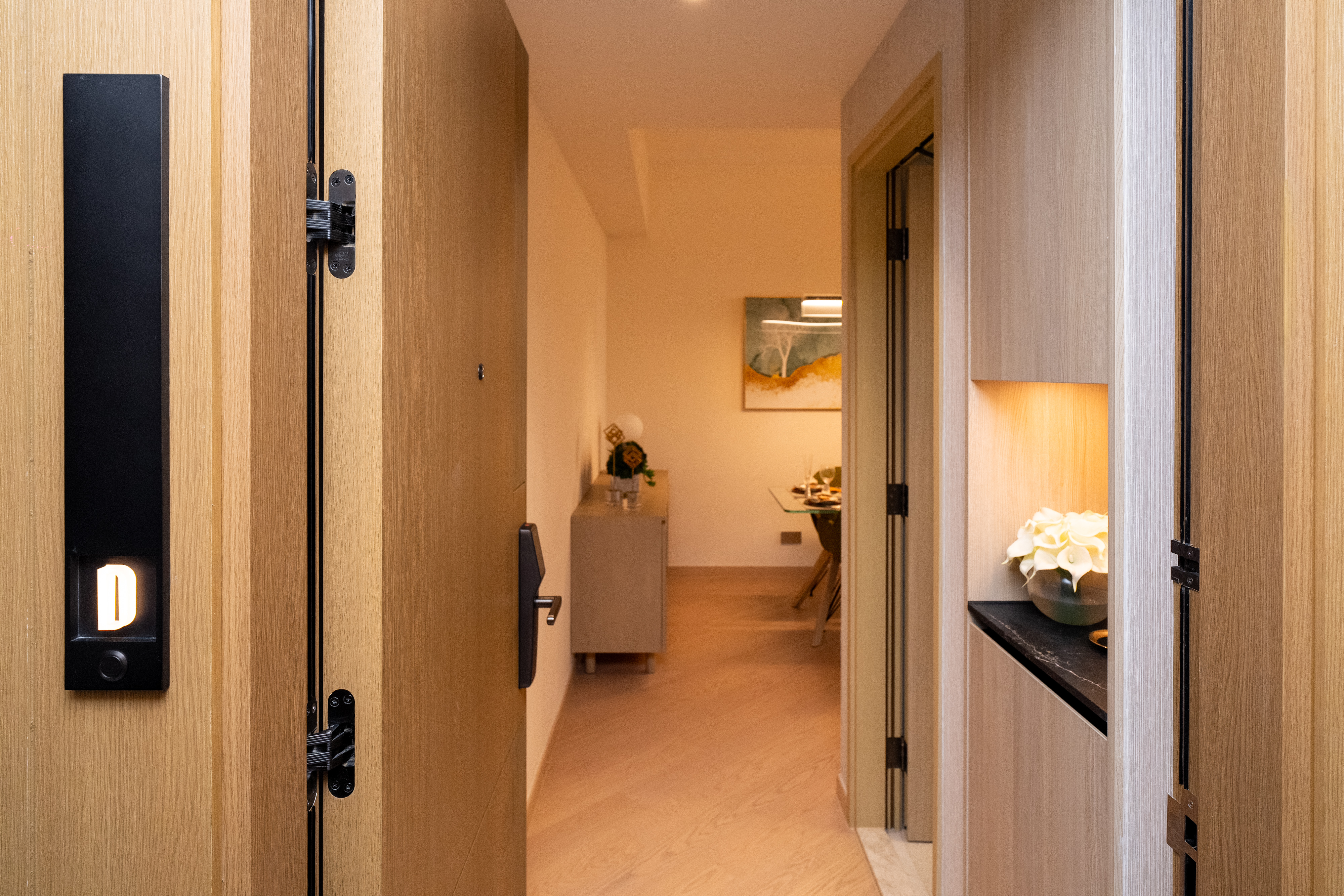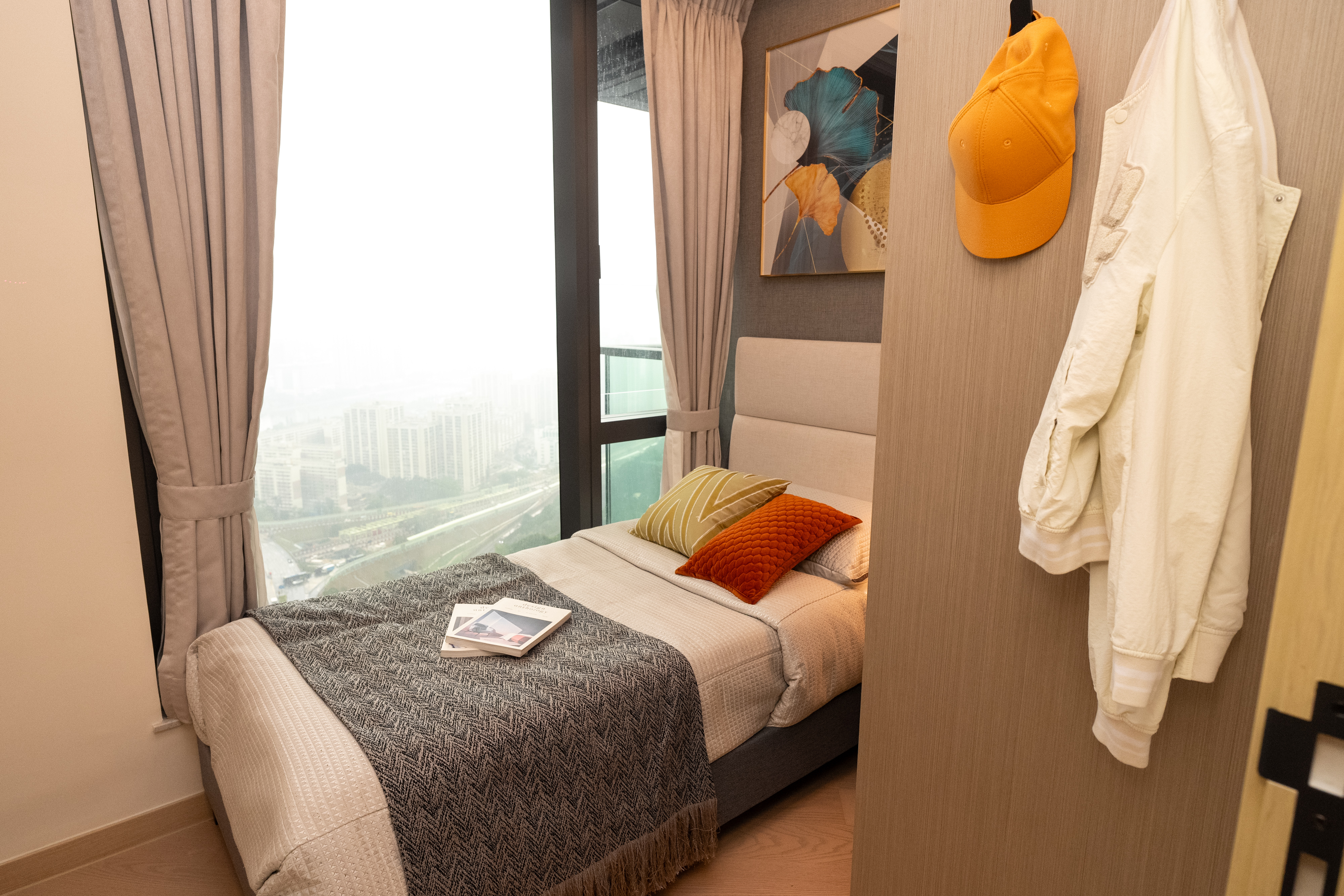 寢區則設有三個房間及一個儲物室,當中主人房空間寬敞且外接工作平台,主人房與睡房同向,同享開揚沙田及城門河美景;而睡房2則可享部分馬場景致。浴室設有浴缸,可享私人休閒空間外,更設有智能鏡,可提供多項功能,包括瀏覽天氣、新聞、交通情況,查看日程提醒甚至屋苑通告。