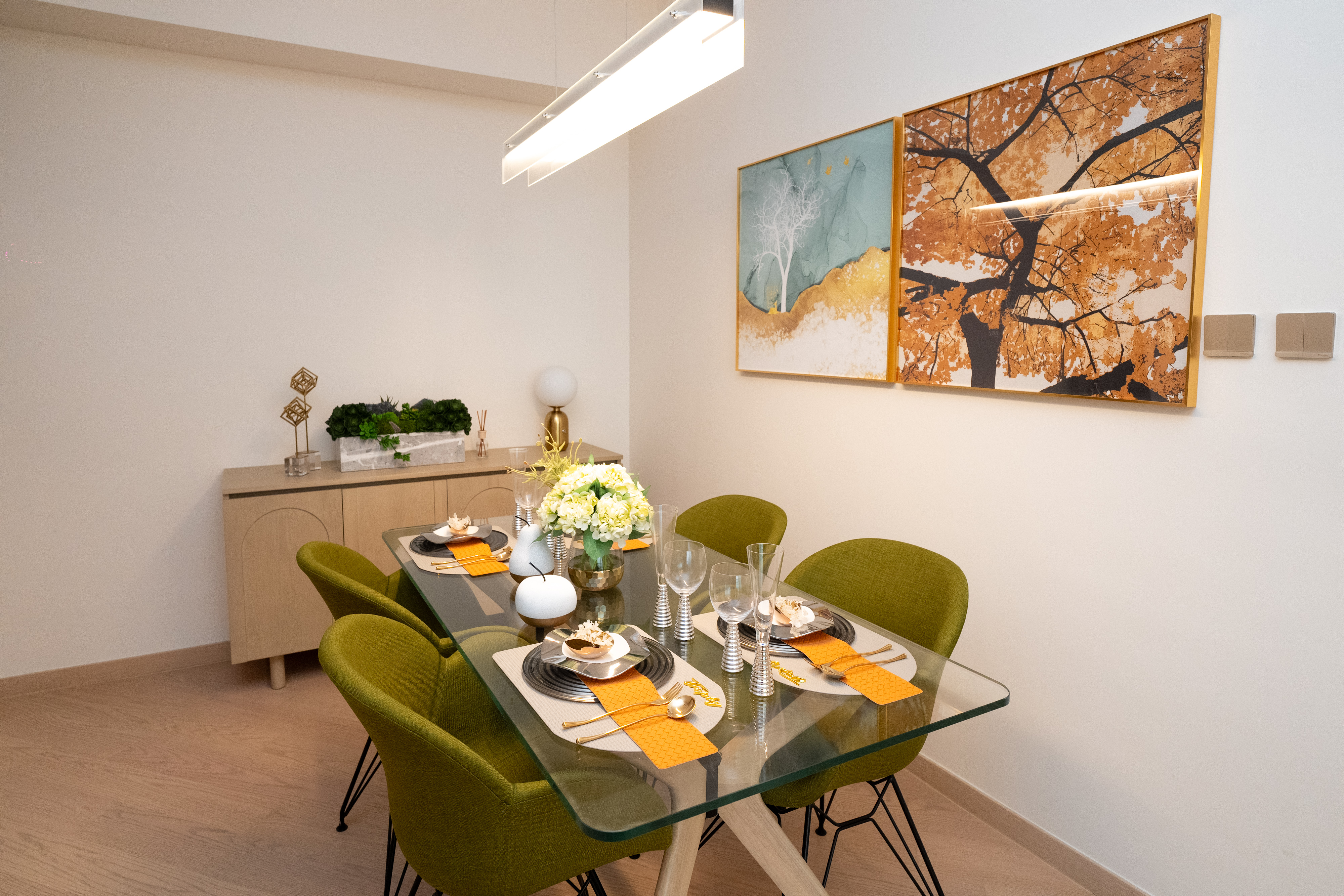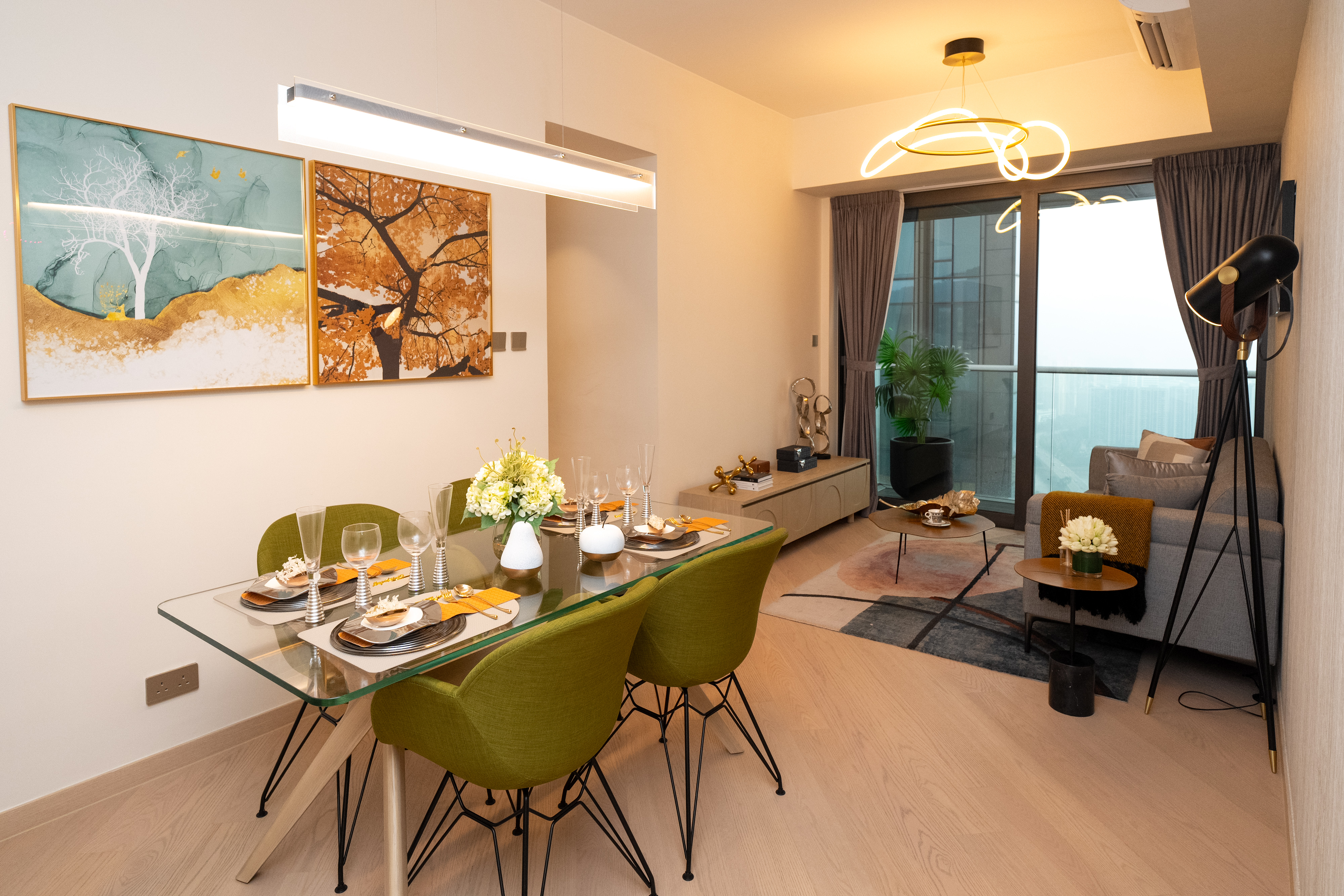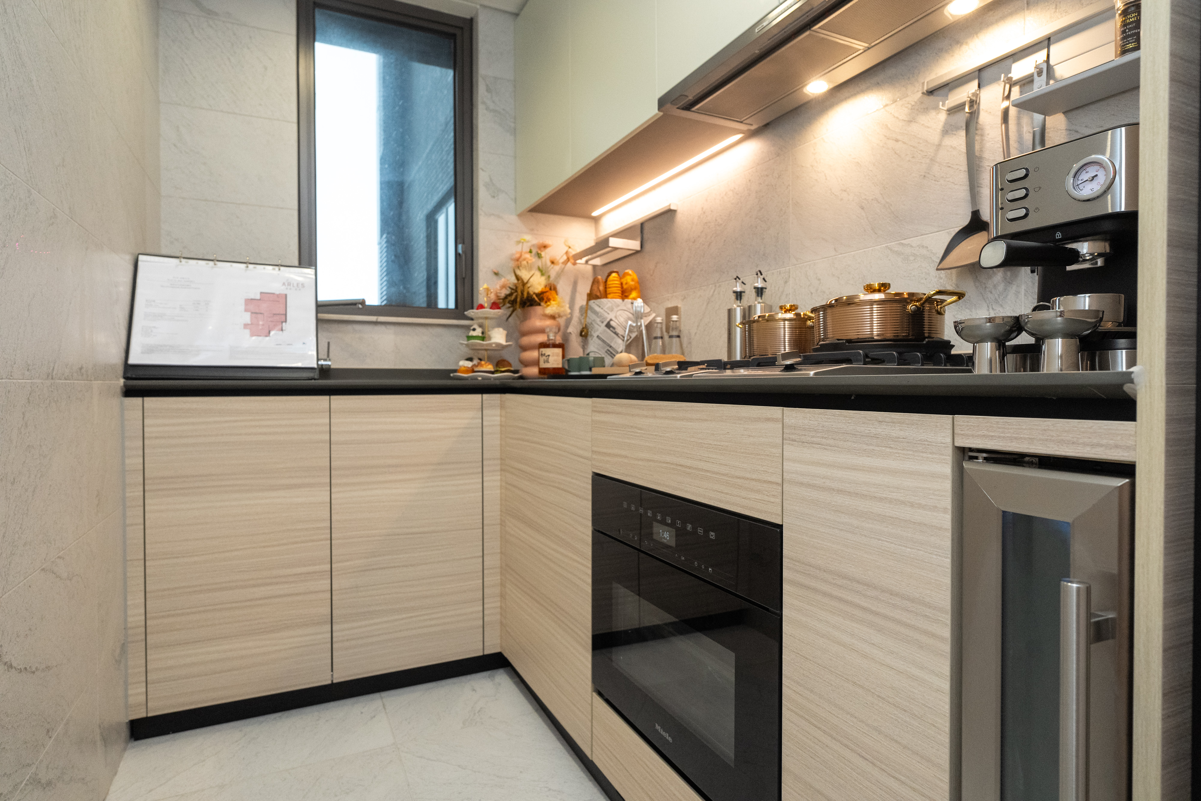 單位實用面積同為676方呎,切合家庭客需要。大廳、主人房間及一間睡房同向,外望盡享開揚沙田及城門河美景以及部分馬場景,大廳面積約187方呎,間隔方正實用。客飯廳長約6.1米、闊約2.85米,間隔方正實用,大廳設有落地玻璃趟門外接35方呎露台,不但採光度充足而且有助通風。廚房除配備一系列知名品牌電器外,亦設有曲尺型工作檯及廚櫃,方便住戶大展廚藝。