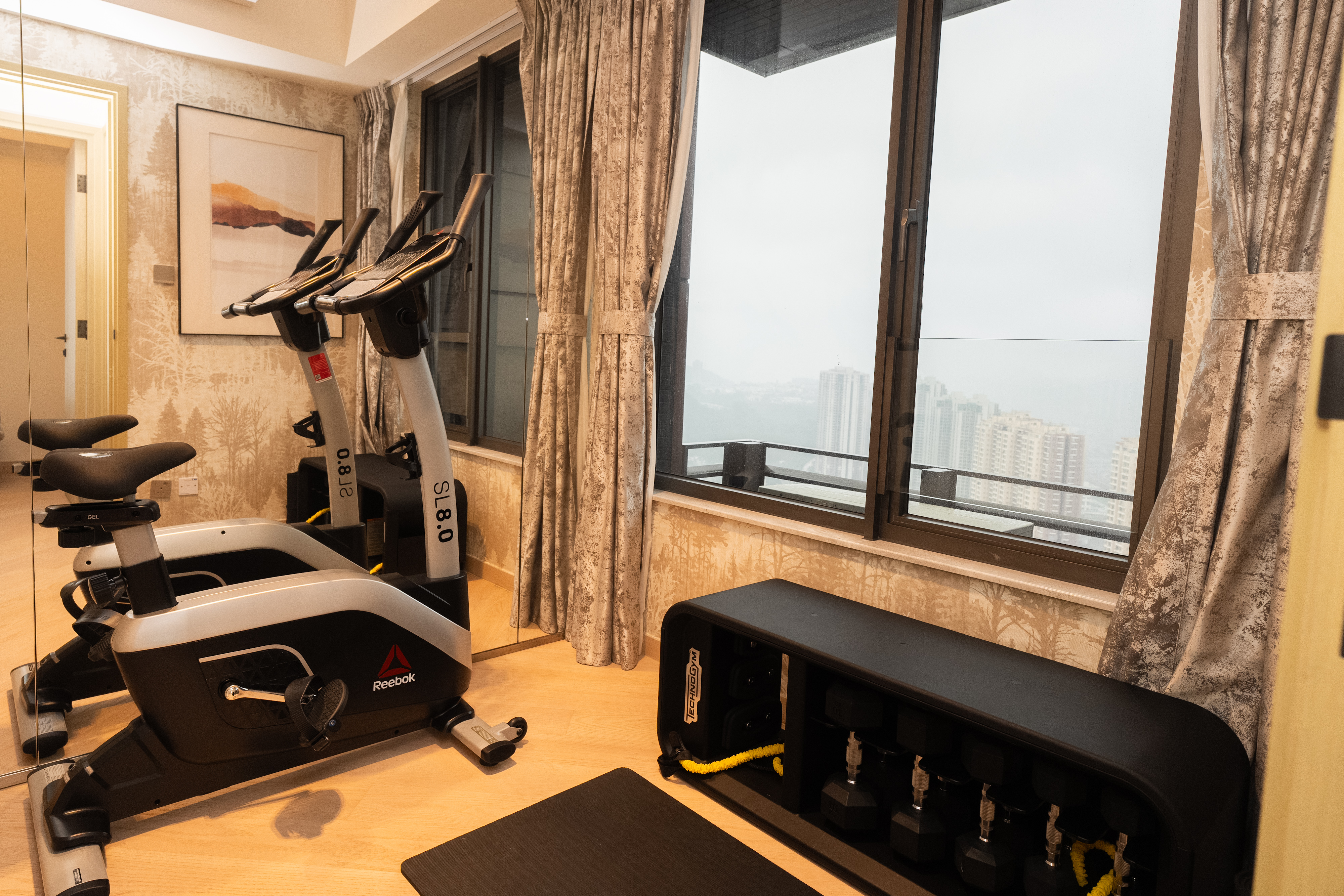 寢區則設有三個房間及一個儲物室,當中主人睡房空間寬敞,擺放雙人床後,仍可三邊落床,連接16方呎工作露台,景觀開揚。另一間睡房設落地大窗,配備單人睡床及衣櫃,設備齊全;設計師更特別把一個房間設計成健身房,設有健身器材及室內單車機,可以隨時在家做運動,鍛鍊體魄。廚房配備氣體煮食爐、組合式雙頭氣體煮食爐、蒸焗爐、抽油煙機,嵌入式雪櫃及洗衣乾衣機,酒櫃。浴室除設有浴缸、浴室寶及抽氣扇外,更特設智能鏡,可提供多項功能,把創新及科技元素融入單位當中。