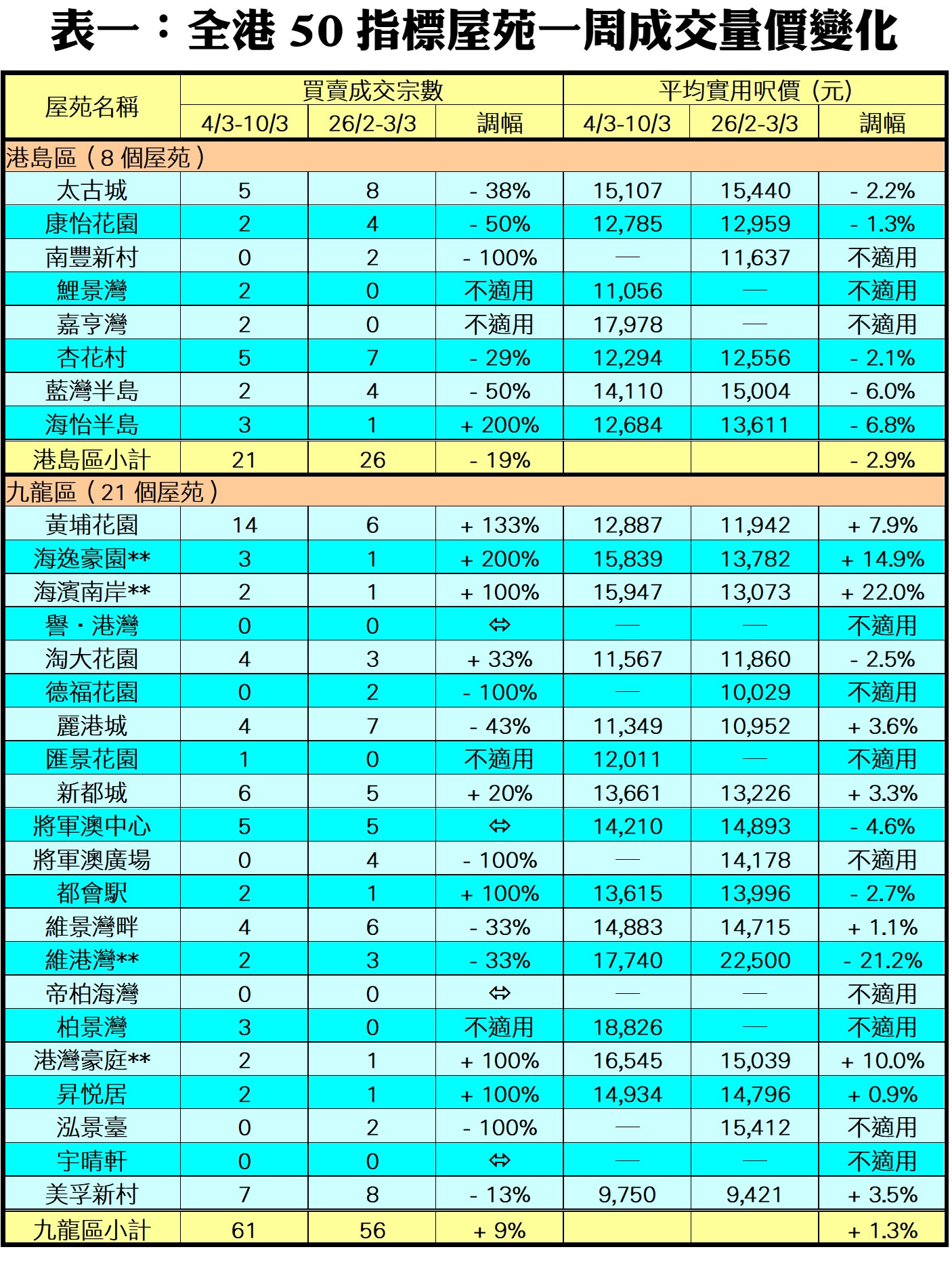 至於,港島區8個指標屋苑上周共錄21宗成交,較前周的26宗減少19%,其中康怡花園及藍灣半島各自錄得2宗買賣,按周分別減少50%;藍籌屋苑太古城成交量由前周的8宗,減少38%至上周的5宗;杏花村期內錄得5宗交投,較前周的7宗減少29%。此外,在全港50個指標屋苑之中,上周共有9個屋苑錄得「零成交」,較前周的13個減少31%,當中九龍區及新界區分別佔6個及2個屋苑,港島區則佔1個(詳見表一)。
