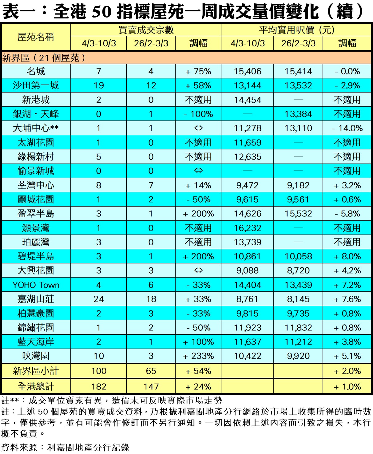 利嘉閣地產研究部主管陳海潮表示,撤辣效應持續發揮作用,各方買家積極入市下,持續推升指標屋苑按周交投量,一步步向更高位進逼。綜合利嘉閣地產分行數據所得,全港50個指標屋苑於上周(4/3—10/3)共錄182宗買賣個案,較前周(26/2—3/3)的147宗再增近24%,連續三周增加並創自去年三月初以來的五十三周(約一年以來)新高。