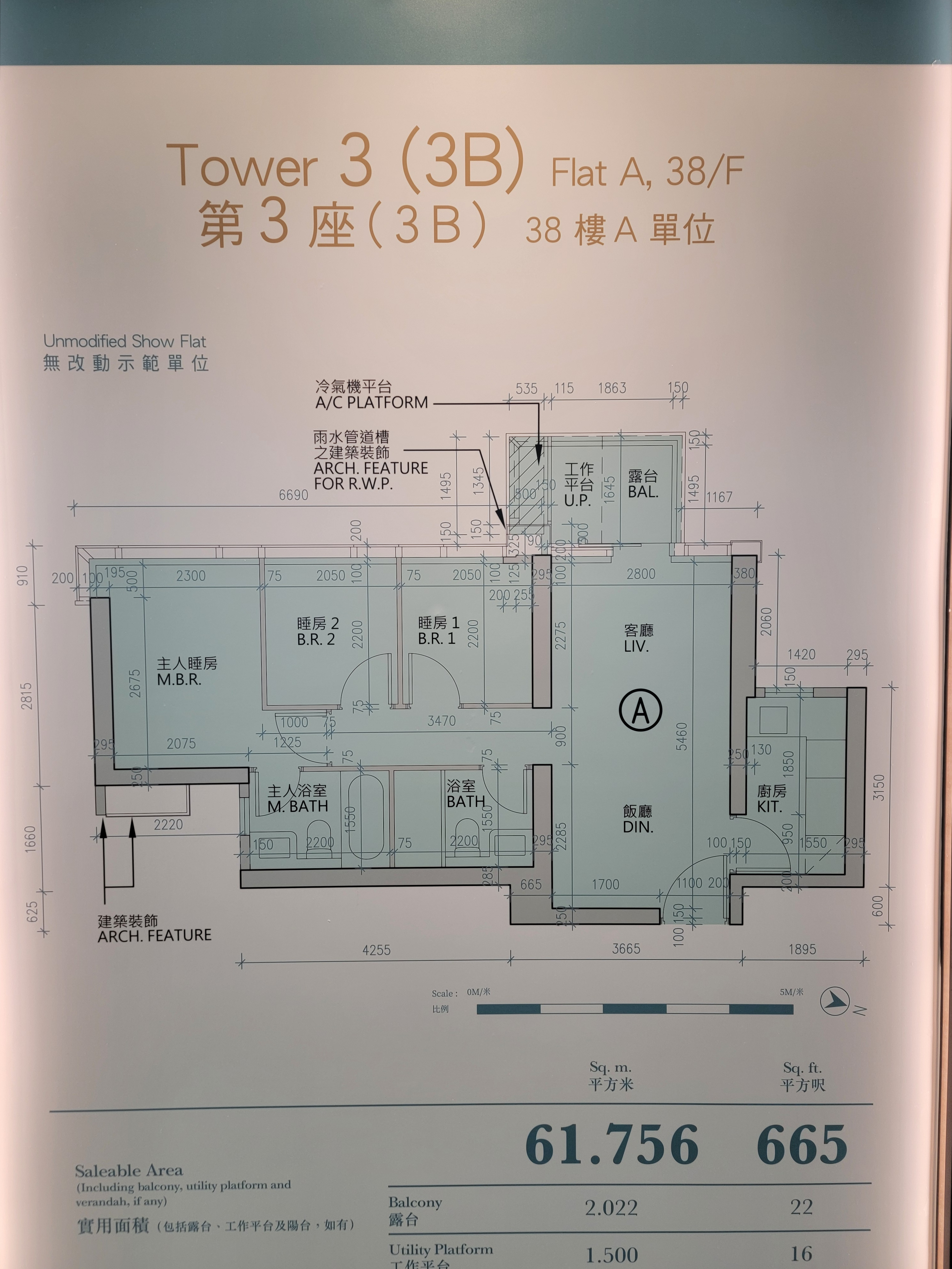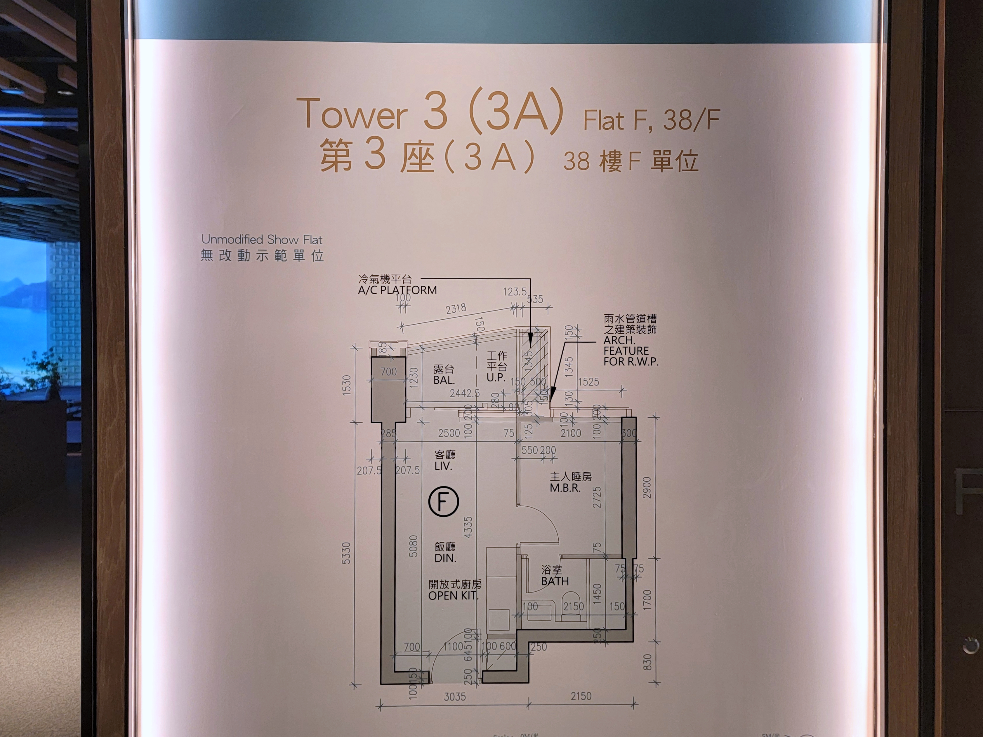 項目設有4個示範單位,涵蓋一房至三房間隔,包括2伙兩房,均以第3A座38樓C室為藍本搭建,分別為經改動連裝修示位及無改動示位,實用面積453方呎。另設有1伙一房開放式廚房無改動示位,以第3A座38樓F室為藍圖搭建;1伙三房梗廚無改動示位,以第3B座38樓A室為藍圖搭建。