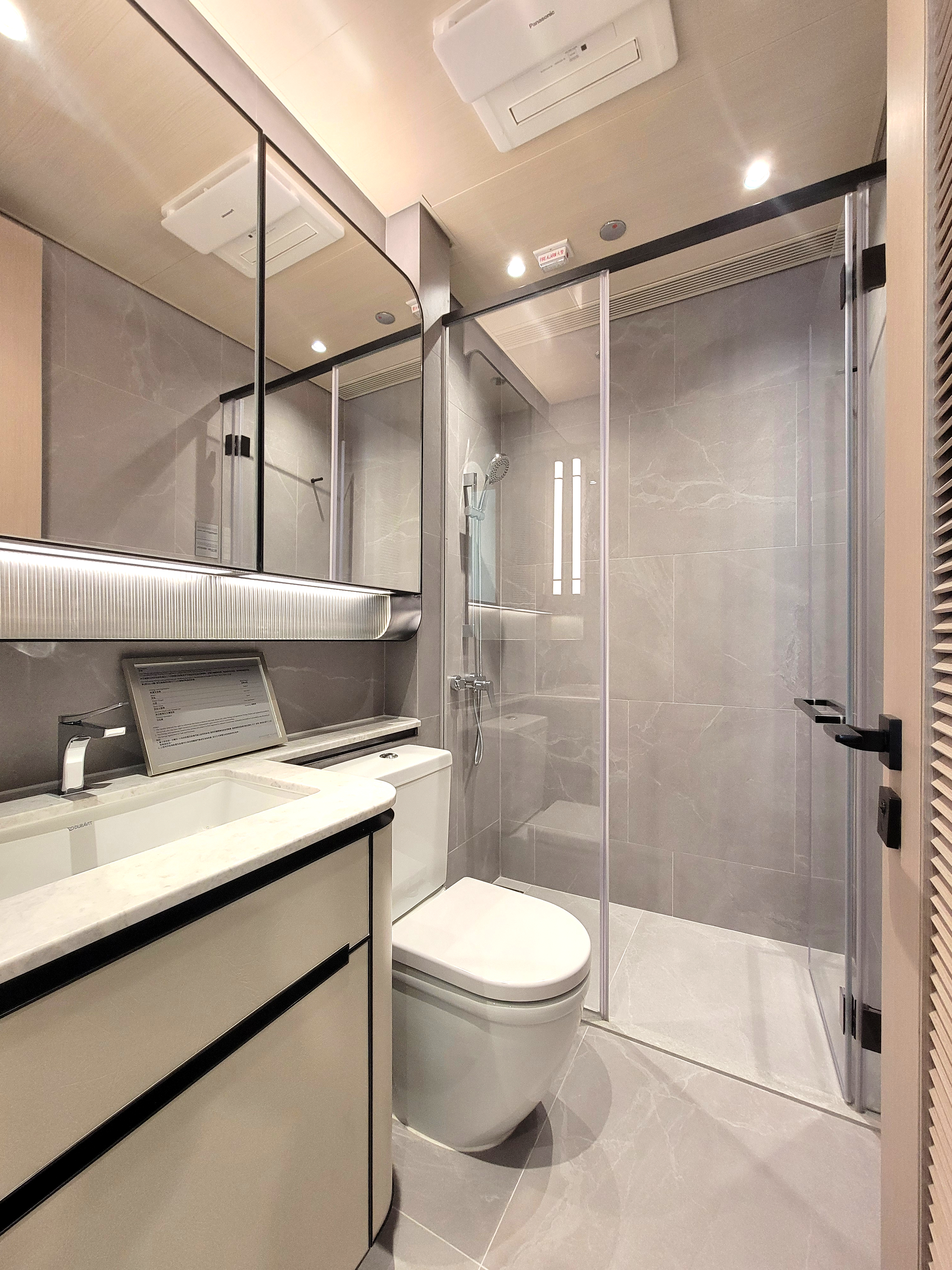 單位實用面積453方呎,利用高樓底打造多功能收納櫃組合連智能消毒鞋櫃,配備紫外線殺菌燈。收納櫃組合內設電掣、多功能收納趟板及活動層板,可自由配合配件,收納家居潔淨設備電器。客廳連接露台及工作平台,廚房牆身設置物架連掛鈎,方便擺放廚具,櫃內設有分層抽屜式置物架、隱藏式垃圾桶。浴室洗手盆櫃選用皮紋飾面,配搭淺灰白色天然檯面石,櫃內設小型儲物間關,櫃側設應藏式置物空間;睡房方正實用,主人睡房內配置電插座連 USB 插座。