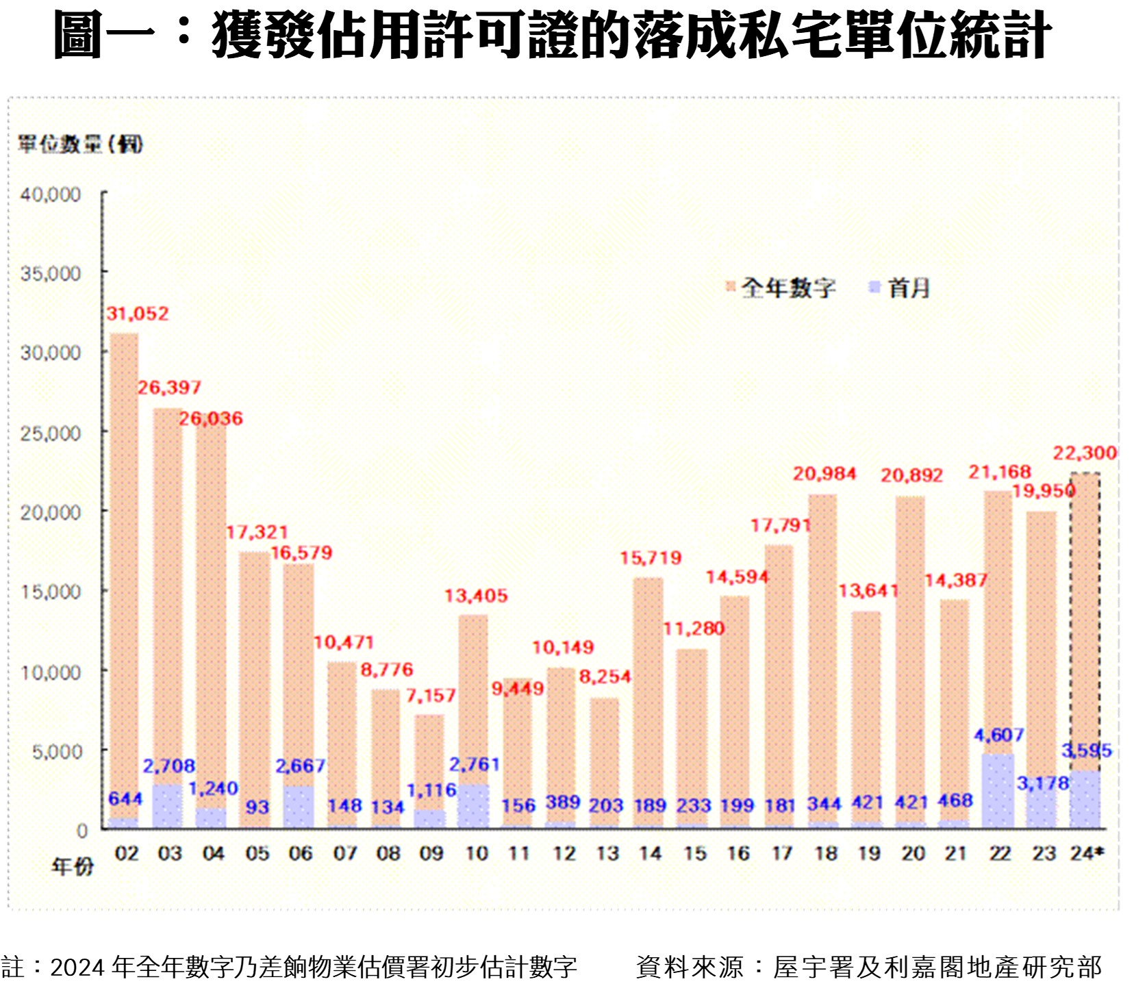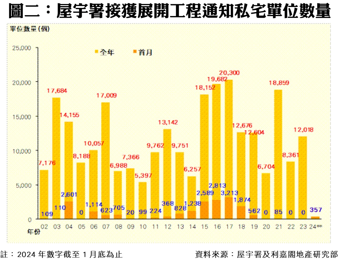 陳海潮指出,今年首個月私宅落成量達差估署預測全年的22,300伙的16%,進度理想,預料年內有不少大型項目可望陸續取得入伙紙,包括天水圍「YOHO WEST」第1期(1,393伙)、「凱和山」(693伙)及大角咀「利奧坊‧壹隅」(614伙)等,加上其他中小型項目,初步估計今年全年落成量有望回升至約2.3萬伙至2.5萬伙水平。