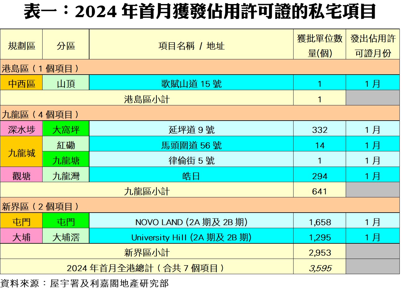 此外,私人住宅落成量方面,根據屋宇署今日最新發表的資料月報顯示,2024年一月份全港共有7個項目,合共3,595個私人住宅單位落成(以屋宇署發出佔用許可證的樓宇數量為準),較去年十二月份的43伙大增逾82倍,創24個單月新高;亦較去年一月份同期的3,178伙增加13%,並為二十三年來同期次高。
