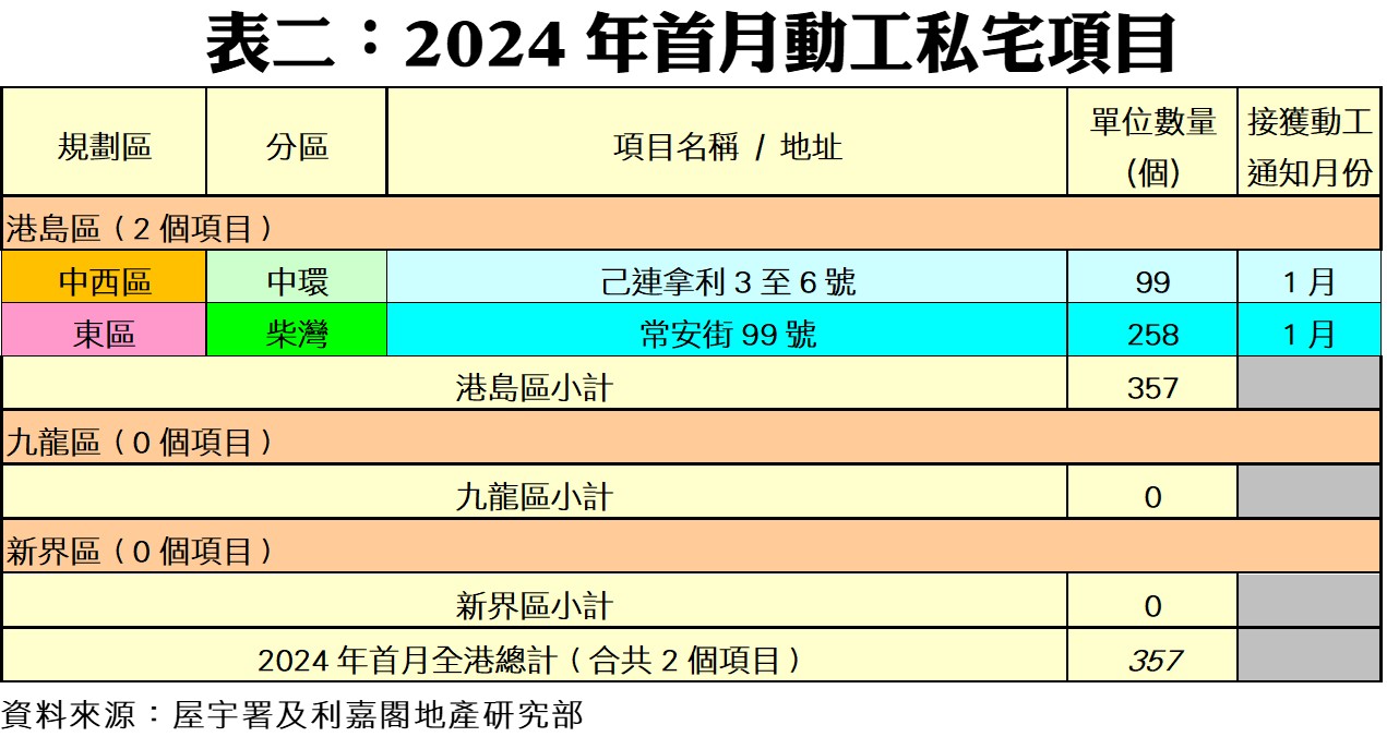 利嘉閣地產研究部主管陳海潮表示,年初暫未有大型項目動工,私宅動工量按月回落,根據屋宇署今日發表的最新數據,2024年一月份全港共有2個私人住宅項目,合共357伙動工(按屋宇署接獲上蓋建築工程動工通知為準),較去年十二月的2,987伙按月減少88%,不過已是過去五年的首月同期新高;當中一月份動工項目包括柴灣常安街99號(258伙)及中環己連拿利3至6號(99伙)。