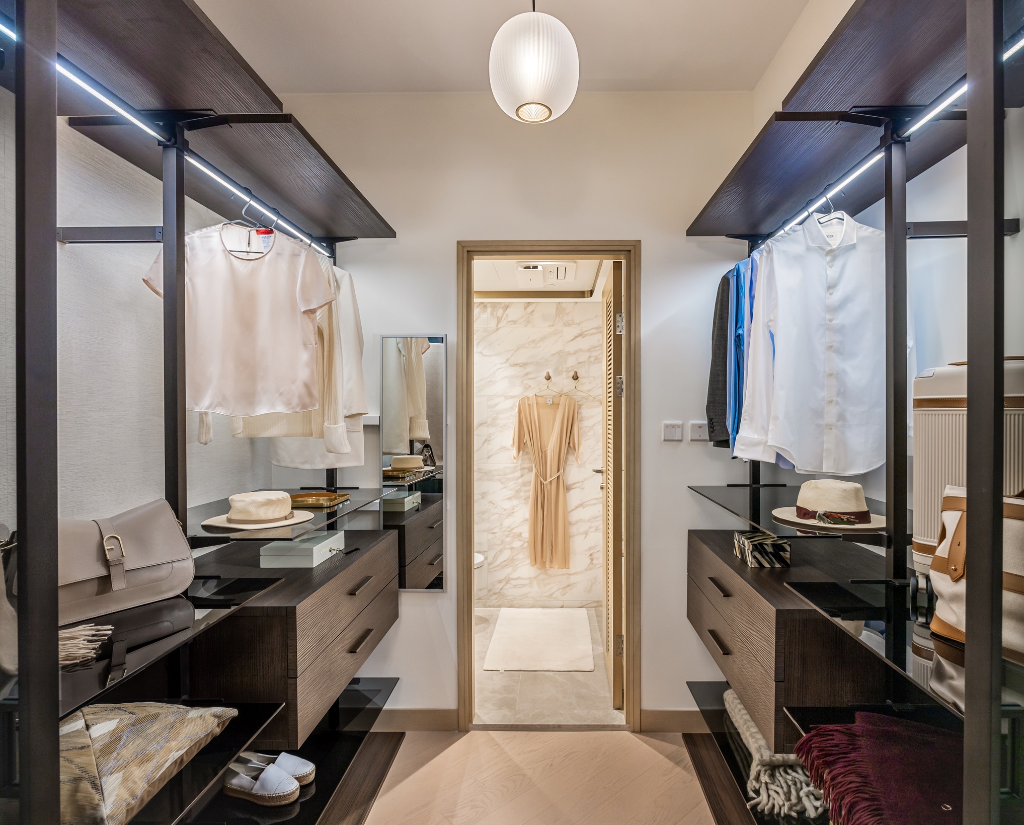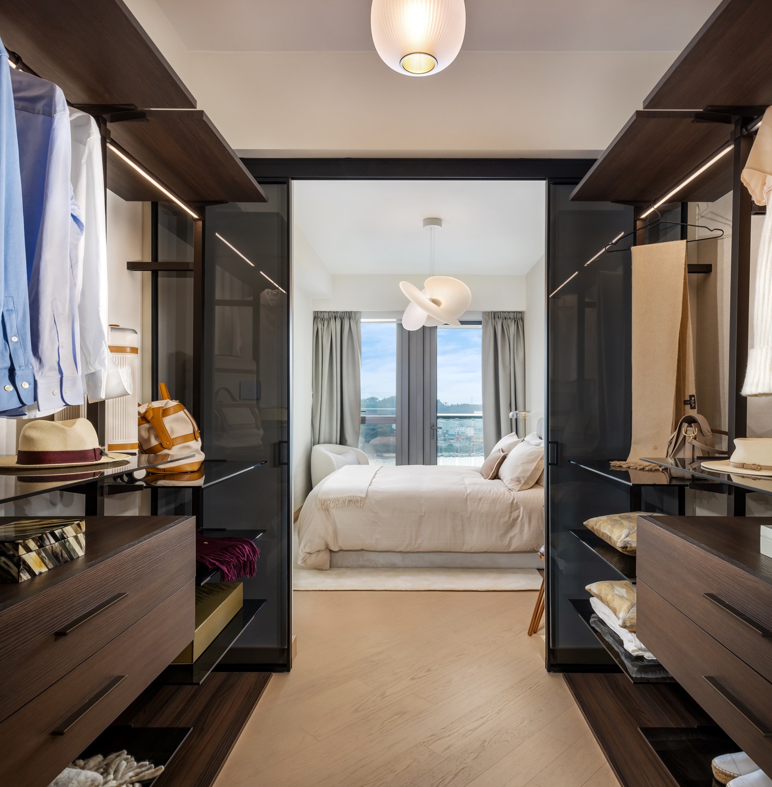 主人套房與客廳同向,同樣可享海景。房間面積逾160方呎,外接工作平台。房內雙人大床可以三邊落床,放置梳妝枱後,空間仍綽綽有餘。房內特設衣帽間,選用歐洲名牌Raumplus的Walk-in Wardrobe步入式衣櫥,以深色為主調。沿著衣帽間前行便可到達主人浴室,方便梳妝更衣。兩間睡房開則同樣方正實用,其中一間設計成書房,將書桌擺放在曲尺玻璃大窗旁邊,可以望著璀璨海景工作,相當愜意。另一間睡房則放有單人床、衣櫃及全身鏡。