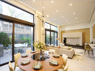 廳堂以落地玻璃趟門連接花園,引入自然光線,亦將綠意美景帶到室內。