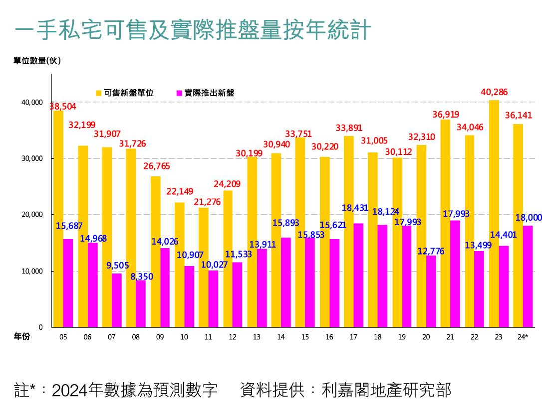 過去兩年,樓市先後受疫情及急促加息的洗禮,一手新盤銷情緩慢,連續兩年買賣登記量僅約1萬宗;踏入2024年,樓市「辣招」全撤,息口見頂趨降,經濟股市有望回暖,而新增人口需求下可望令一手新盤市場回暖。龍年到來之際,利嘉閣《HOME feel》為廣大讀者整理今年最新潛在新盤供應,歸納出年內約有116個全新一手私宅項目有機會應市,涉及伙數約36,141個,如欲趁撤辣及樓價低水而入市者,可先閱覽本文及圖表,掌握各區新盤入市資訊,冀能在龍年成功置業、福祿騰飛。