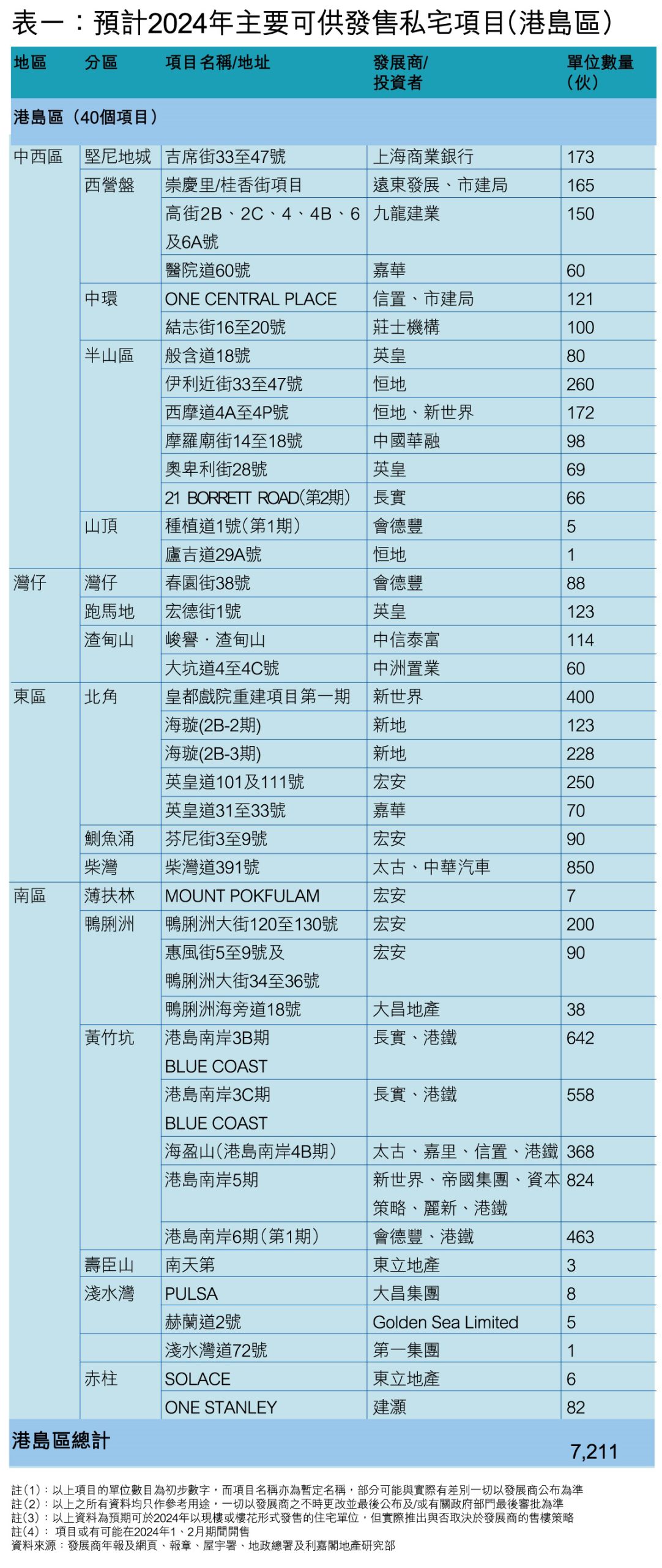 檢視港島區方面,2024年有40個潛在項目準備上馬,項目量為全港三大區中次多,惟單位總數只有7,211個,則屬三區中最少。今年港島最大的供應庫仍然是來自南區的3,295伙(佔港島整體45.7%),焦點為黃竹坑站上蓋港島南岸,其中項目第5期為區內最大單一新盤,提供824伙,而整個黃竹坑站年內料提供2,855伙潛在供應,已佔了全港島總供應近四成。至於港島最大單一項目(以已知分拆期數後計)為柴灣道391號的850伙,而另一焦點則為北角皇都戲院重建項目第一期的400伙。此外,值得一提的是,中西區是繼南區後,今年在港島項目選擇次多的分區,合共有14個項目伺機開盤,當中涵蓋上至山頂的獨立屋、半山低密度豪宅及中環、西環一帶的單幢物業等,各式選擇迎合不同需求﹙見表一﹚。