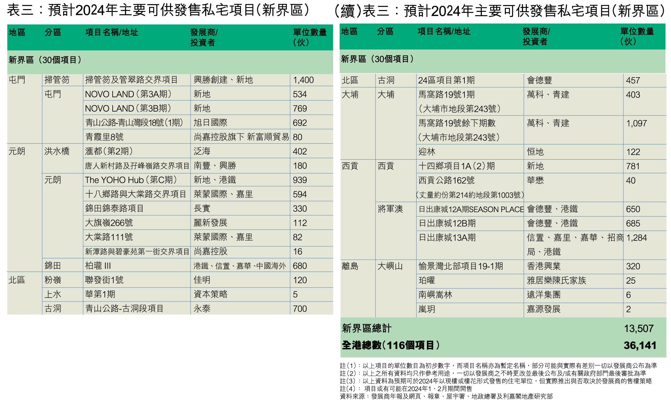 樓市經歷2023年的疫後跌宕整固及息口急升洗禮後,冀隨著《財政預算案》為樓市全面「撤辣」,息口見頂回落及經濟股市轉穩,於2024年亦可望迎來真正的「復甦年」。展望2024年,預測全港有約116個全新一手私宅項目可成為潛在供應,合共將提供約36,141伙;數量較預測2023年的40,286伙回落10.3%,但仍為自2006年以來的19年第三多水平。當中鐵路站上蓋項目依然為全港新盤最大供應庫,涉及6個站,共有13個項目遍及港九新界合共提供8,875伙,佔全港總伙數達24.6%;至於第二大的供應庫是啟德新區及跑道區,今年將有14個項目提供8,255伙,當中89%(7,349伙)均位於跑道區。上述約3.8萬個潛在供應中,料實際推盤量約為1.8萬伙。