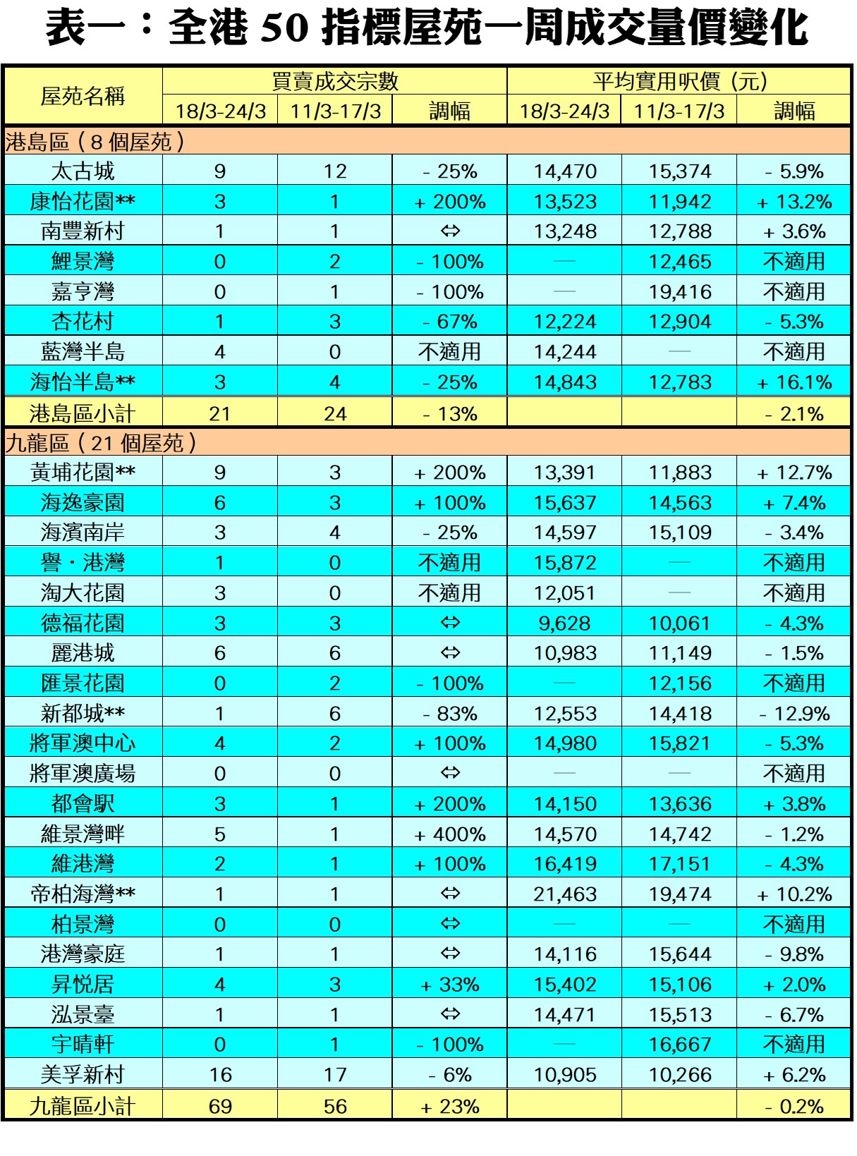 至於,九龍區21個指標屋苑上周共錄69宗交投,較前周的56宗增加23%,當中維景灣畔成交量由前周的1宗,大增4倍至上周的5宗;黃埔花園及都會駅各錄9宗及3宗買賣,按周分別增加2倍;海逸豪園、將軍澳中心及維港灣交投量分別按周增加1倍,各自錄得6宗、4宗及2宗成交。此外,在全港50個指標屋苑之中,上周共有9個屋苑錄得「零成交」,較前周的6個增加50%,當中九龍區及新界區分別佔4個及3個屋苑,港島區則佔2個(詳見表一)。