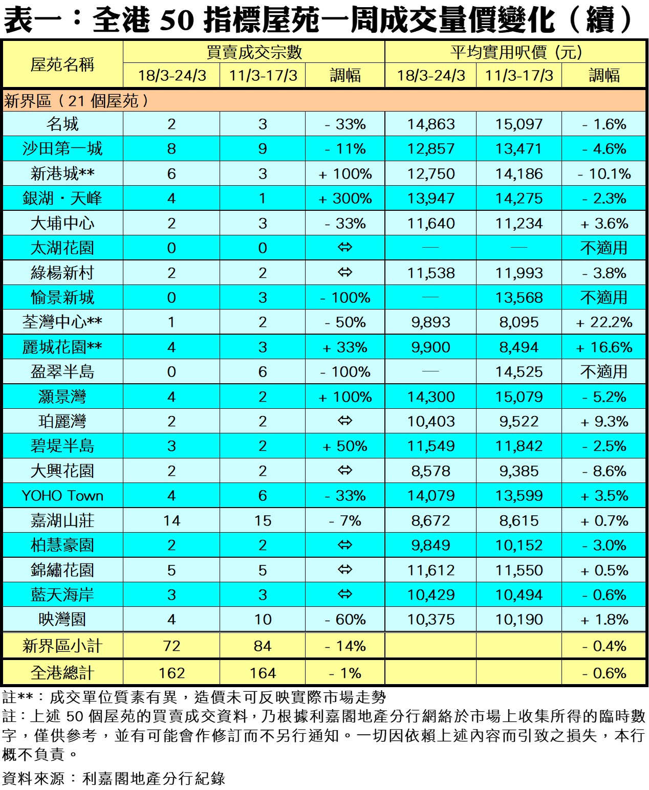 利嘉閣地產研究部主管陳海潮表示,樓市撤辣後,市場氣氛維持暢旺,一手及二手市場並駕齊驅向好,反映購買力仍積極入市,料旺市情況仍可持續。綜合利嘉閣地產分行數據所得,全港50個指標屋苑於上周(18/3—24/3)共錄162宗買賣個案,較前周(11/3—17/3)的164宗減少1%,不過自撤辣後已連續四周企穩在接近150宗或以上的高位。