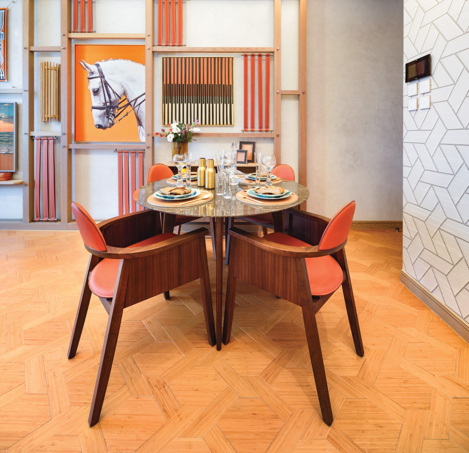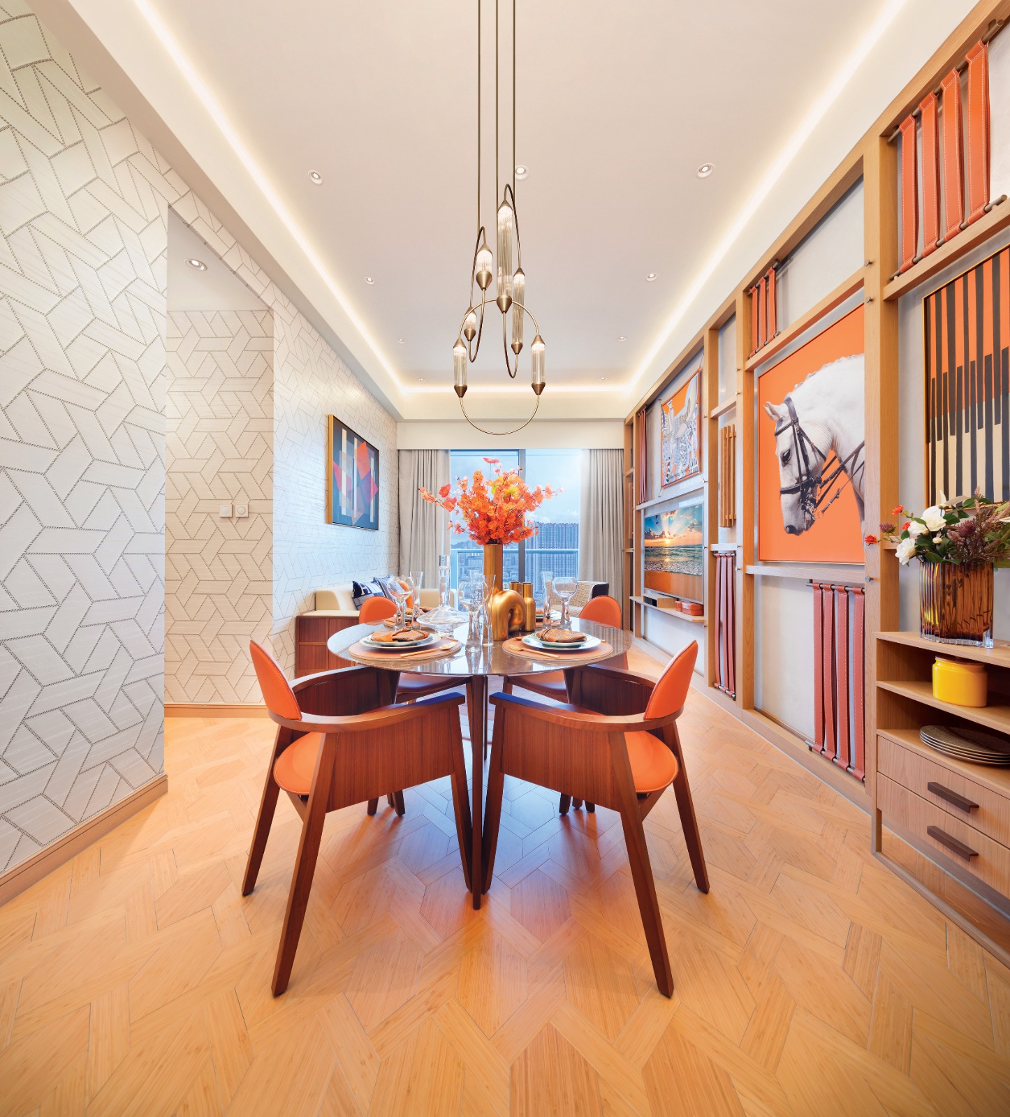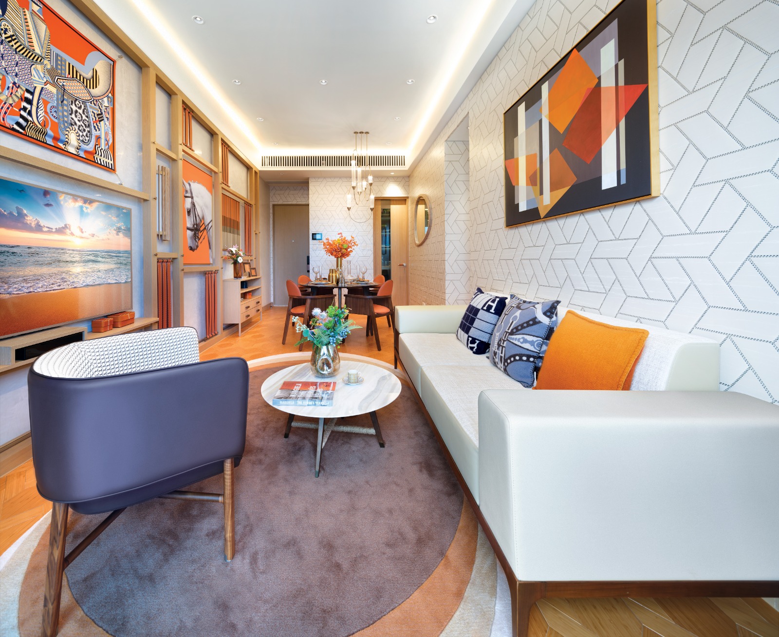恒基物業代理營業(一)部副總經理鄧鳳賢表示,設計師Norman Chan一直對法國房屋充滿熱情,特別欣賞法式設計有個性卻不造作。設計師以「永恆」為主軸,精心挑選法式設計裡的精髓及元素,完美融合單位設計內,打造精緻的法式氛圍及更高層次的生活體驗,更利用鮮艷顏色和淡黃色的橡木和深紅色的櫻桃木兩款木材,創建無限靈感及可塑性。以客廳為例,設計師利用一個類似梯子的框架在牆上創建一個圖型作品,中間的空位擺放電視及電視櫃、再以圍巾及藝術品為裝飾,增添法式生活品味。除此之外,精緻、優雅而有格調的法國擺設更是無處不在,當中工匠們精湛的工藝與使用的材料使永恆的氣質無縫重現。