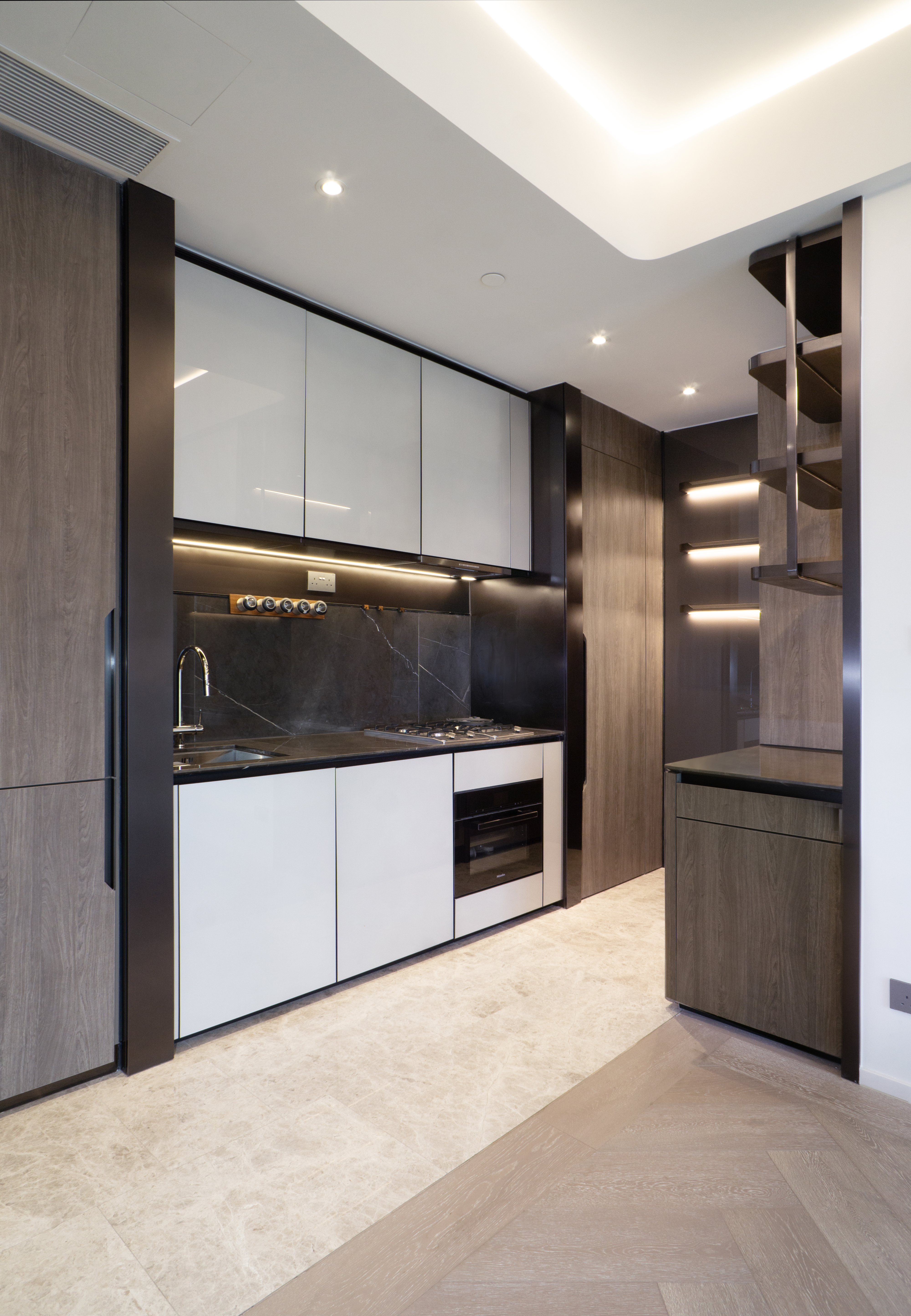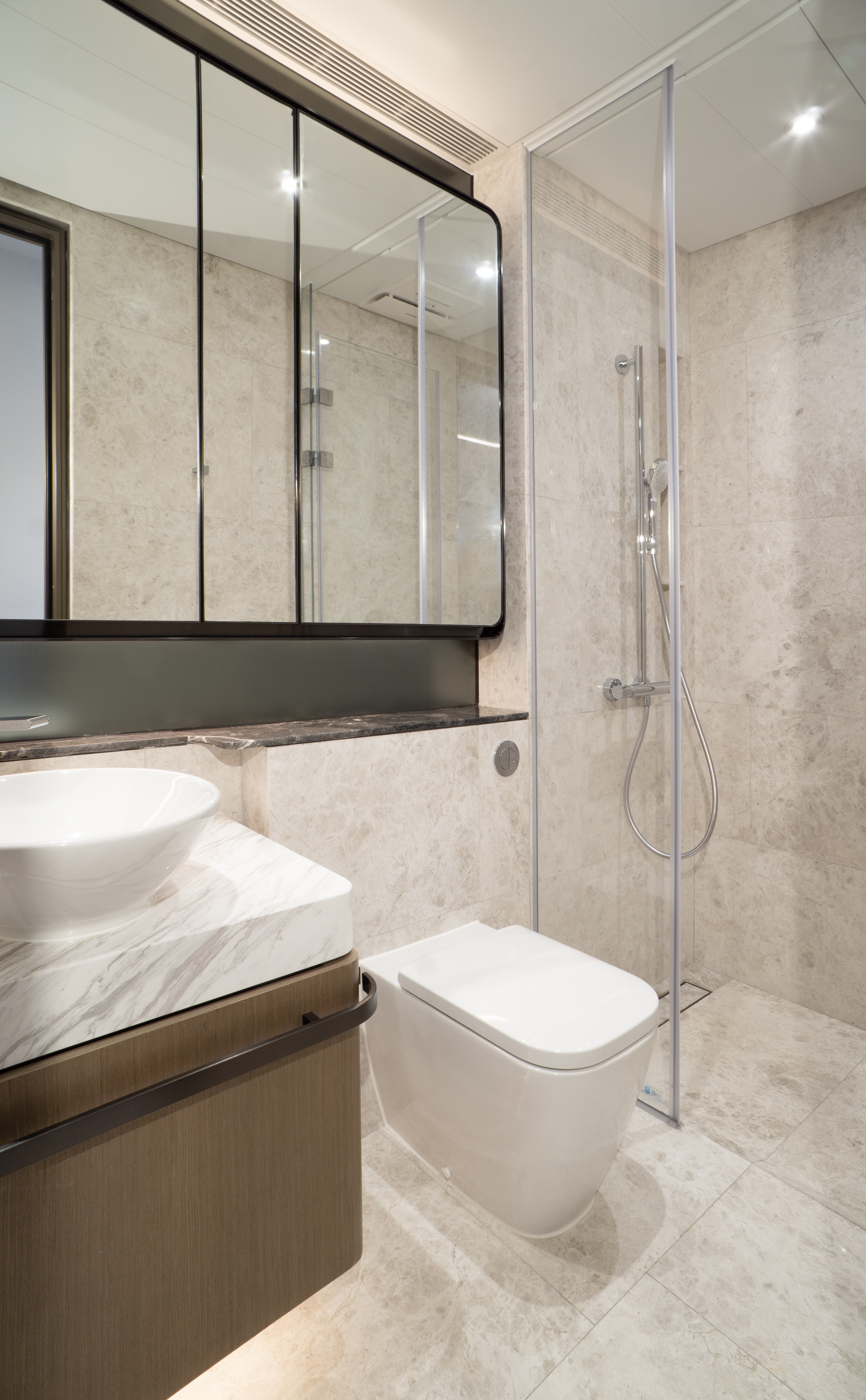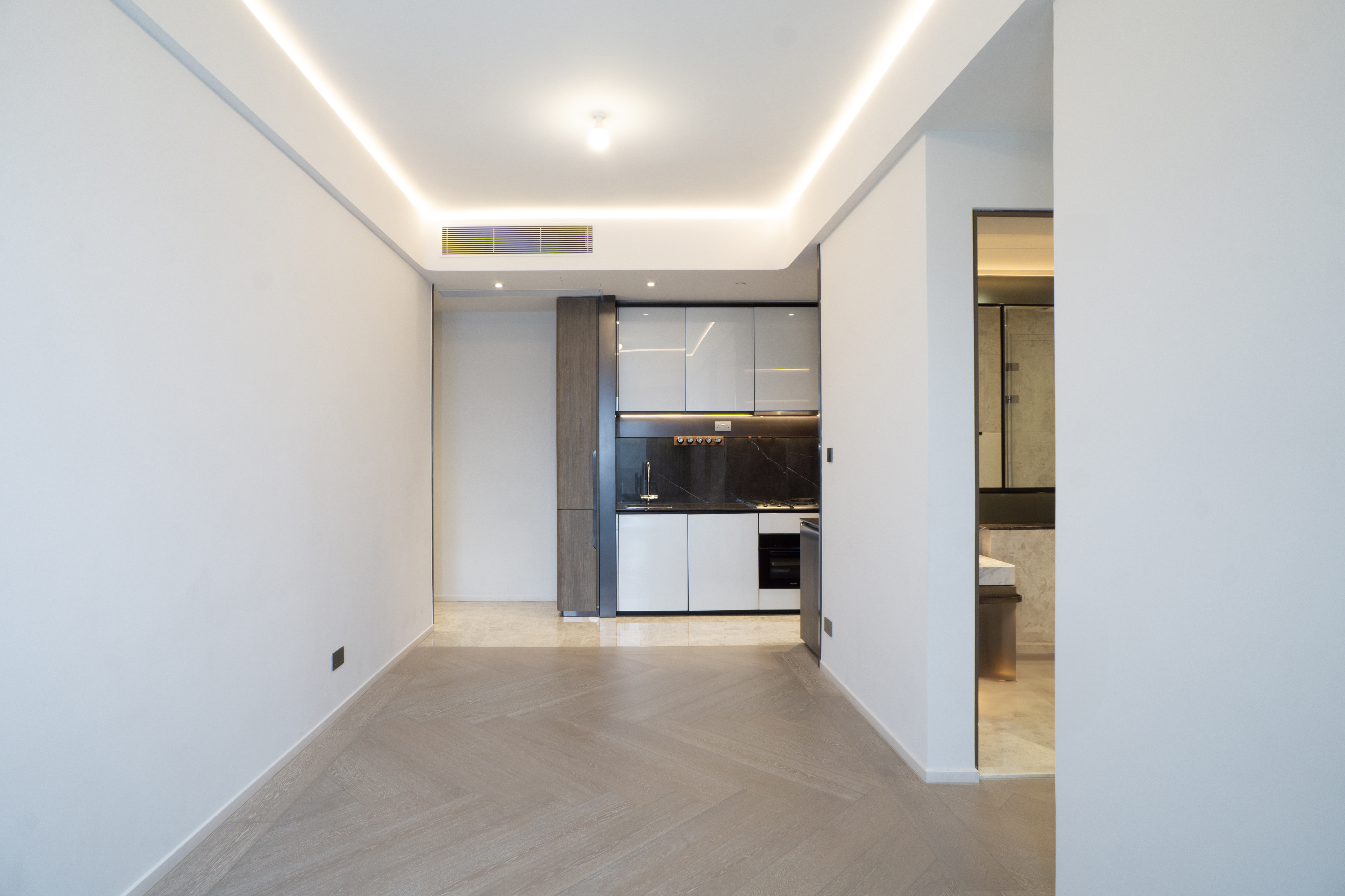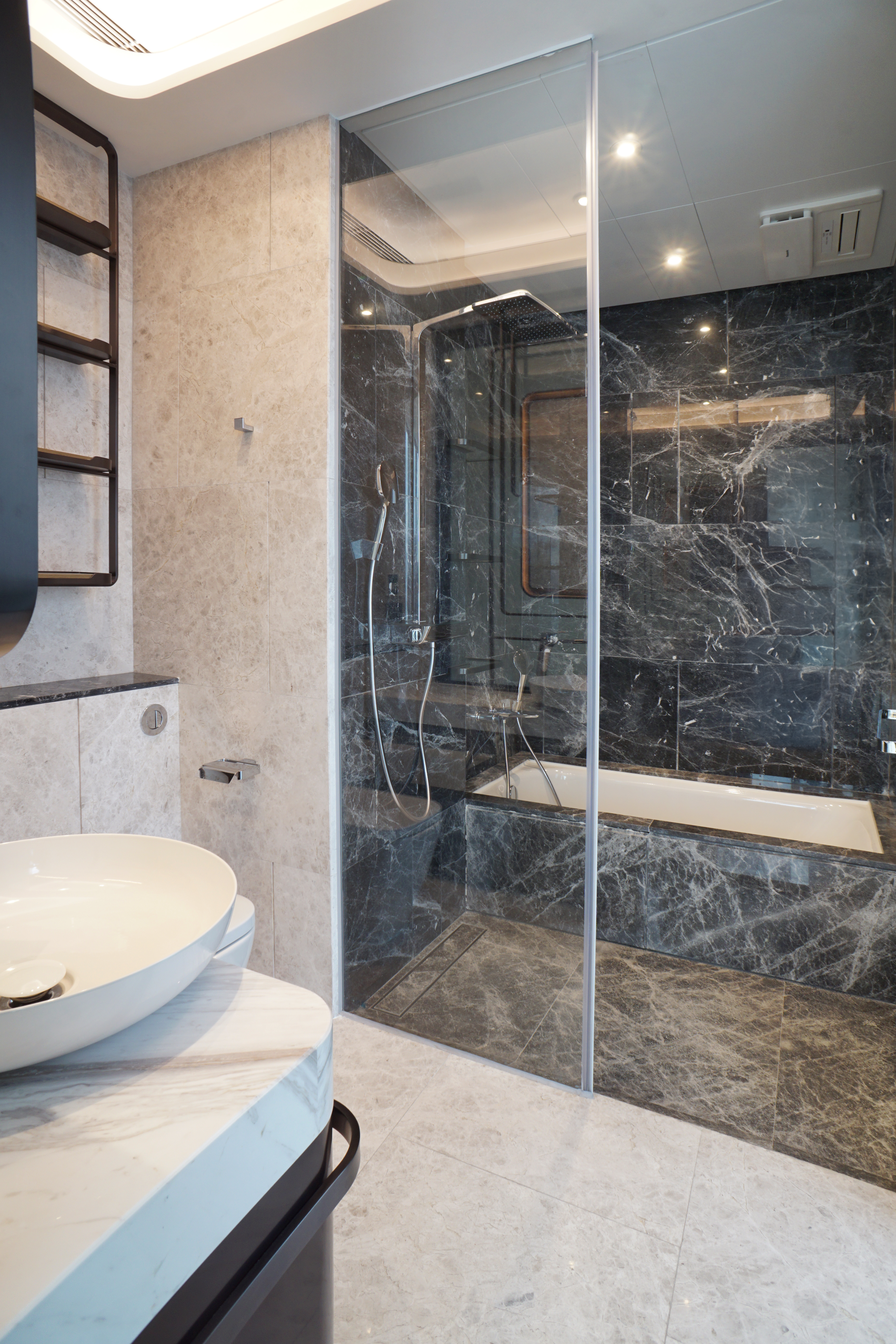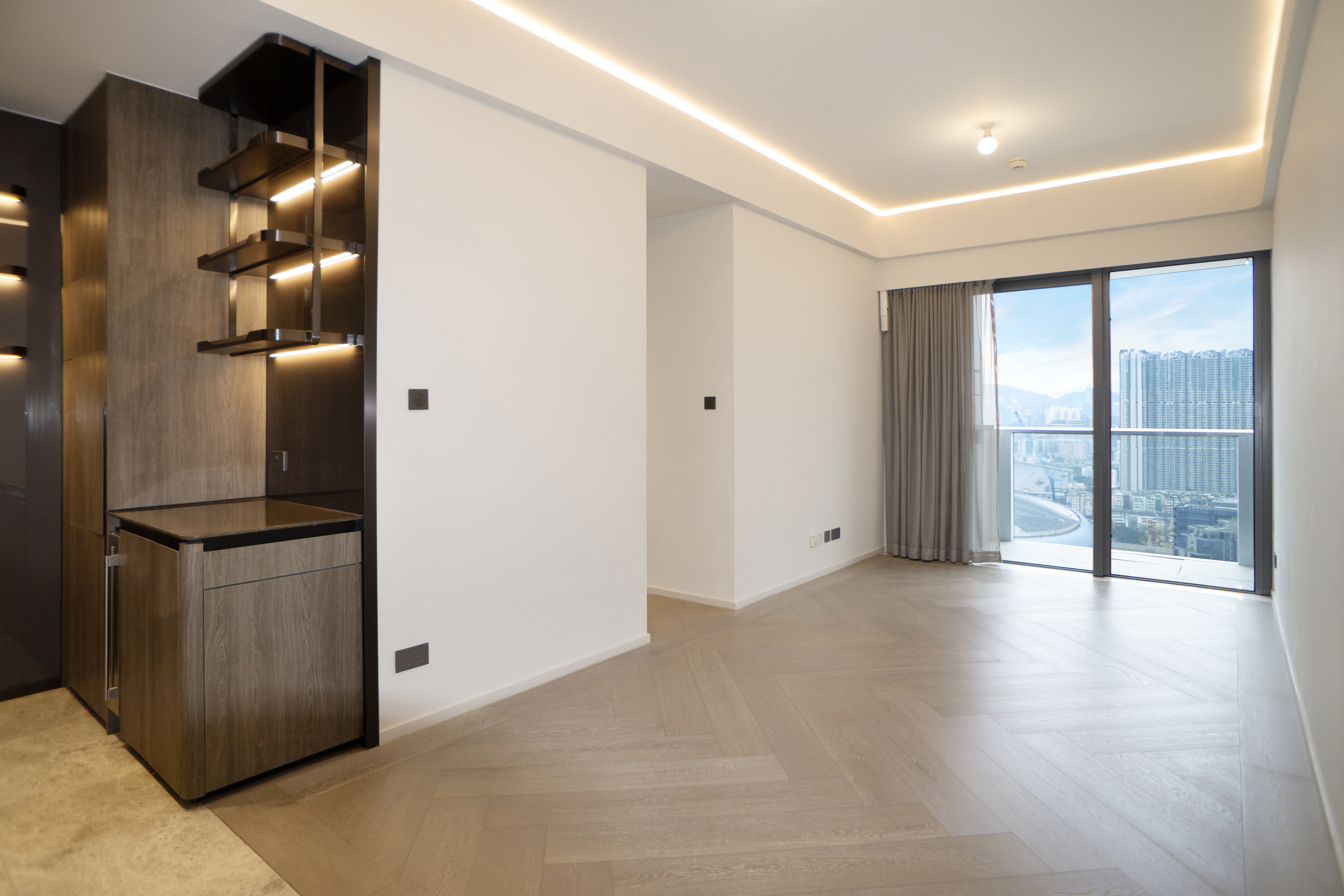 今日項目開放第1座36樓A室現樓示位予傳媒參觀,單位屬套三房間隔,實用面積888方呎,另附衣帽間及工作間。單位闊落的大廳設有長逾16米的落地玻璃窗,配以維港海景及啟德體育園的景觀,視覺空間非常吸引遼闊。至於單位的主人套房同樣擁有落地玻璃,弧形的設計帶來超廣角闊銀幕的視覺效果,加上房內配備意大利LEMA多功能衣帽間,在各種精緻裝潢和細節設計配合下,令單位增添不少氣派格調。