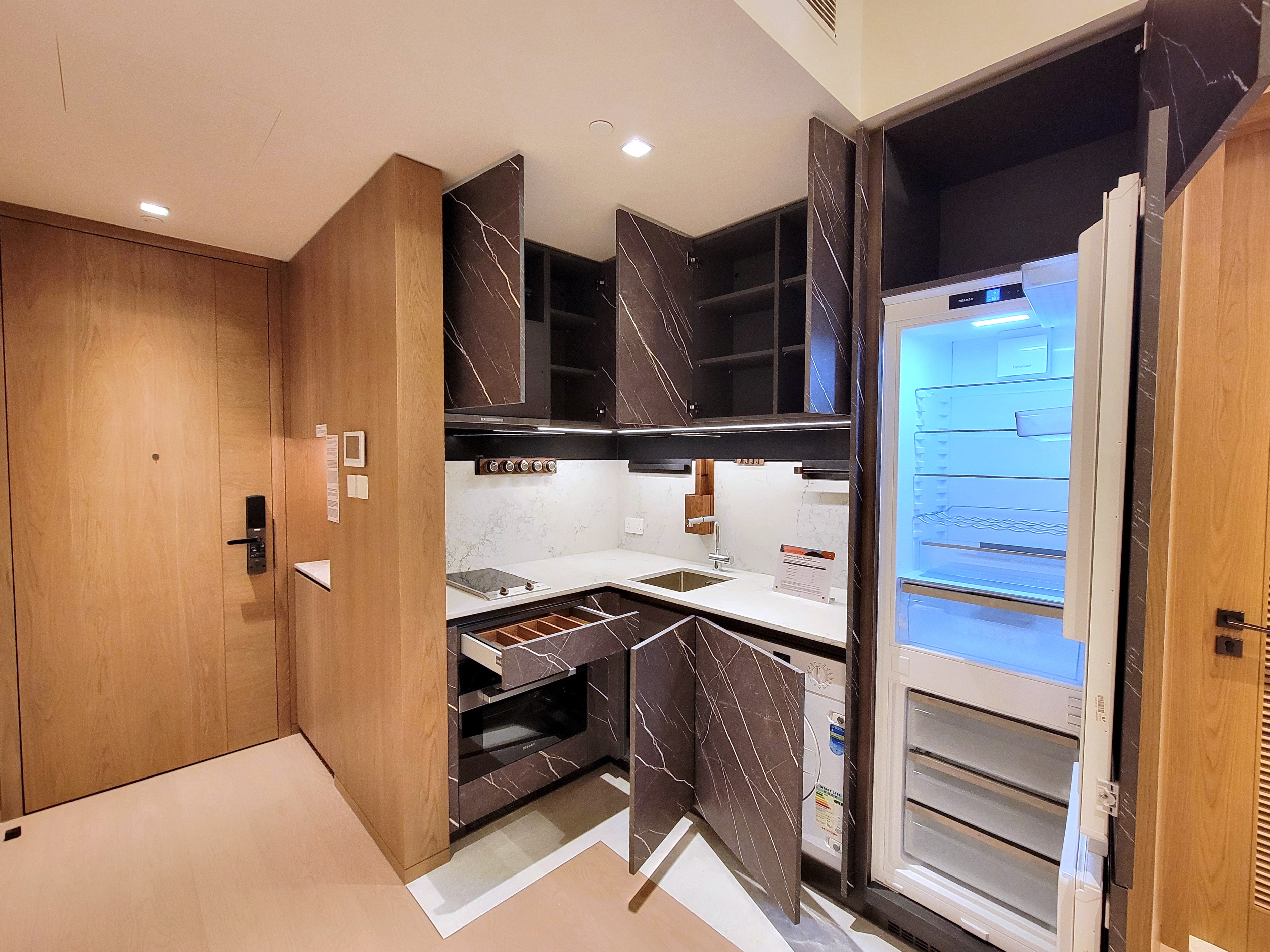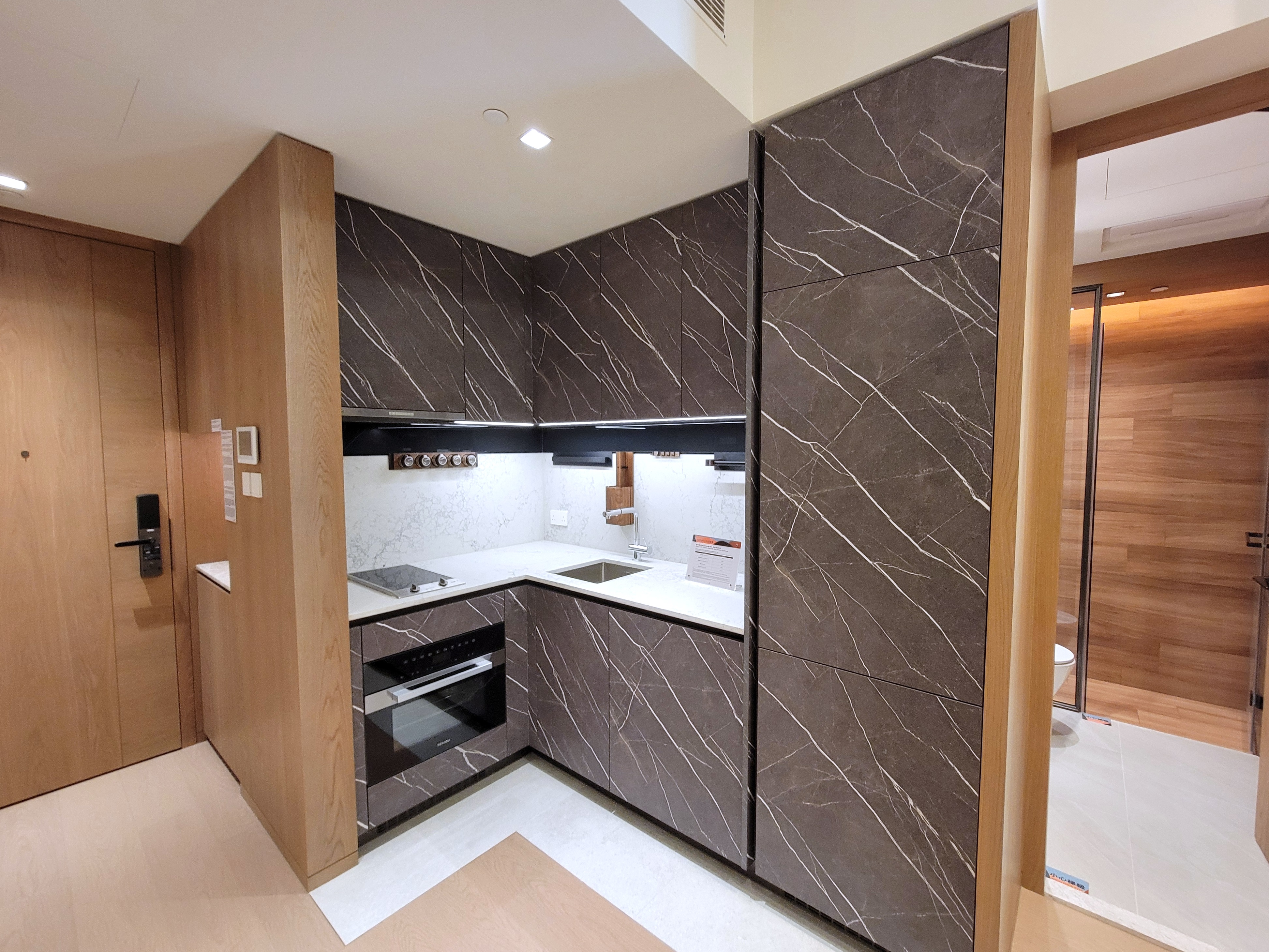 單位廚廁均採用「Japandi」設計風格,透過結合日本和風美學和北歐極簡主義的設計,營造一個平靜、舒適且現代的居住環境。開放式廚房用料講究且空間感十足,帶有個性的深灰色石紋廚櫃面板與特大L型淺色檯面結合。配備一系列著名德國品牌Miele的電器,包括雙頭電磁爐、抽油煙機、蒸焗爐及雪櫃,而鋅盤及水龍頭則採用瑞士品牌Franke同意大利品牌Gessi,選材用料盡顯氣派。