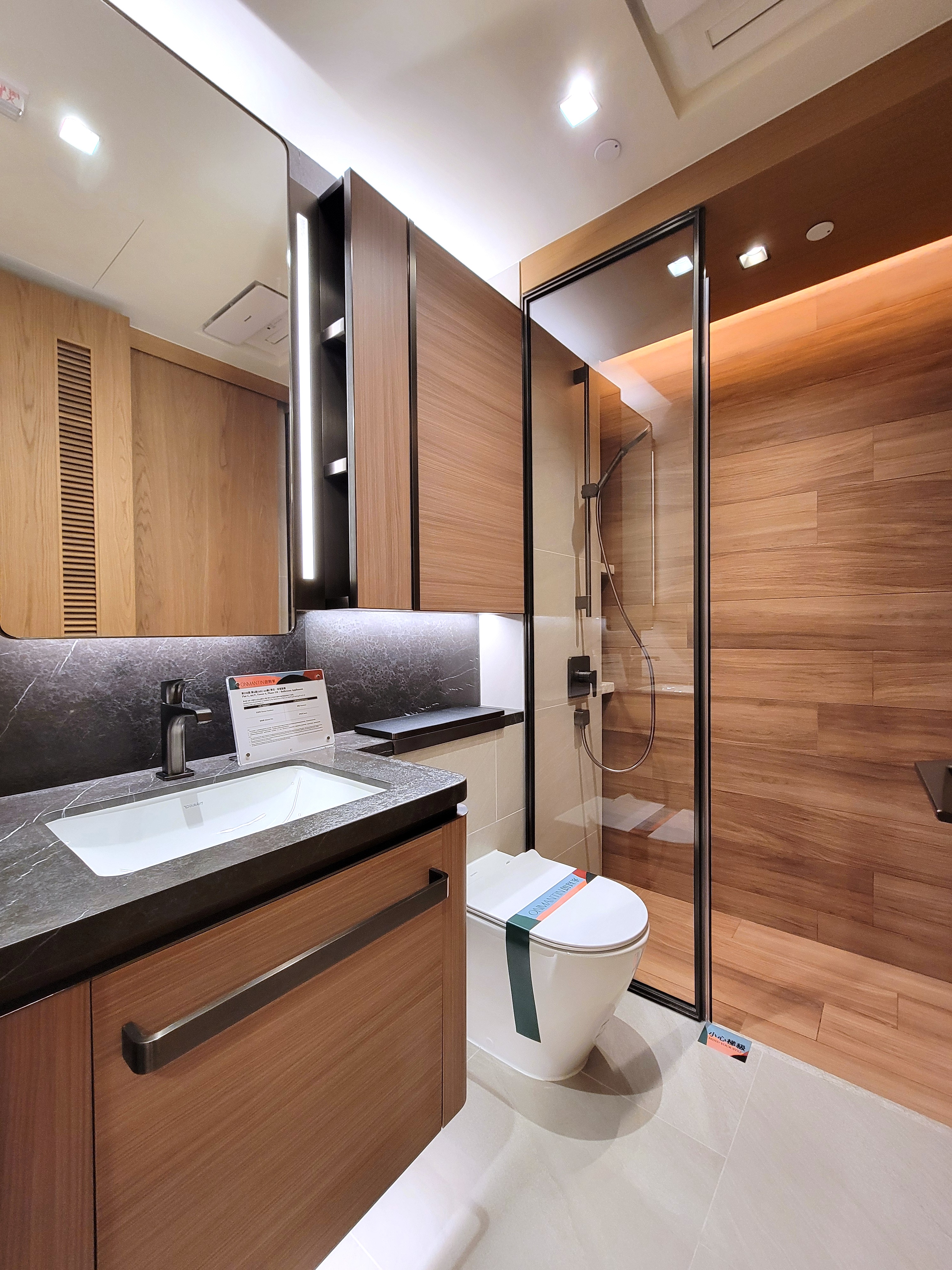 浴室「一廁雙門,客套雙用」靈活運用,收納空間充足,牆身鋪砌天然石材。鏡櫃及儲物櫃配以優美線條,加上雅緻的木紋牆身,時尚而柔和。此外,浴室潔具均採用德國知名品牌AXOR及Duravit,亦特別配置Panasonic浴室寶。