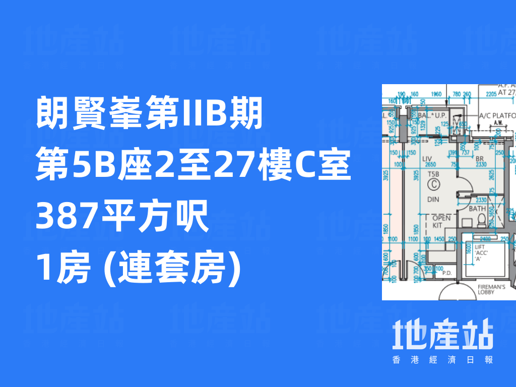 朗賢峯所有1房戶均位於第IIB期,共有198伙,實用面積介乎377至388平方呎,佔全盤990伙約兩成,分布於第5A座2至27樓C室、第5B座2至27樓C、D、E室、第6A座2至27樓D、E室,以及第6B座C、D、E室。全數1房戶均為連套房設計,設開放式廚房,並外連露台。