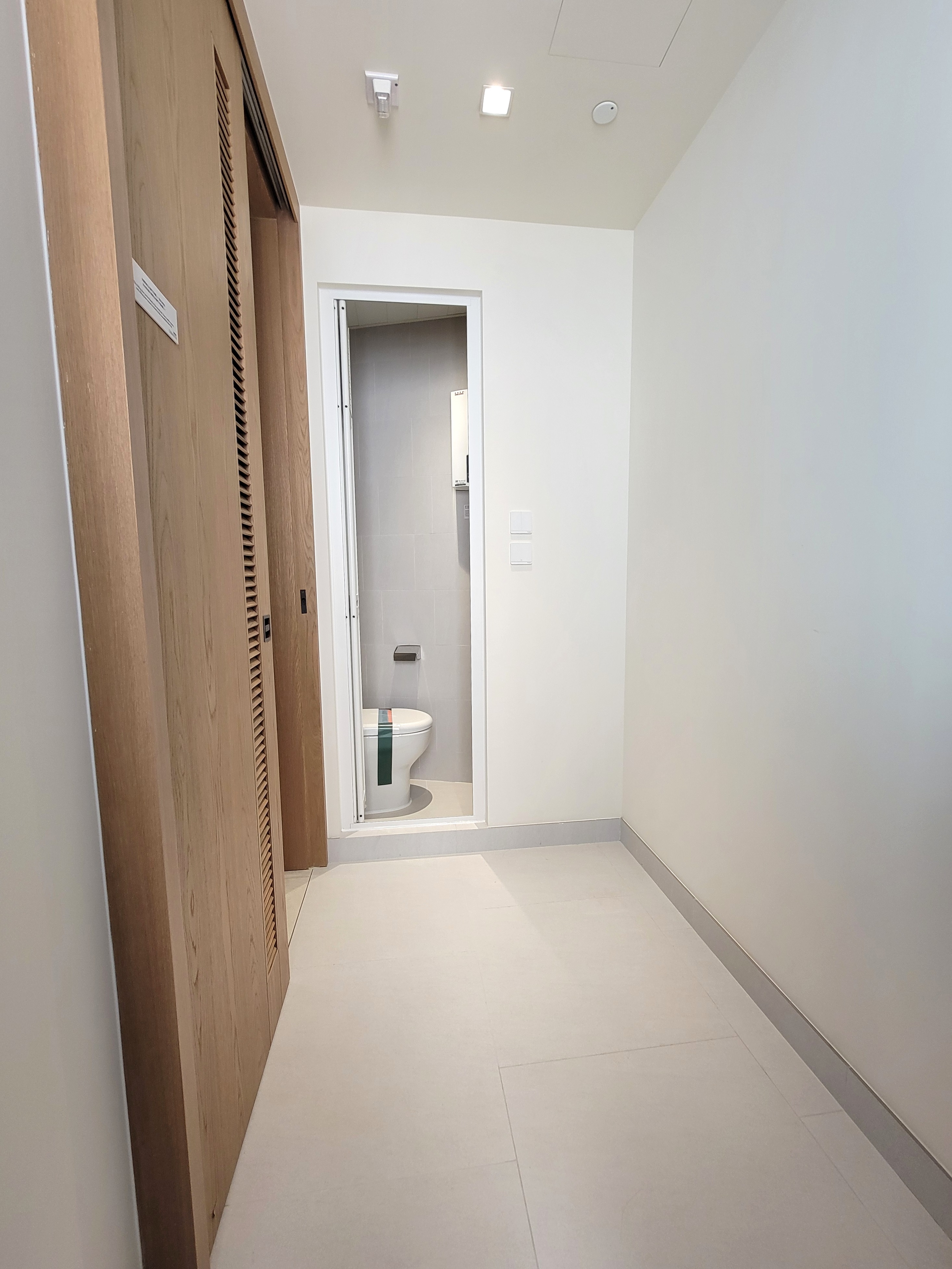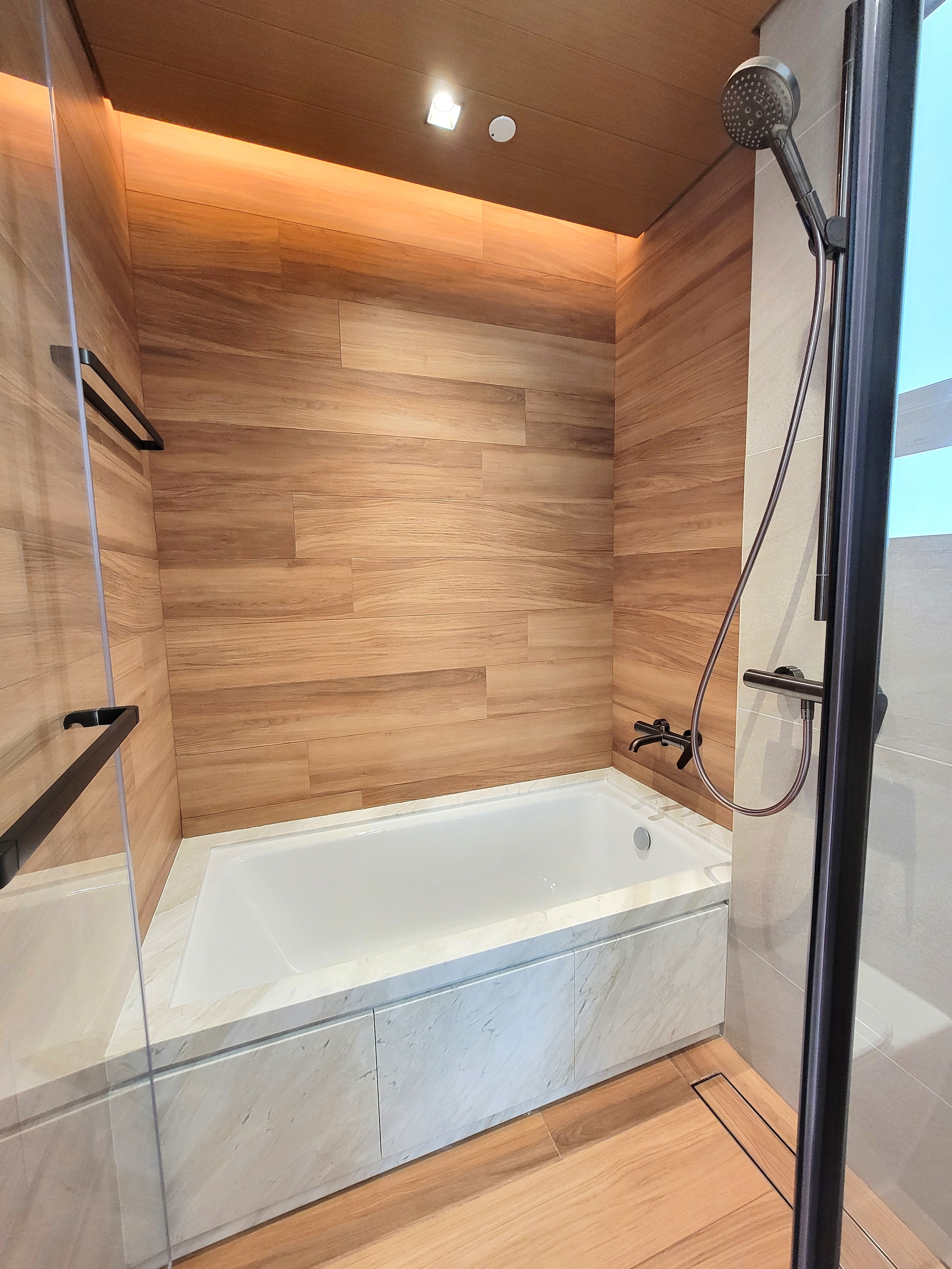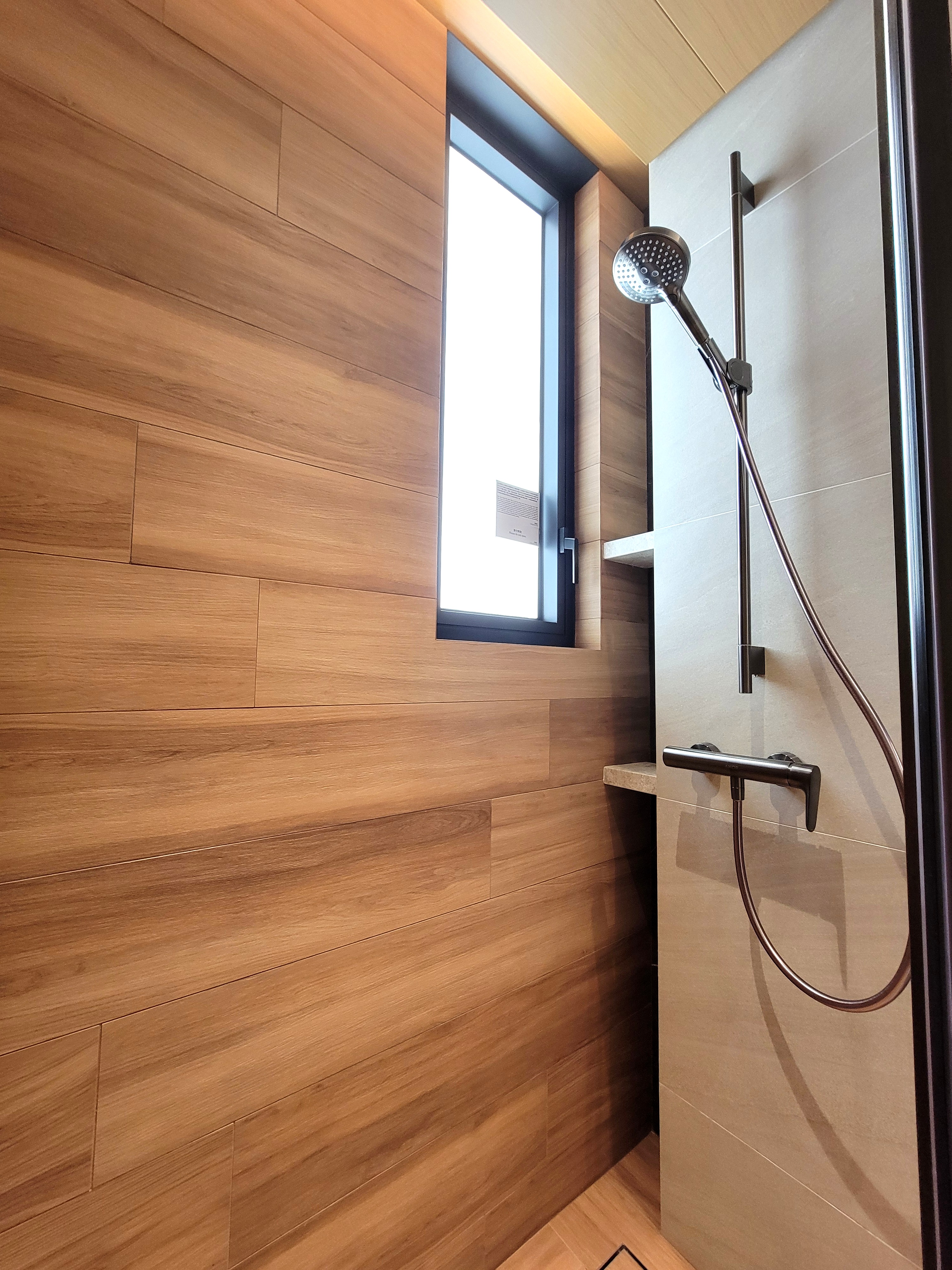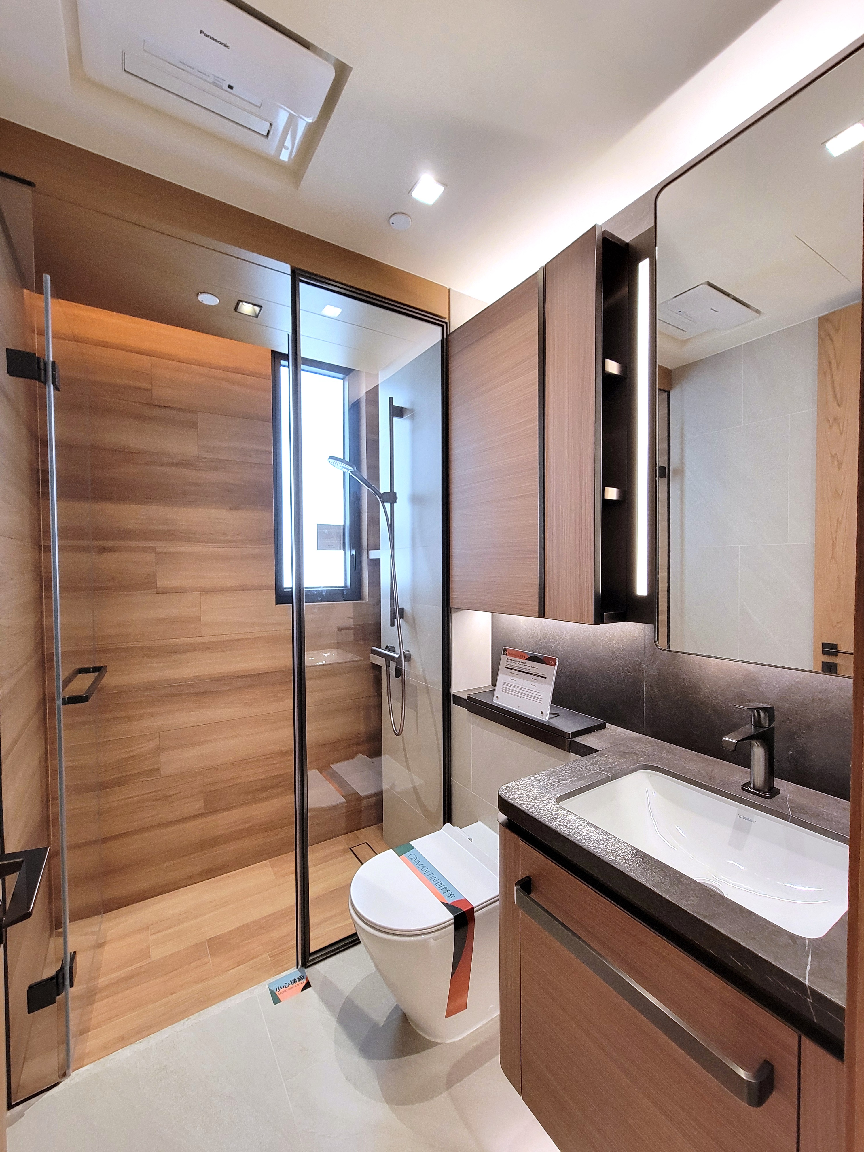 浴室設有窗戶,屬「明廁」設計,增強空氣流通。浴室配備德國知名品牌AXOR及Duravit潔具。鏡櫃及儲物櫃則配以優美線條、雅緻的木紋牆身、儲物櫃,時尚而柔和;更特別配置Panasonic浴室寶。