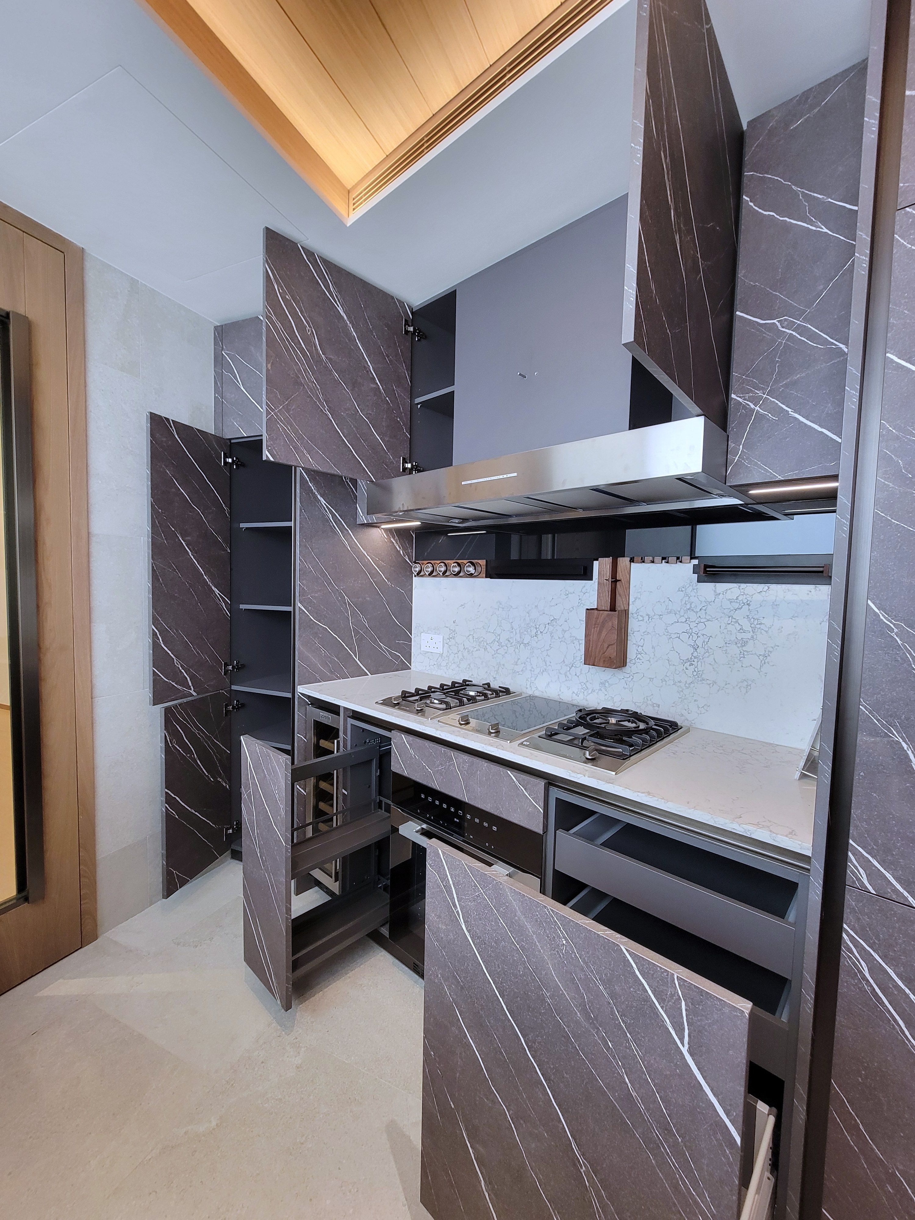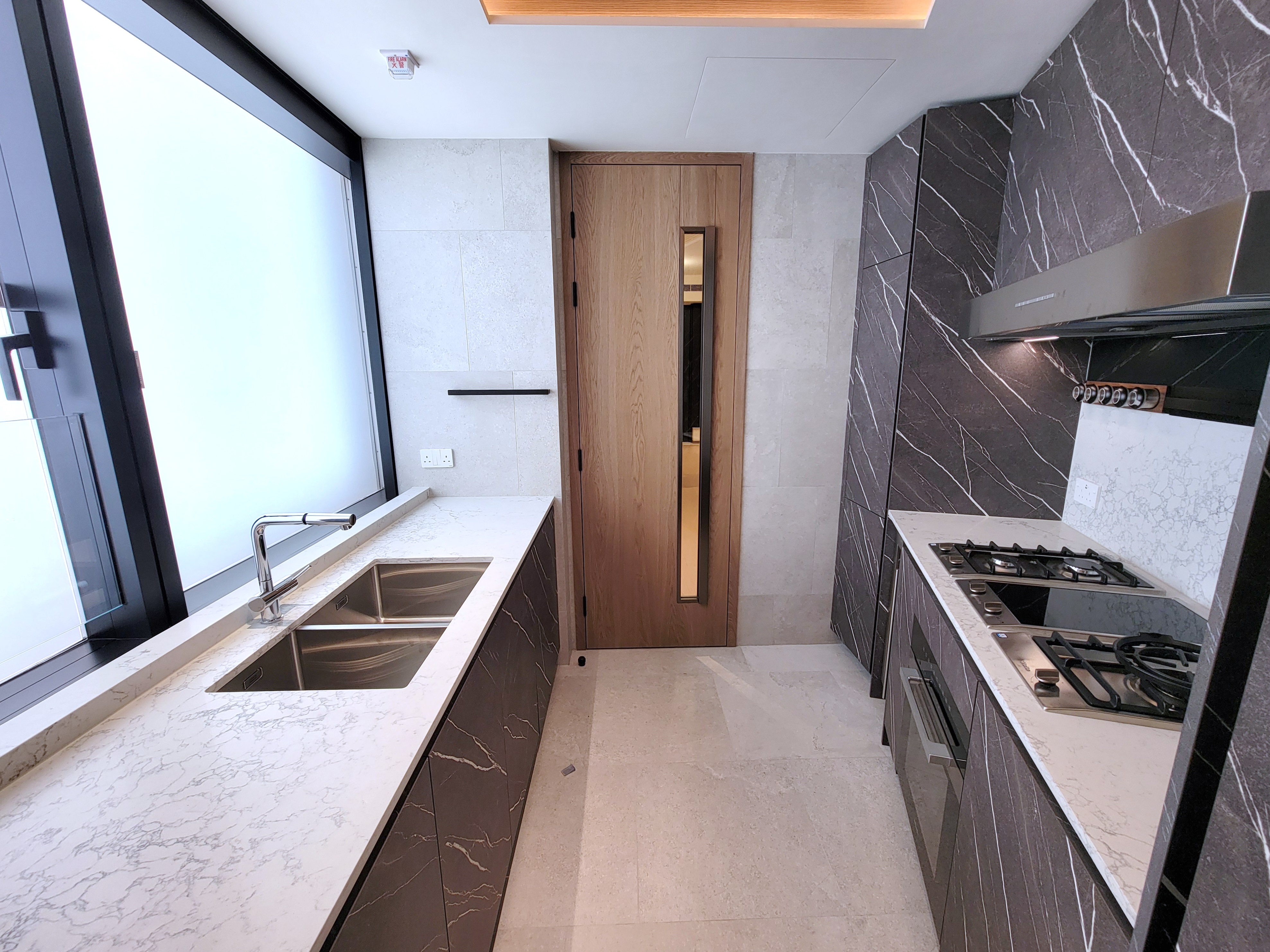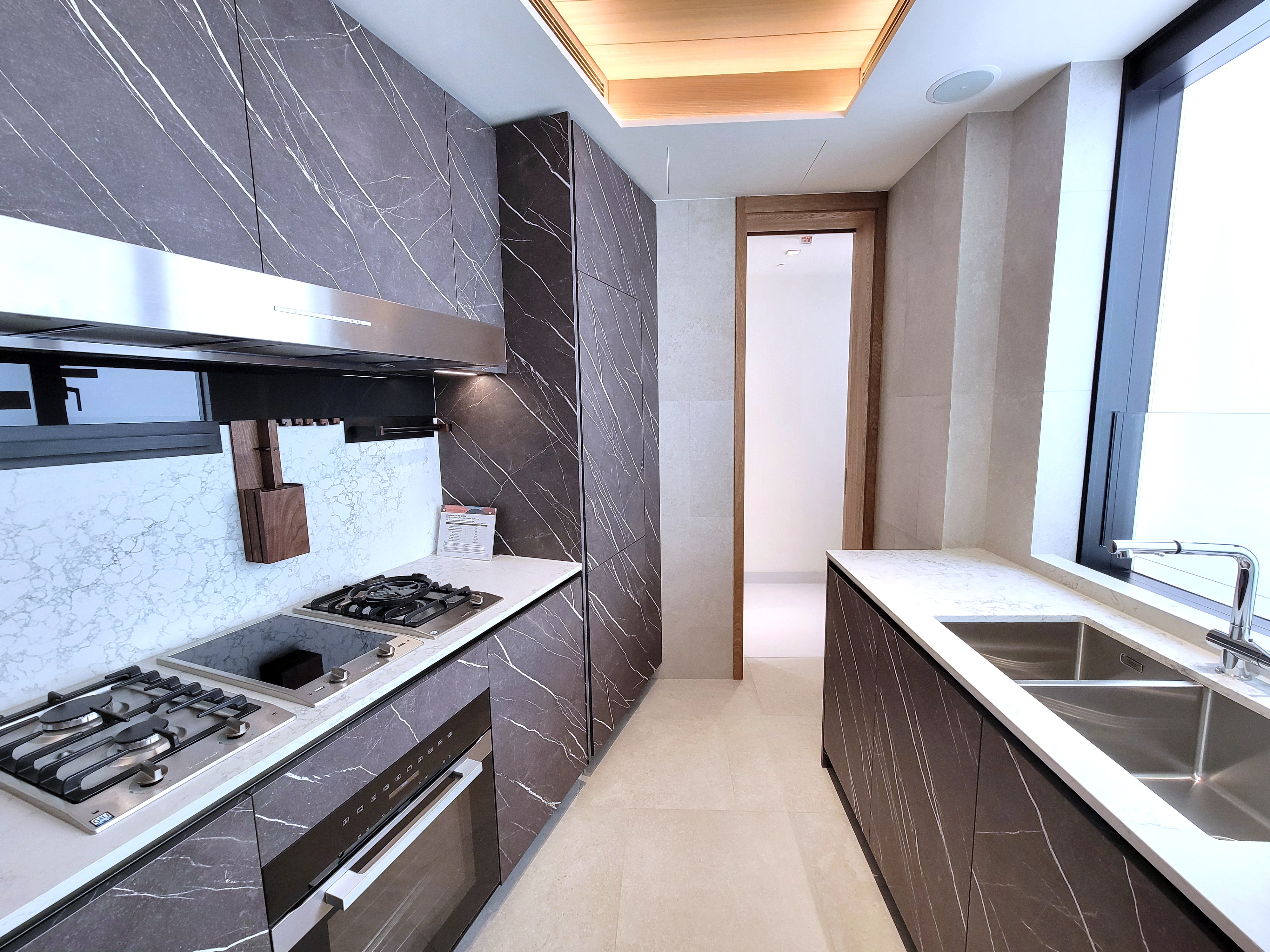 單位廚房及浴室均採用「Japandi」設計風格,透過結合日本和風美學和北歐極簡主義的設計,營造一個平靜、舒適且現代的居住環境。廚房配備雙邊工作枱面提供足夠煮食及備餐空間,帶有個性的深灰色石紋廚櫃面板與淺色檯面結合,令整個烹飪空間更有獨特個性。至於廚房內的抽油煙機、煤氣煮食爐、兩頭電磁爐、蒸焗爐及雪櫃均採用德國知名品牌Miele,酒櫃及洗衣乾衣機則採用歐洲知名品牌Gorenje;而鋅盤及水龍頭則採用瑞士品牌Franke同意大利品牌Gessi。此外,廚房連接工作間及洗手間,並外接工作平台及冷氣機平台,提供充足空間。