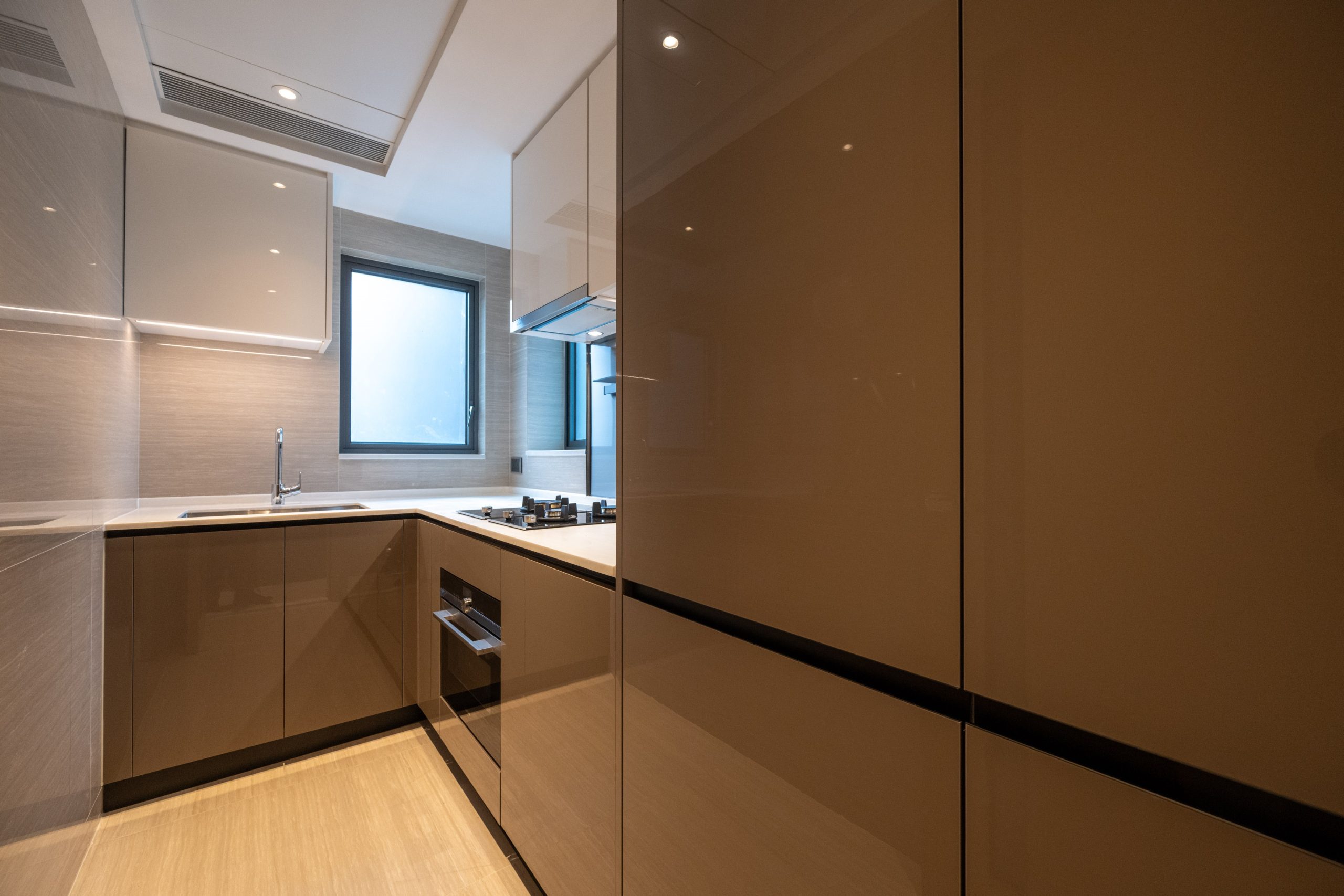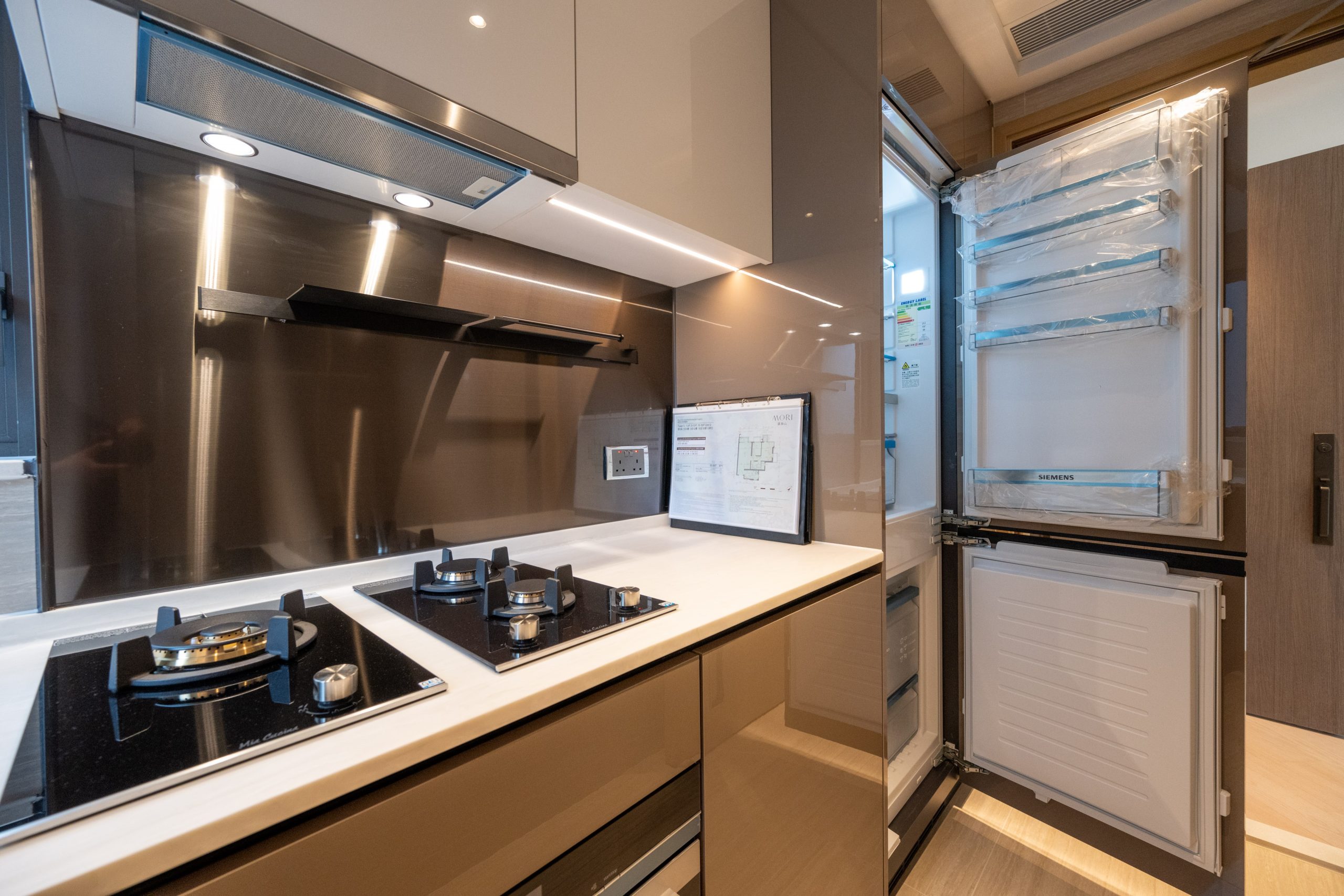 長方型梗廚設有L型工作枱面,櫥櫃更暗藏抽拉式調味料架,提供足夠儲物空間。廚房配備Mia Cucina氣體煮食爐及抽油煙機,德國著名家電品牌Siemens雪櫃、洗衣乾衣機,更設有蒸焗爐以提供健康煮食。