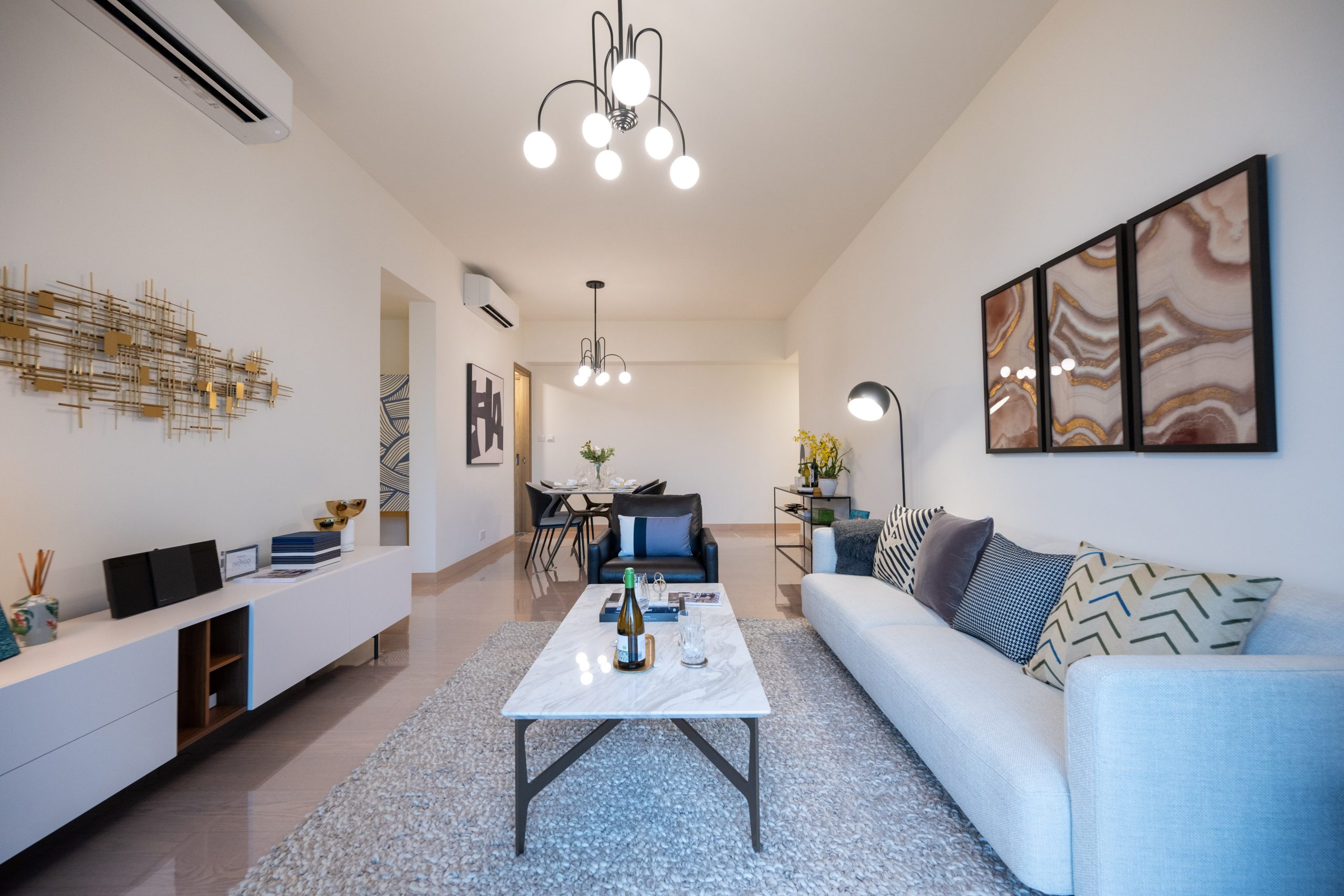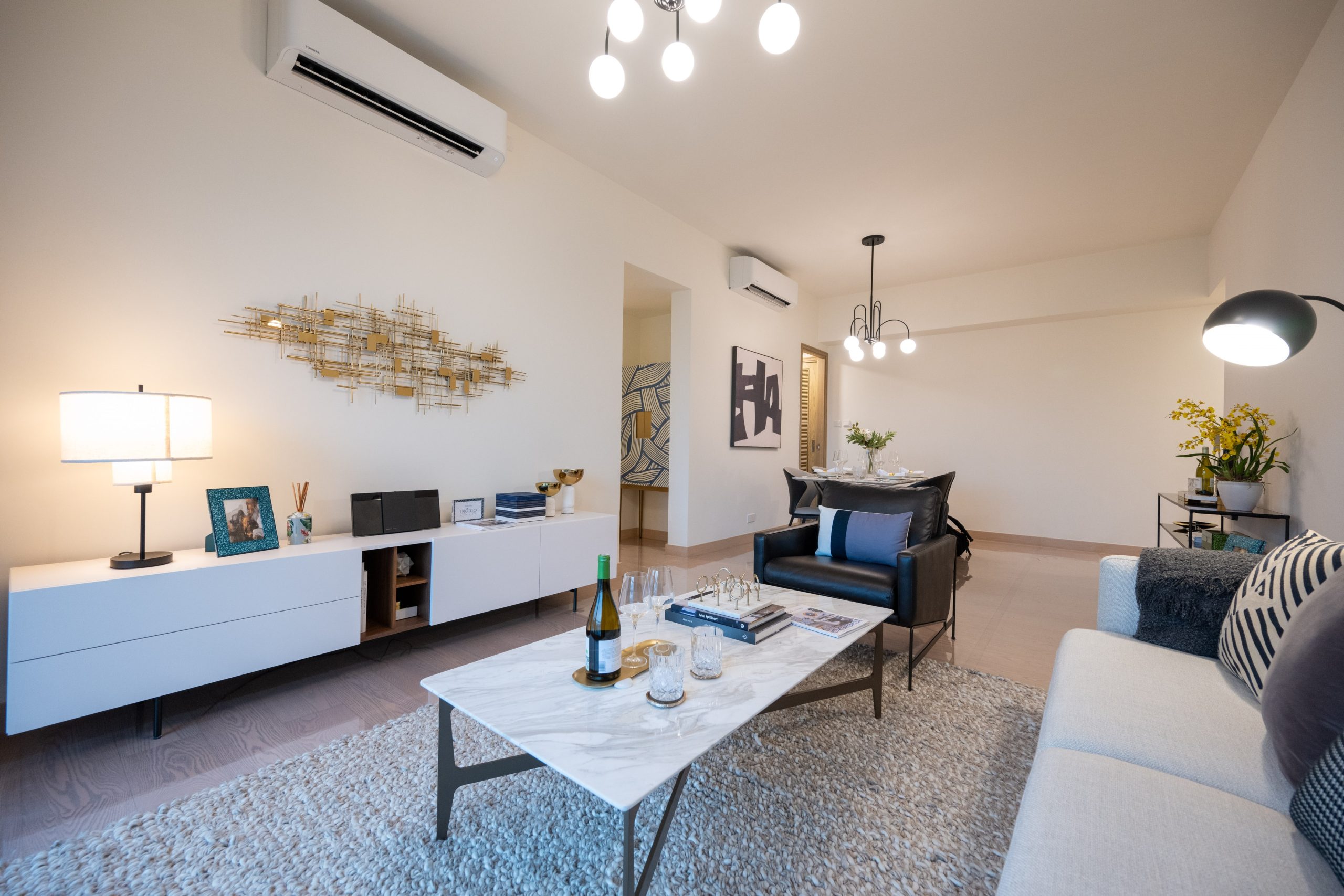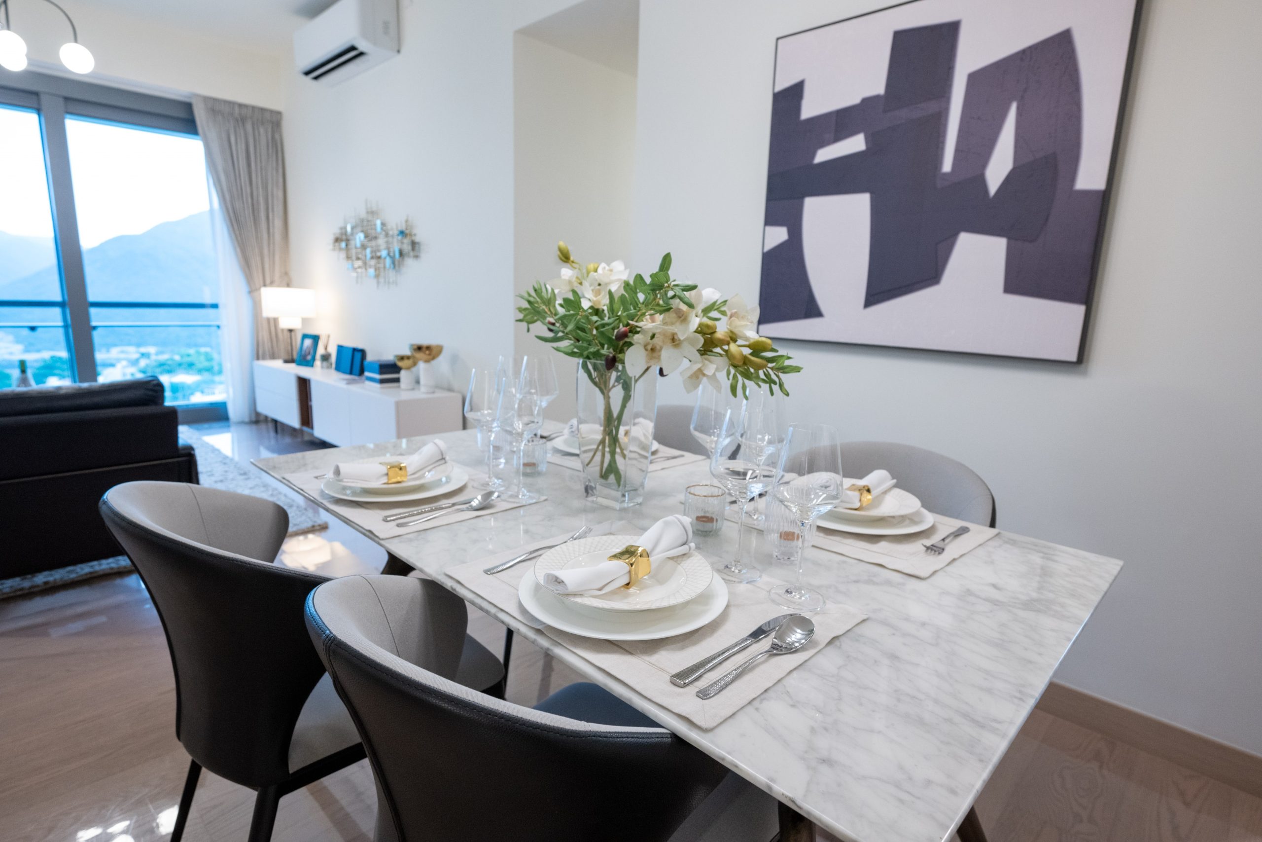 客廳及飯廳共長約24呎、闊約12呎,空間感十足;客廳設有落地玻璃敞門連約43方呎露台,採光度極高,盡享開揚景觀,遠眺沙田馬場及城門河;客飯廳以米白牆身為主,並以米黃色的地磚,帶出溫暖感覺;茶几及飯桌是白色紋路的天然雲石,令客廳及飯廳更顯優雅及貴氣。
