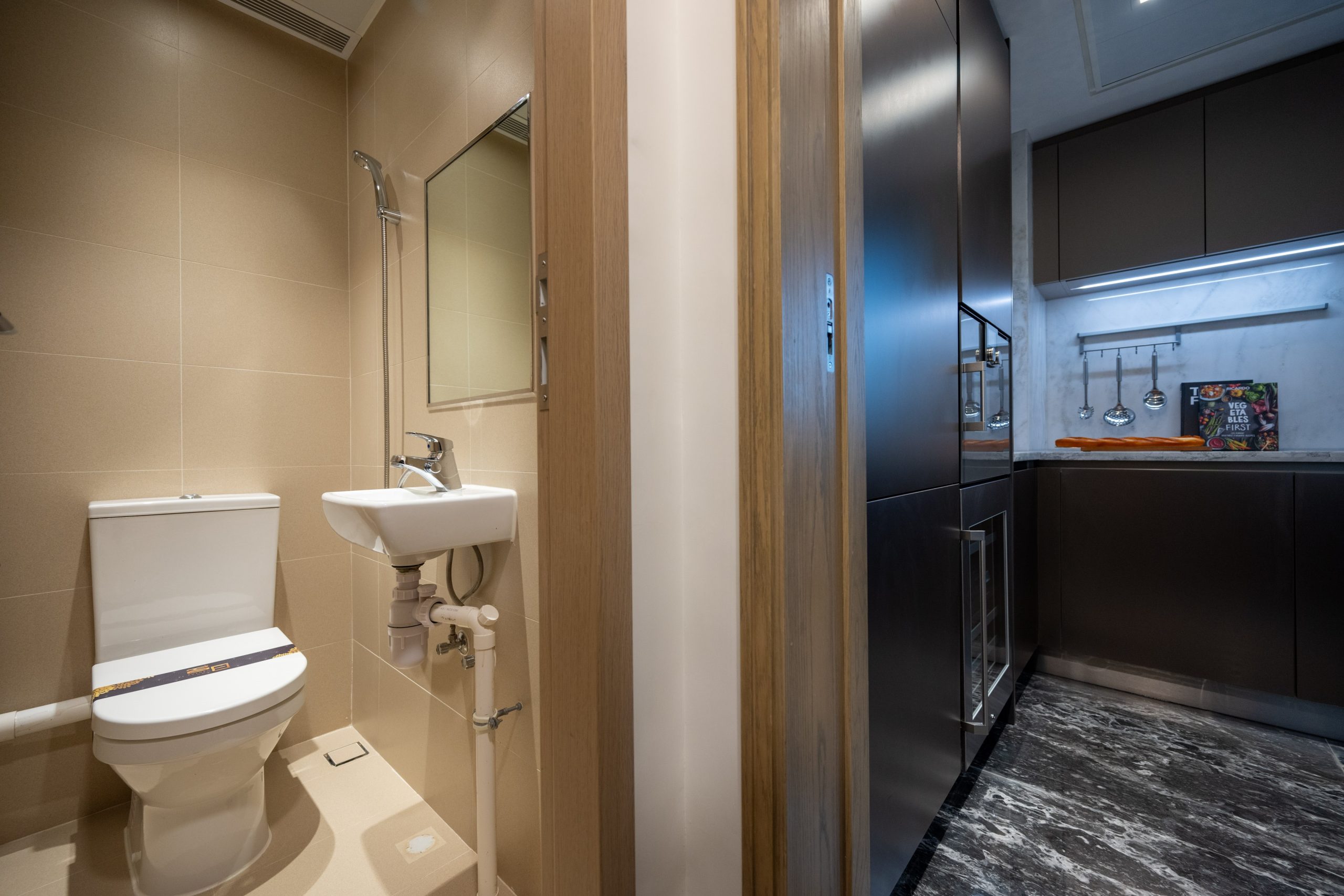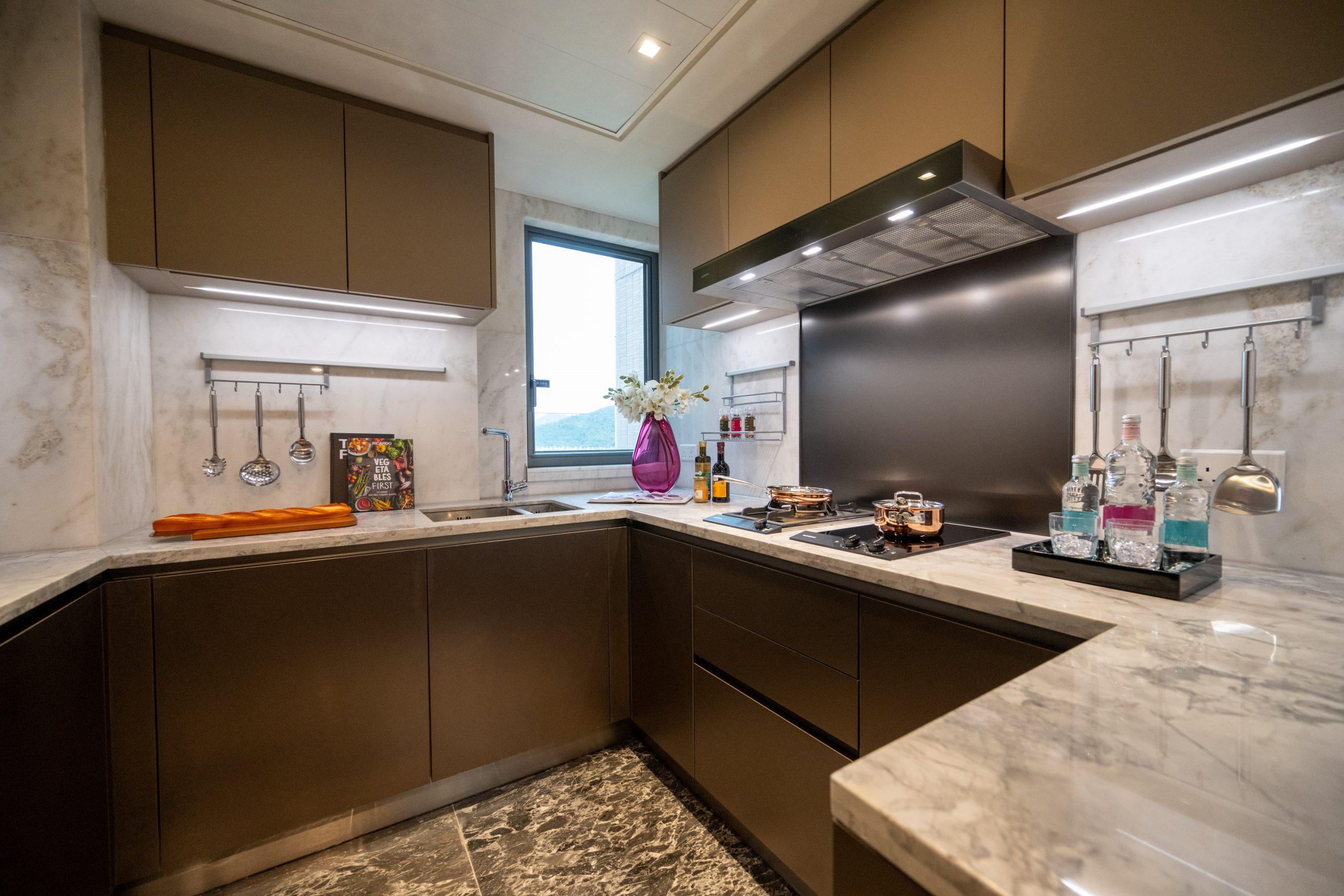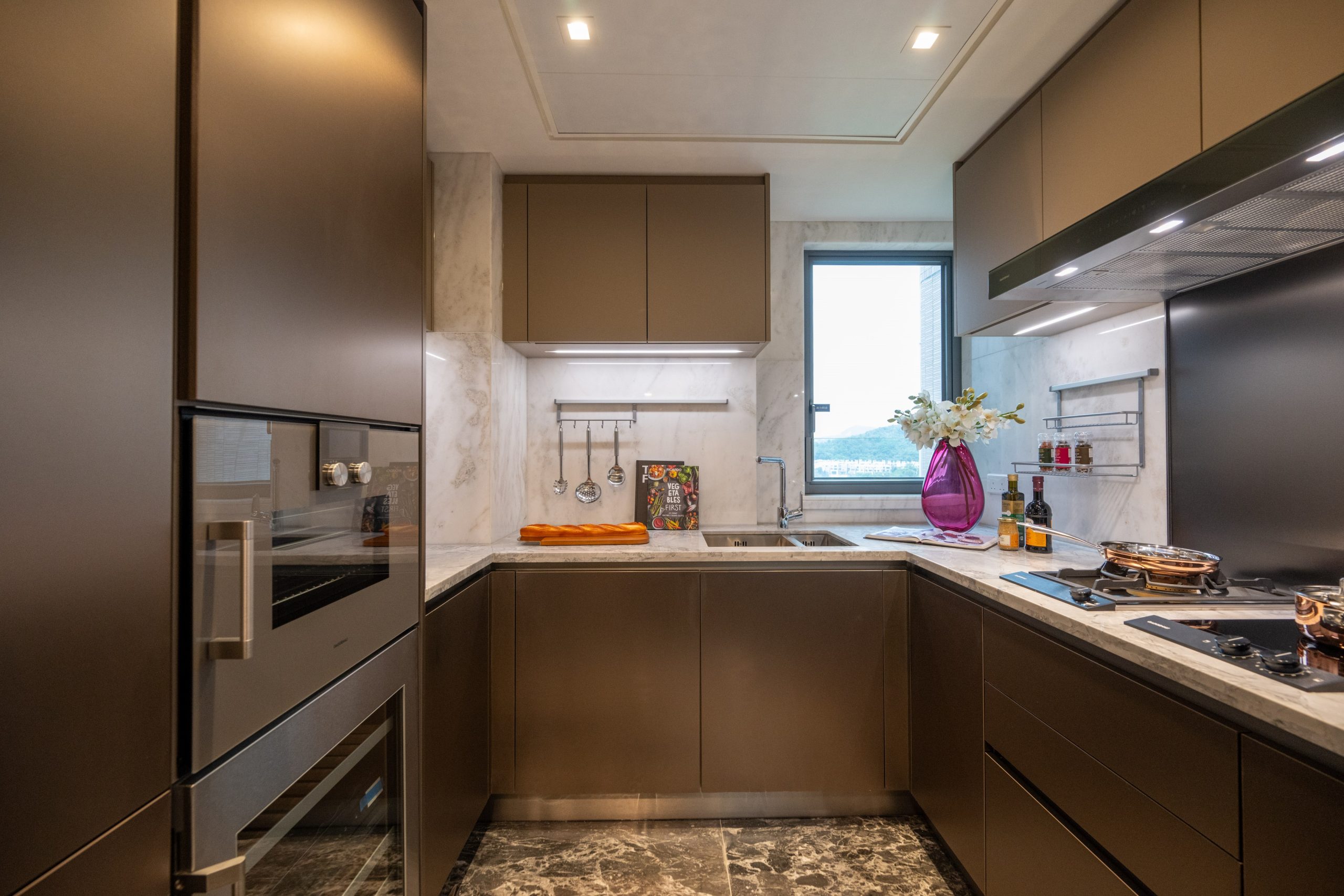 廚房方面,交樓標準單位配備了全套德國殿堂級家電品牌 Gaggenau,包括煤氣煮食爐、蒸焗爐、電磁爐、抽油煙機、蒸焗爐、酒櫃、雪櫃及洗衣乾衣機;廚櫃採用擁有超過36年千錘百鍊的意大利著名品牌Arredo3,百分百意大利製造,吊櫃使用 FENIX門板,物料上乘。