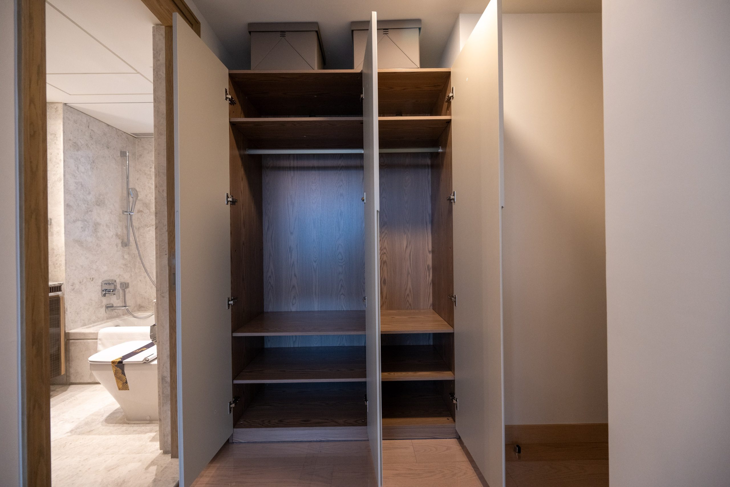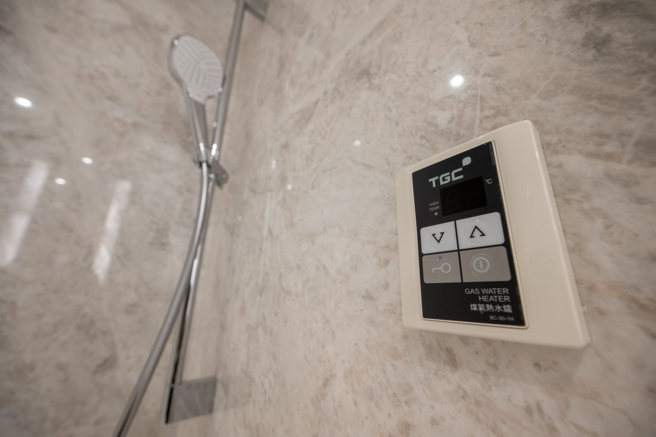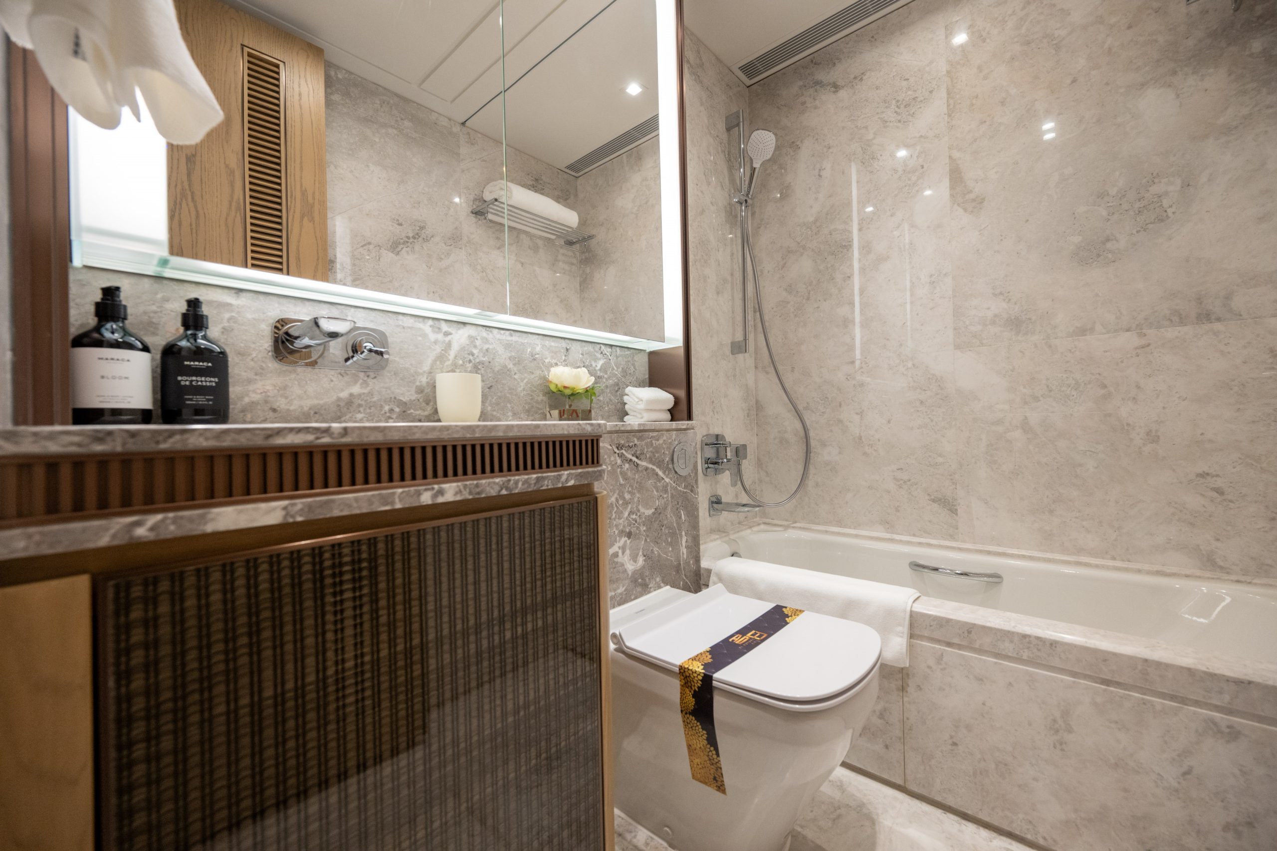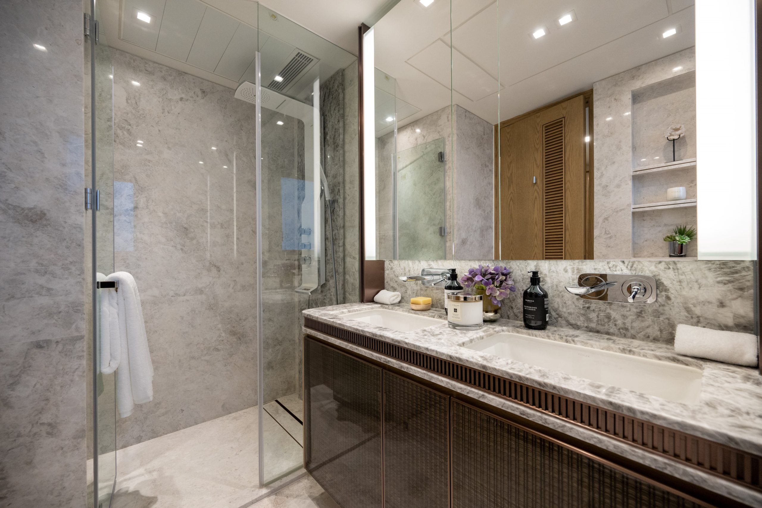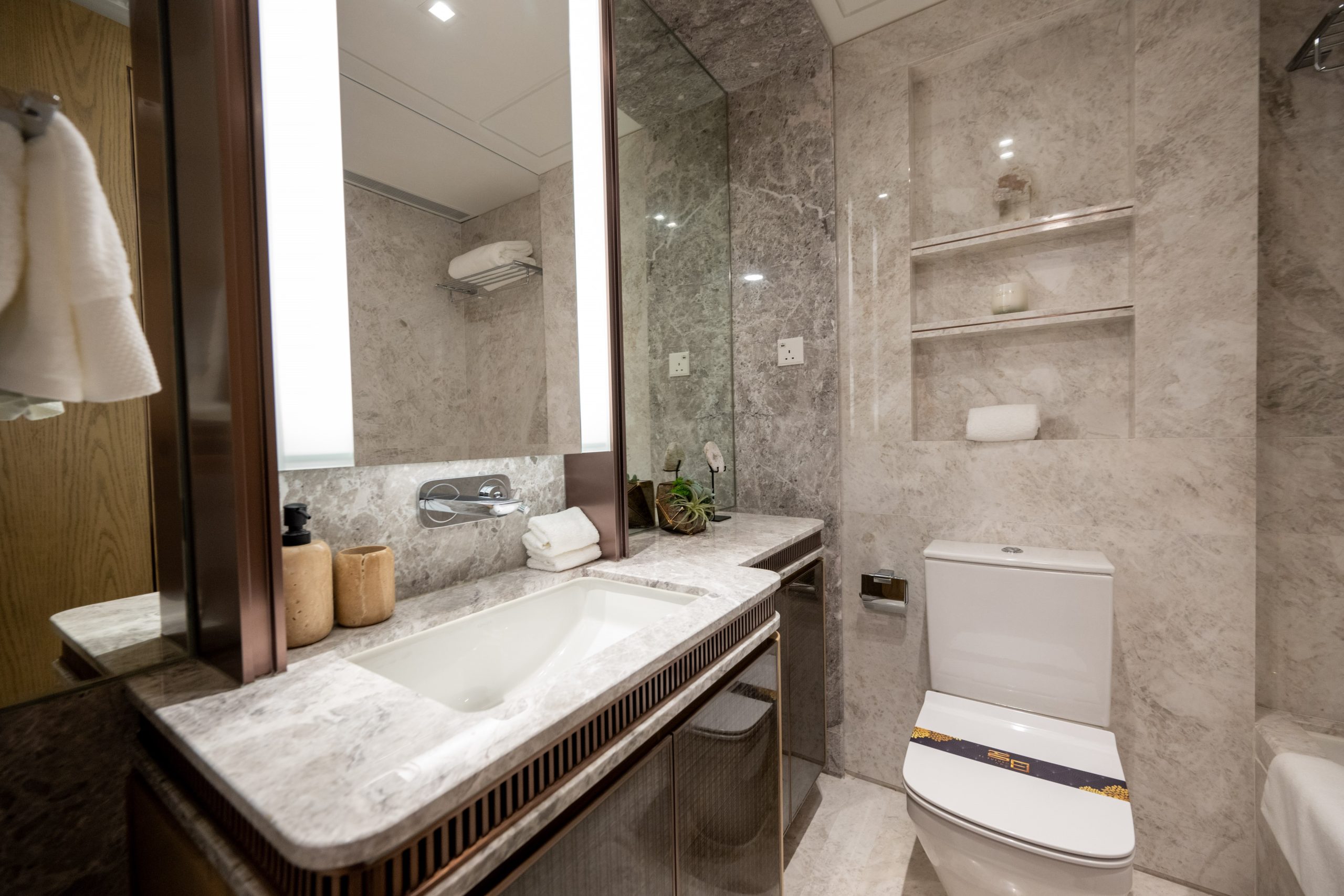 主人房浴室設有特大的梳妝鏡,雙洗手盆及浴缸設計,並設有入牆式的層架裝置;簡潔的白色天然雲石,併上雲石舖砌的特色牆身,令整體浴室空間感大大提升。配備了多個歐洲知名品牌,包括德國品牌Hansgrohe花灑及水龍頭、德國品牌BETTE浴缸、德國品牌Duravit坐廁、美國品牌Kohler及法國品牌Bain d’Or面盆等。