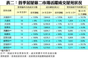 按物業價值劃分(見表一),首季5個組別交投量按季錄得上升,其中價值200至300萬元以內組別交投升幅最為明顯,季內共錄得115宗買賣,較去年末季的59宗激增95%或56宗;至於最活躍的交投組別則為價值300至400萬元以內的居二單位,第1季共錄得242宗成交,較前季大增92%。若按屋苑劃分(見表二),以將軍澳廣明苑交投升幅最多,上季共錄13宗買賣,按季急增5.5倍或11宗;上述屋苑成交總值亦同步攀升約7倍至5,279萬元。至於天水圍天頌苑則以22宗買賣成為季內交投最活躍的未補價居屋屋苑,成交總值涉資7,844.6萬元。