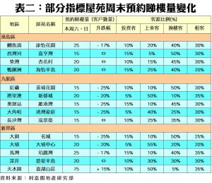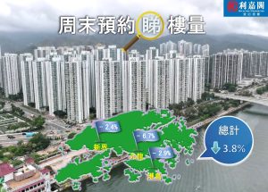 利嘉閣地產研究部主管陳海潮表示,雖然近日風雨飄搖,影響市民外出意欲,但仍未阻礙發展商推盤步伐,並積極開放示範單位吸引買家停駐,僅存的二手客源被大手攤薄,二手屋苑未能殺出重圍,50指標屋苑預約睇樓人數跌勢持續。根據利嘉閣地產研究部數據估算,全港50個指標屋苑共錄1,135組客戶於周末預約睇樓,較上周的1,180組跌3.8%,連跌4星期,創近9個周末新低。