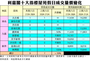 《利嘉閣十大指標屋苑假日二手實況》 一手新盤市場熾熱 二手交投窄幅上落 周末十大屋苑錄9宗買賣 按周增加29%