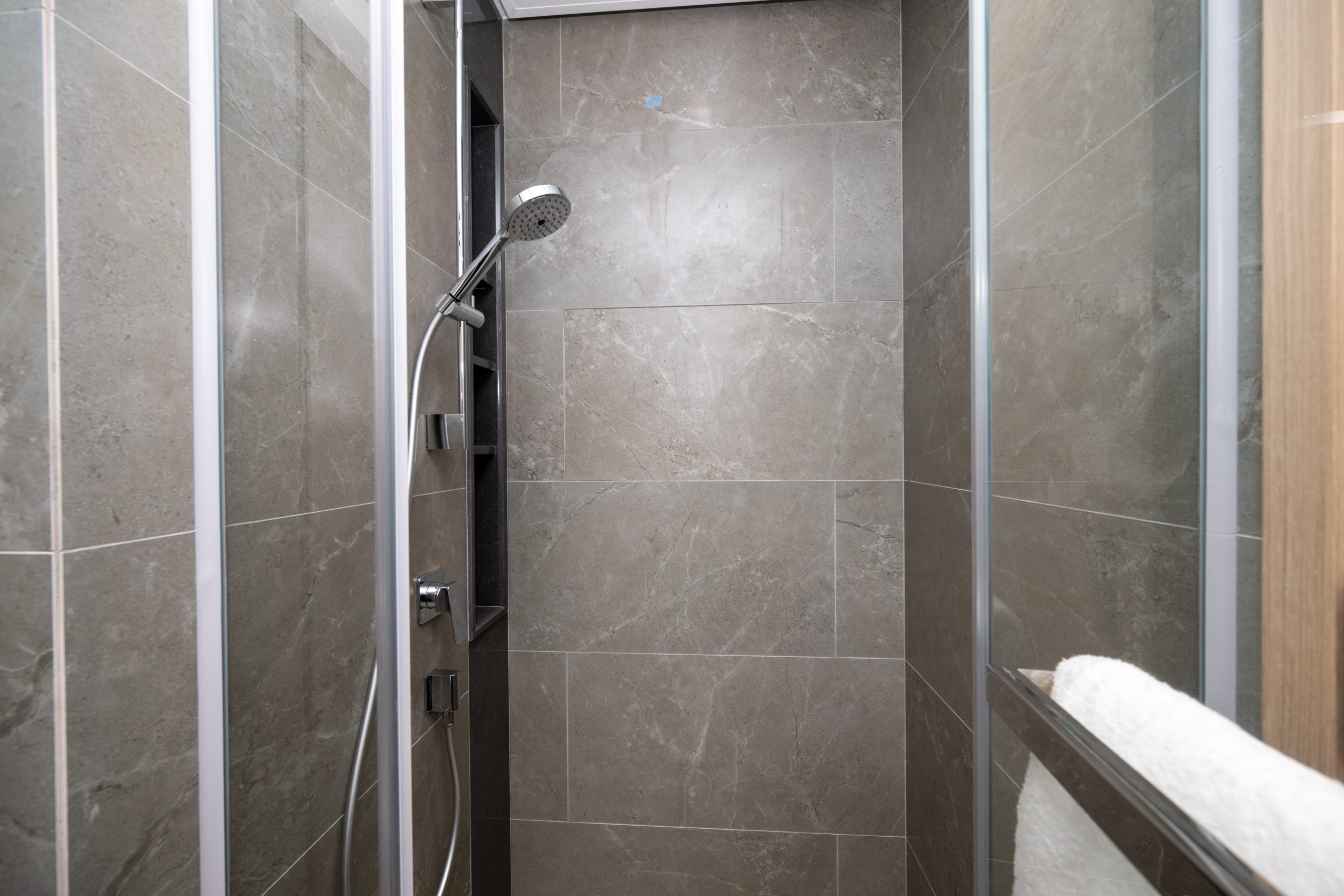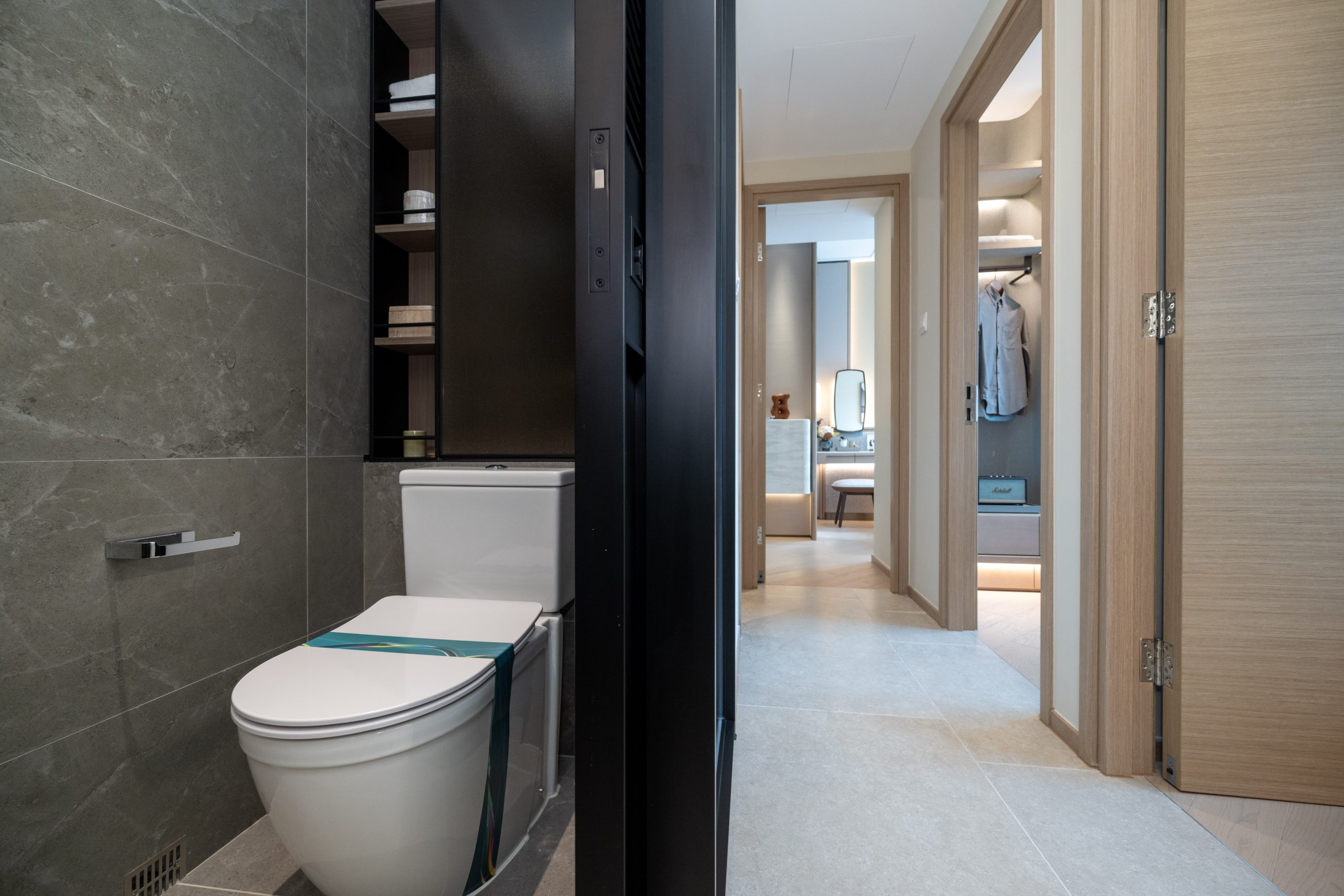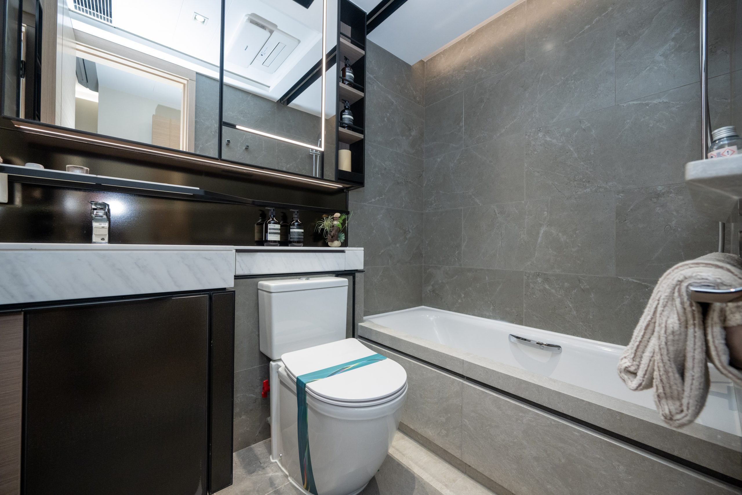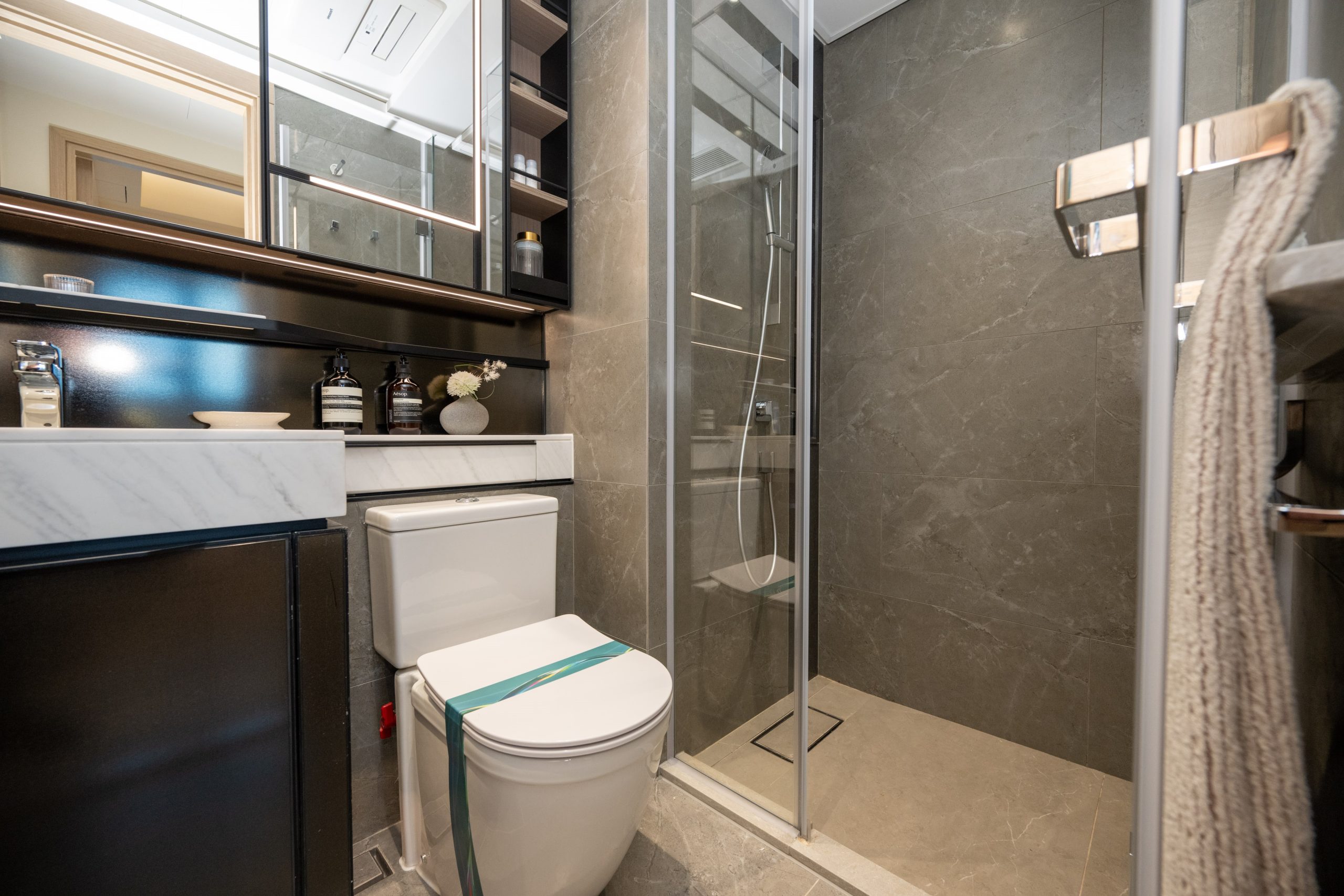 浴室設計配合全屋色調,牆身及地板以色調型格的雲石紋瓷磚鋪砌而成,配以淺色調的雲石紋理洗手盆檯面,帶出簡約時尚風格。浴室設有三件頭浴室配備,配備淋浴間、洗手盆及坐廁,更配備Panasonic浴室寶,設備齊全。單位更設有獨立的化妝間,配以坐廁及雲石紋理洗手盆檯面,兩旁放置的鏡櫃及置物櫃為住戶提供收納空間。